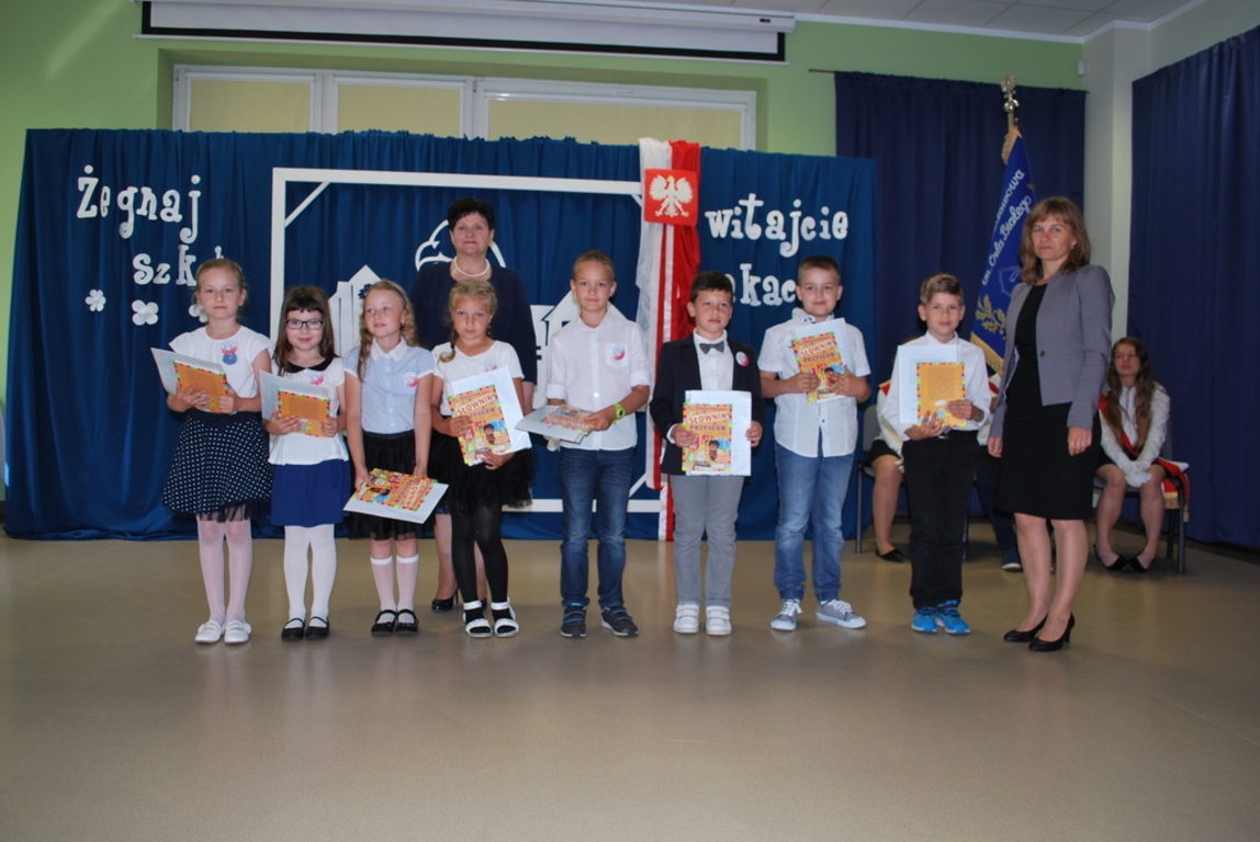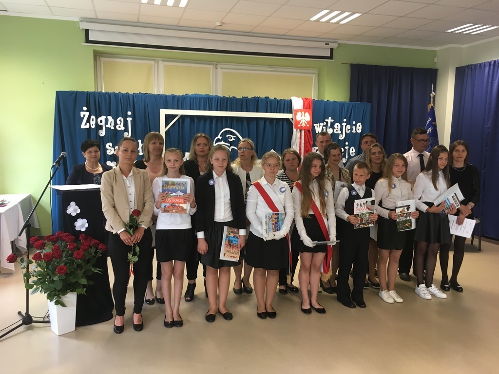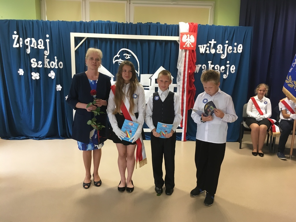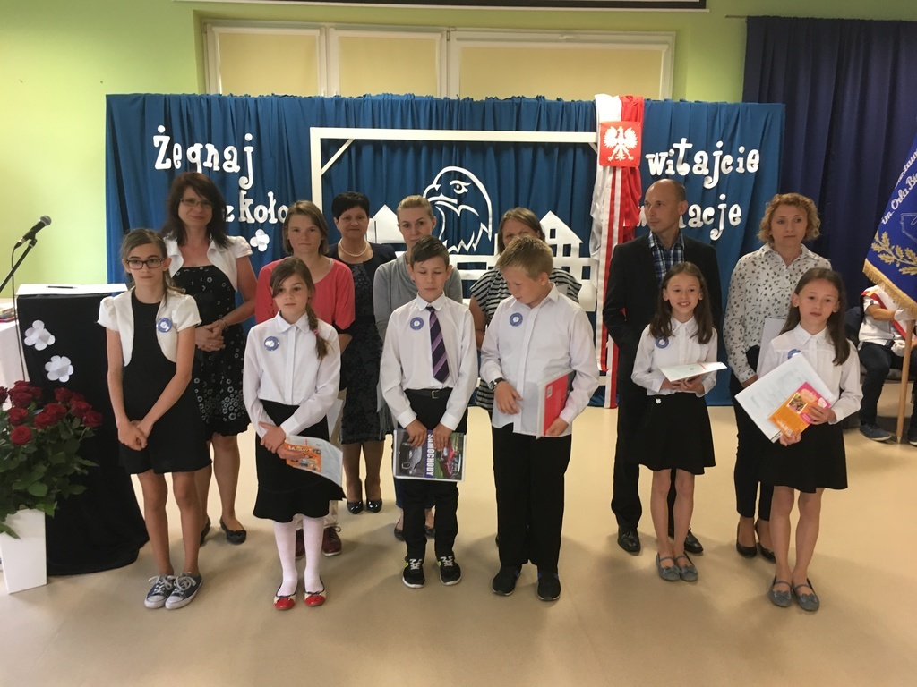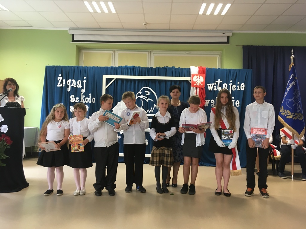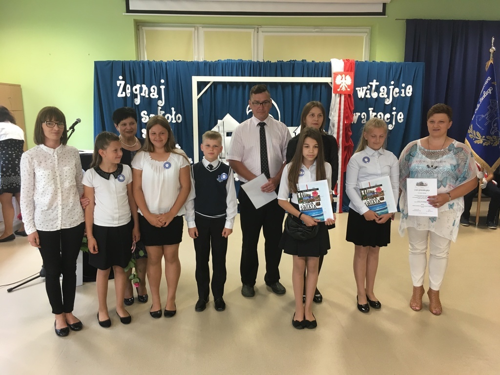 23 czerwca odbyła się uroczystść zakończenia roku szkolnego 2016/2017, poprzedzona mszą świętą w kościele parafilanym. Było to wyjatkowe zakończenie, na co zwróciła uwagę w przemówieniu Pani Dyrektor Danuta Jagodzińska podkręlając, iż w tym roku nie żegnamy absolwentów, gdyż szóstoklaściści pozostaną w murach naszej szkoły. Po wręczeniu świadectw z wyróżnieniem oraz odznak wzrorowego ucznia dzieciom z klas I-III, wręczono świadectwa z czerwonobiałym paskiem najlepszym uczniom z klas IV-VI oraz złote i srebrne odznaki, a także listy gratulacyjne dla rodziców. Nie zabrakło nagród dla najbardziej zasłużonych w dziedzinie matematyki, muzyki, plastyki, religii oraz dla sportowców. Wyróżniono także uczniów ze 100% frekwencją oraz odznaczających się wysoką, a wręcz wzorową kulturą osobistą. Doceniono także niezwykłe zacięcie czytelnicze. Zaś uczniowie, którzy cały rok pilnie pracowali na pierwsze w swym życiu uprawnienia do poruszania się po drogach publicznych otrzymali karty rowerowe. Część artystyczną umilii nam nasi mali instrumentaliści Aleksandra Wieczorek, Gabriela Salitra, Nastazja Każmierczak-Śróda, Iga Dyczkowska. Całość zakończył występ dzieci z klas I-VI, przygotowany we wspólpracy Pań Alicji Andrzejczak-Bieli, Katarzyny Chudzickiej-Budnej, Patrycji Schneider, Alicji Forysiak i Renaty Wrzeszcz. Wszystkim życzymy zasłużonego wakacyjnego wypoczynku!