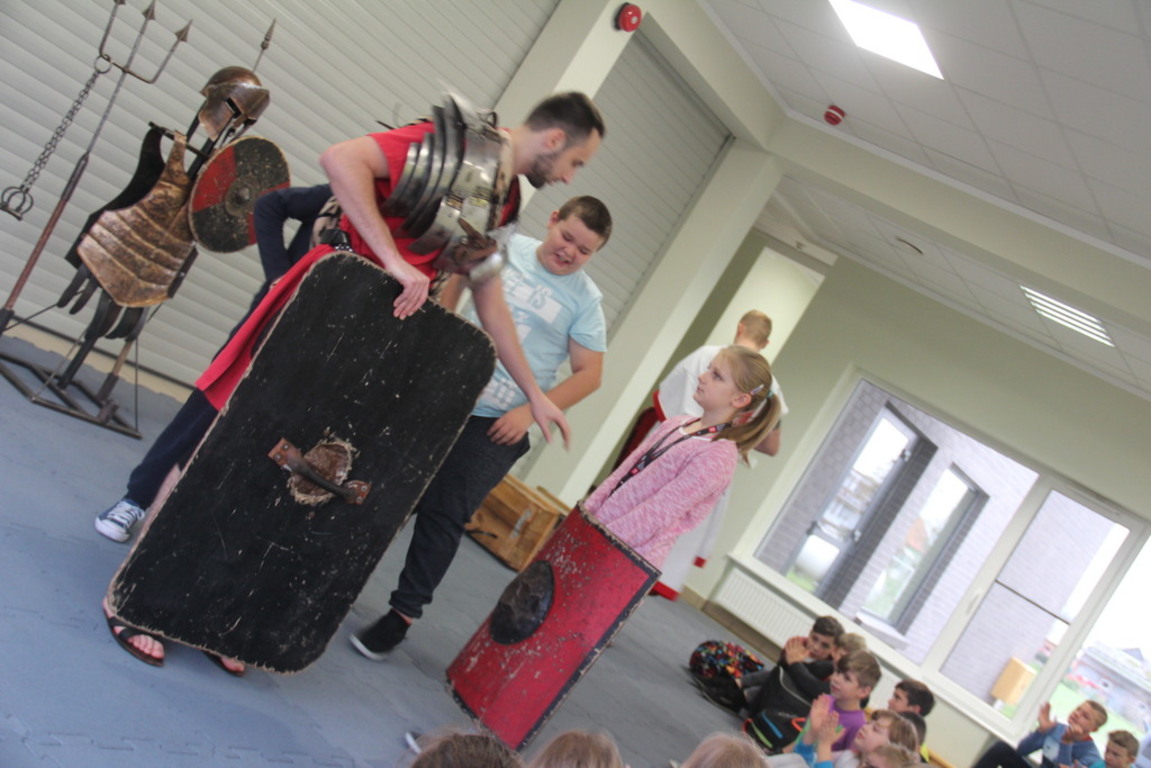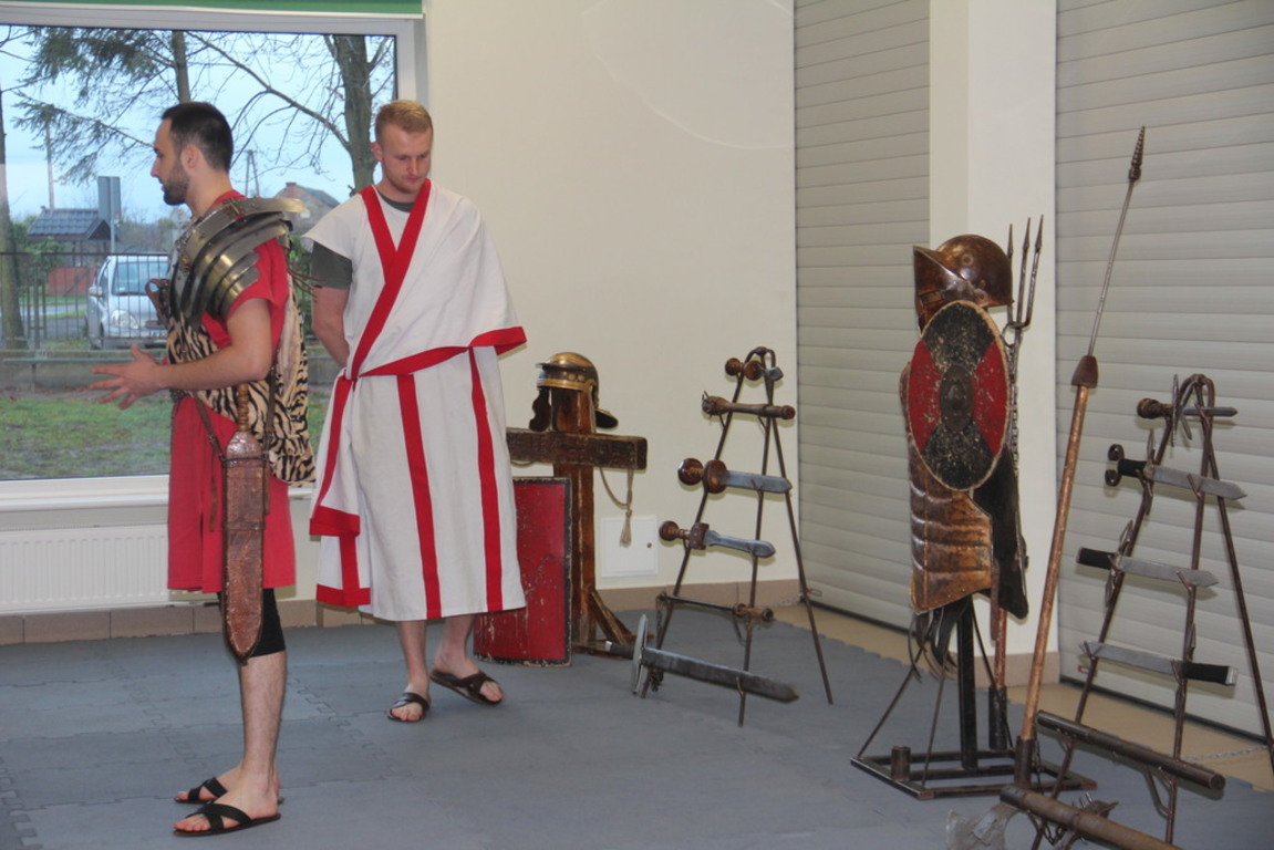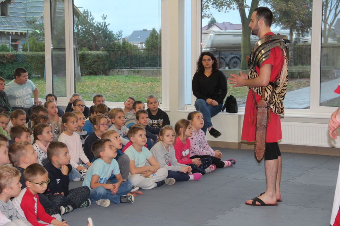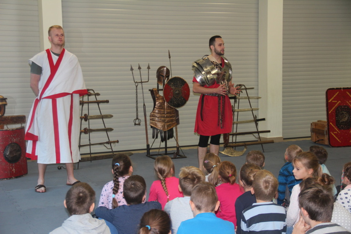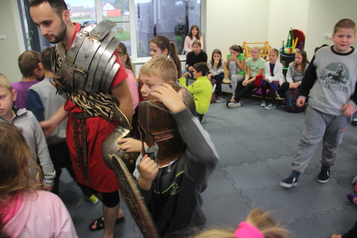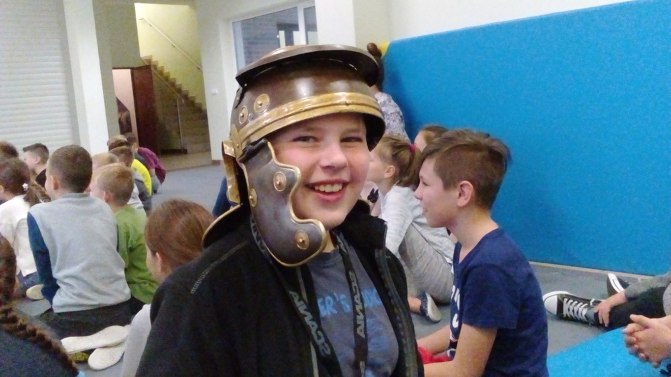 Spotkanie z grupą rekonstrukcji historycznej z Lublina, która przybliżyła czasy starożtnego Rzymu. Poznaliśmy legendę powstania wiecznego miasta. Przybliżono nam codzienność z jaką spotykali sie ludzie tamtych czasów, sposób ubierania się, oręża wojennego i taktyk jakimi posługiwali się,aby pokonać wroga, czyli barbarzyńców.
