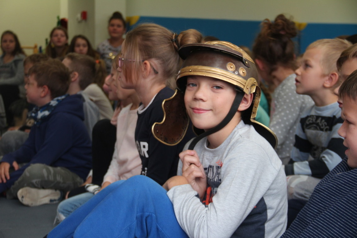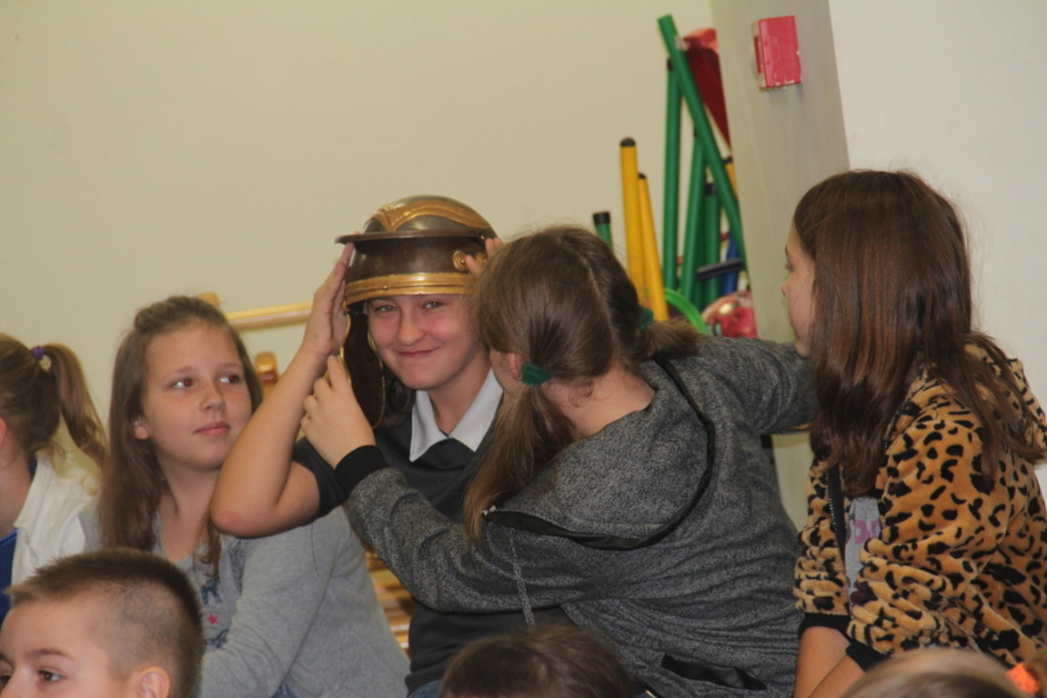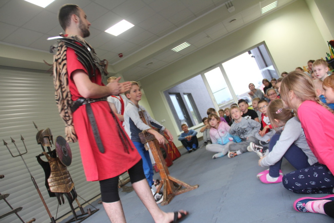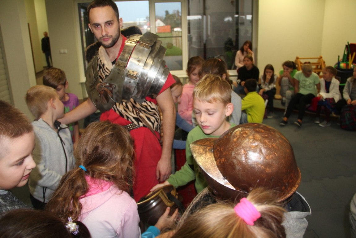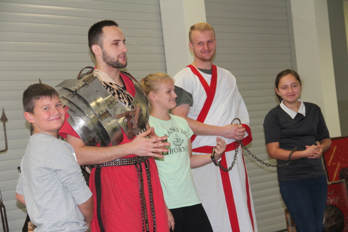 Spotkanie z grupą rekonstrukcji historycznej z Lublina, która przybliżyła czasy starożtnego Rzymu. Poznaliśmy legendę powstania wiecznego miasta. Przybliżono nam codzienność z jaką spotykali sie ludzie tamtych czasów, sposób ubierania się, oręża wojennego i taktyk jakimi posługiwali się,aby pokonać wroga, czyli barbarzyńców.