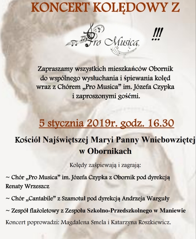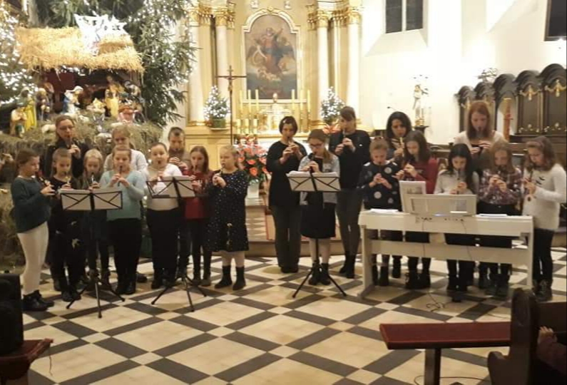 W sobotę 05.01.2019 roku, na zaproszenie Renaty Wrzeszcz dyrygenta chóru Pro Musica im. Józefa Czypka z Obornik, nasz zespół Flażoletowy wziął udział w pięknym Koncercie Kolędowym. Koncert odbył się w kościele Najświętszej Marii Panny w Obornikach. Wystąpił w nim chór „Cantabile” z Szamotuł, „Pro Musica” z Obornik i nasze flażolety wzbogacone personalnie przez nauczycieli i wychowawców naszej placówki. To była prawdziwa muzyczna uczta, pięknie urozmaicona w miłej atmosferze.