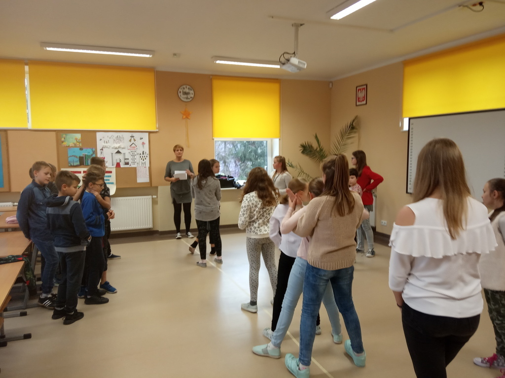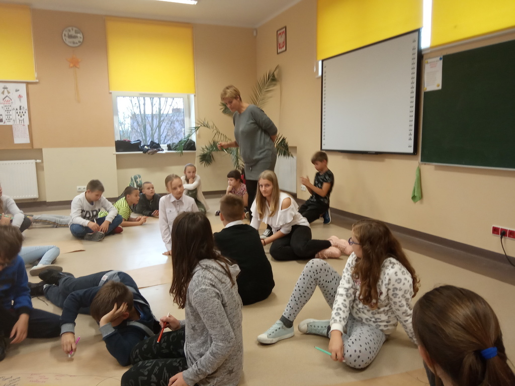Po wizycie w OOK uczestnicy wyjazdu zostali zaproszeni na profesjonalne warsztaty aktorskie zorganizowane w naszej szkole przez panią Dagmarę Gumkowską z Teatru Śląskiego. Podczas nich pani Agnieszka, instruktorka teatralna, zaproponowała dzieciom szereg ćwiczeń związanych z interpretowaniem spektaklu oraz "językiem sceny". Młodzi aktorzy wcielali się w role z obejrzanego przedstawienia oraz rozmawiali o własnych zaletach i wadach (czyli "złych nogach").