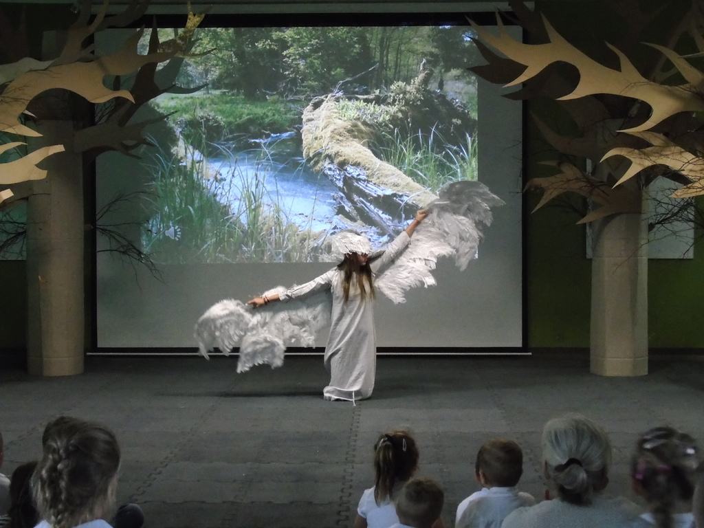 Na naszych oczach orzeł (grany przez uczennicę klasy VIII) wspomagany przez dobre duchy dziejów (pierwszo- i drugoklasistów) wił gniazdo w lasach otaczających Maniewo. Królewski ptak szybował po niebie w rytm melodii hymnu szkoły nuconego i granego na flażolecie. Gdy do utworu wdarły się fałszywe dźwięki, sceną zawładnęły chochliki historii, które zburzyły gniazdo. Rozpacz pokonanego orła potęgowały dźwięki bum bum rurek, które ostatecznie wskrzesiły dawną potęgę dostojnego ptaka. W odbudowanym gnieździe, przy akompaniamencie pianina, zatańczyły dzieci z białymi i czerwonymi szarfami. Gdy ułożyły z nich flagę Polski, wniesiono makietę szkoły, a wszyscy zebrani odśpiewali uroczyście hymn szkoły.