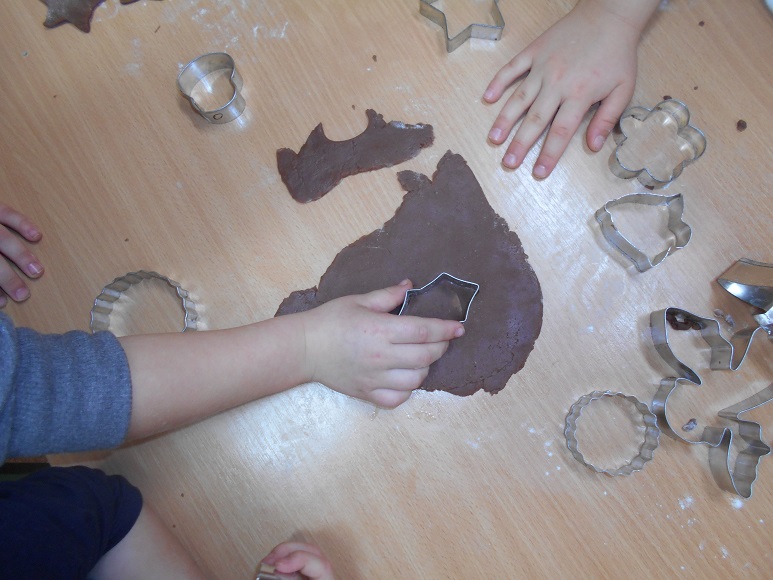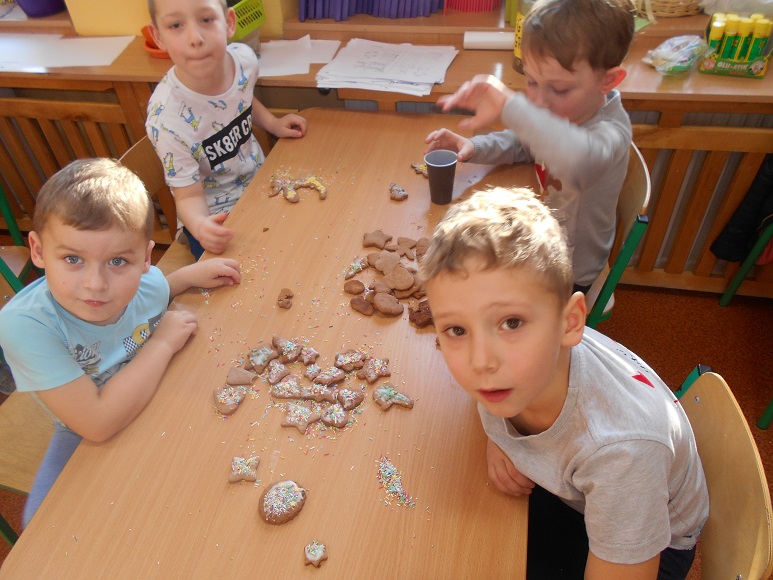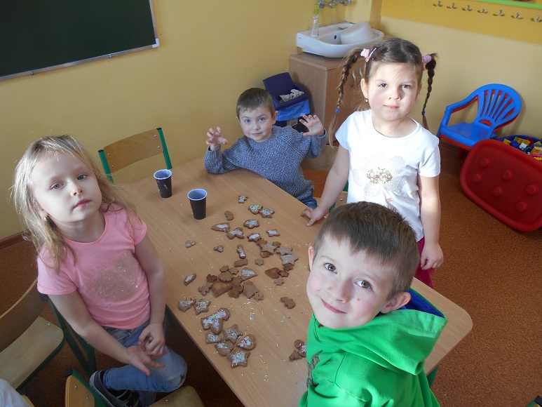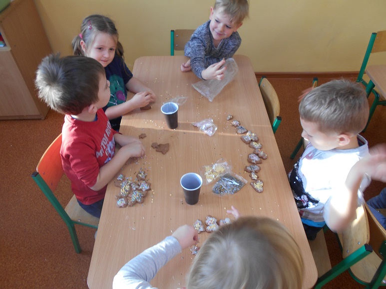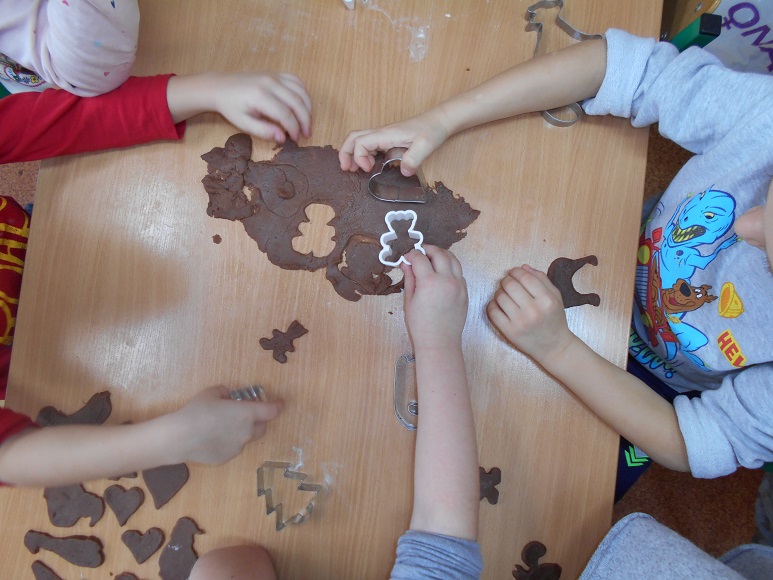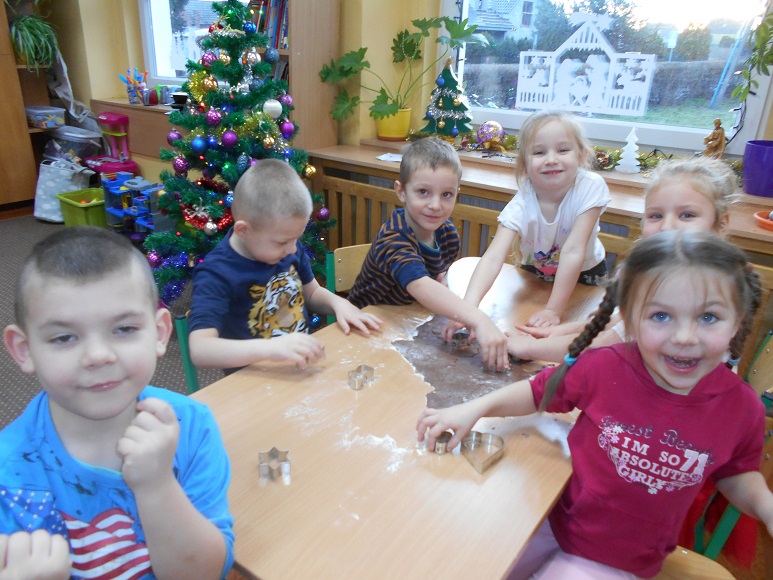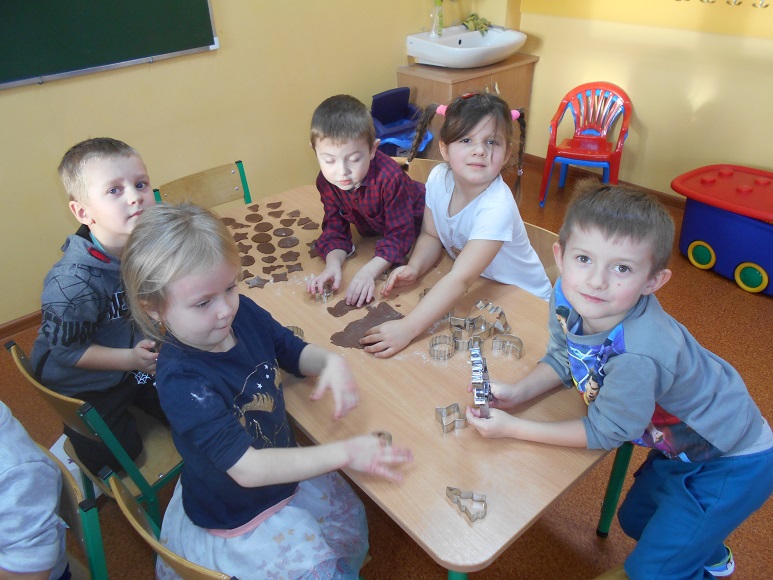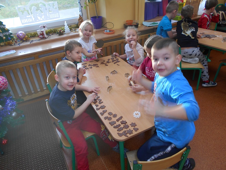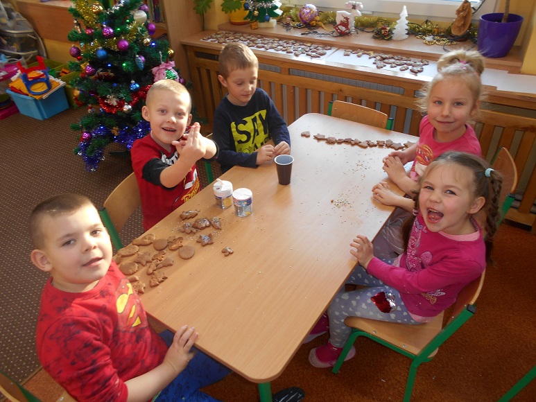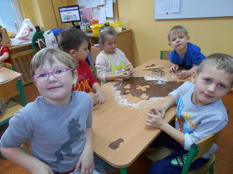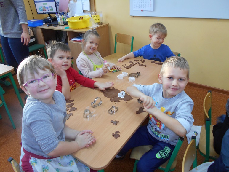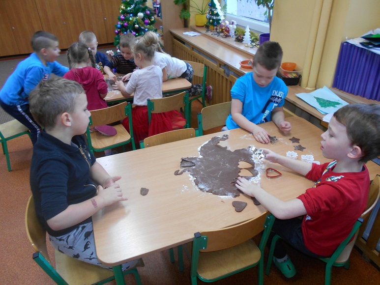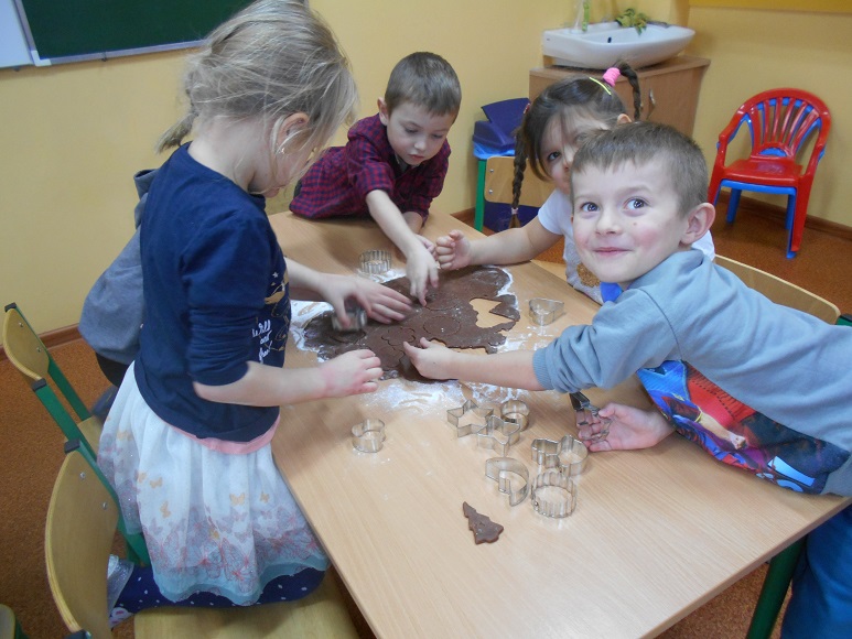 W trzecim tygodniu grudnia 5- latki razem z panią Darią zabrały się za świąteczne pierniki. Przygotowanie szło sprawnie i bez trudu. Przedszkolaki mieszały, wygniatały i wałkowały ciasto według przygotowanych przepisów. Wszystkim podobało się wykrawanie kształtów przy pomocy foremek. Następnie słodkie pierniczki piekły się w przedszkolnej kuchni. Po całym przedszkolu zaczął unosić się wspaniały zapach, który wprawił wszystkich w świąteczny nastrój. Gdy pierniki były już gotowe dzieci przystąpiły do ich dekorowania pisakami i kolorowymi posypkami.