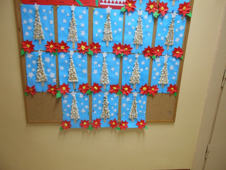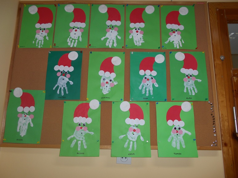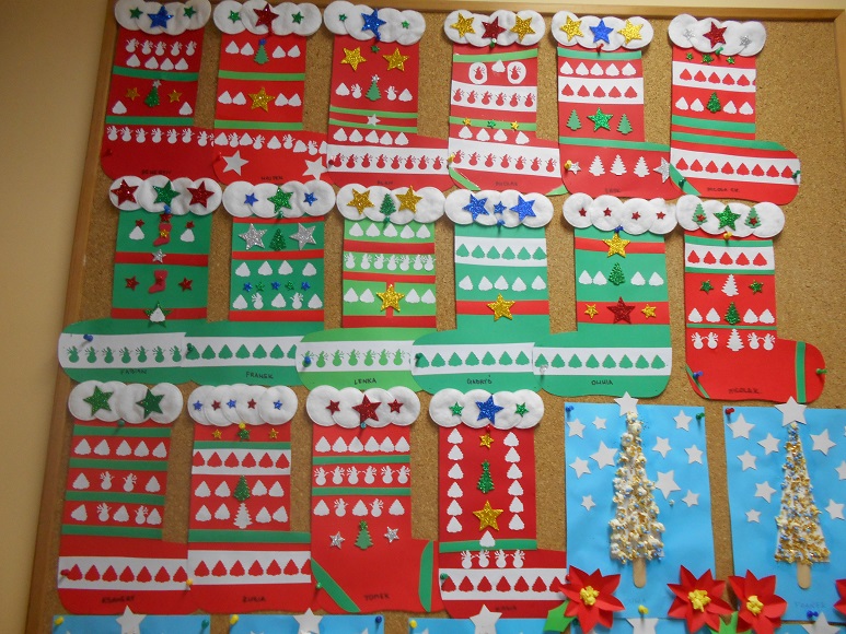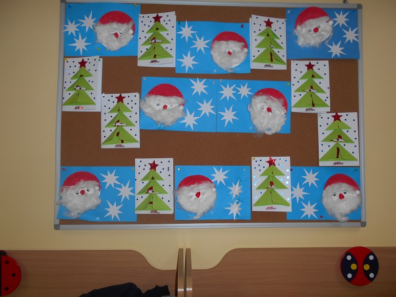 Święta to wyjątkowy czas, który dostarcza nam wielu pomysłów i stanowi źródło inspiracji dla dzieci. Przedszkolaki posługując się różnymi technikami wykonały prace plastyczne, które można obejrzeć na naszym przedszkolnym korytarzu. Pod okiem pani Darii 5-latki zrobiły choinki z masy solnej i renifery z kolorowego papieru. Z panią Marzenką i panią Kasią pracowały 4-latki, które zrobiły gwiazdorki i skarpety świąteczne z kolorowego papieru, płatków kosmetycznych i farbek. 4-latki wykonały również "popcornowe" choinki, które okazały się świetnym pomysłem, bo można było zjeść co nieco . 3 -latki z panią Gosią wykonały kartki świąteczne oraz gwiazdorki, gdzie wykorzystały papierowe talerzyki, kolorowy papier, farbki i watę.