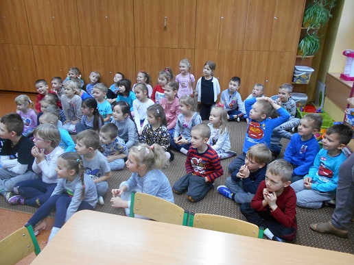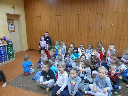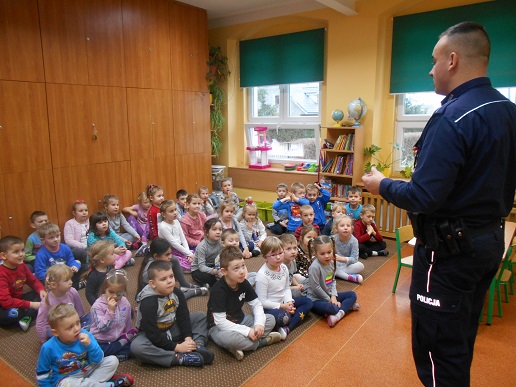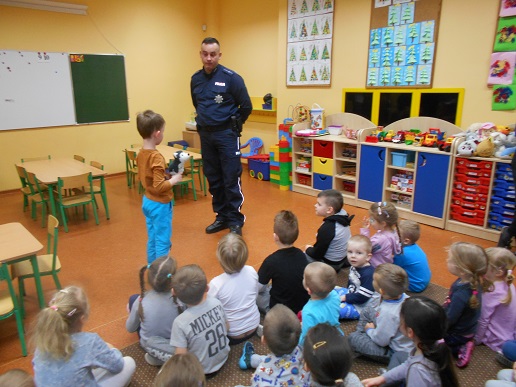 Tuż przed feriami do naszego przedszkola przybył pan policjant. Spotkanie poświęcone było między innymi zasadom bezpiecznego spędzania zimowej przerwy. Nasz gość przypomniał również zasady bezpiecznego poruszania się po drodze oraz zasady ograniczonego zaufania w stosunku do obcych. Dzieci bardzo chętnie uczestniczyły w dyskusji, co świadczy o zainteresowaniu tematem oraz wiedzą jaką już posiadają.
