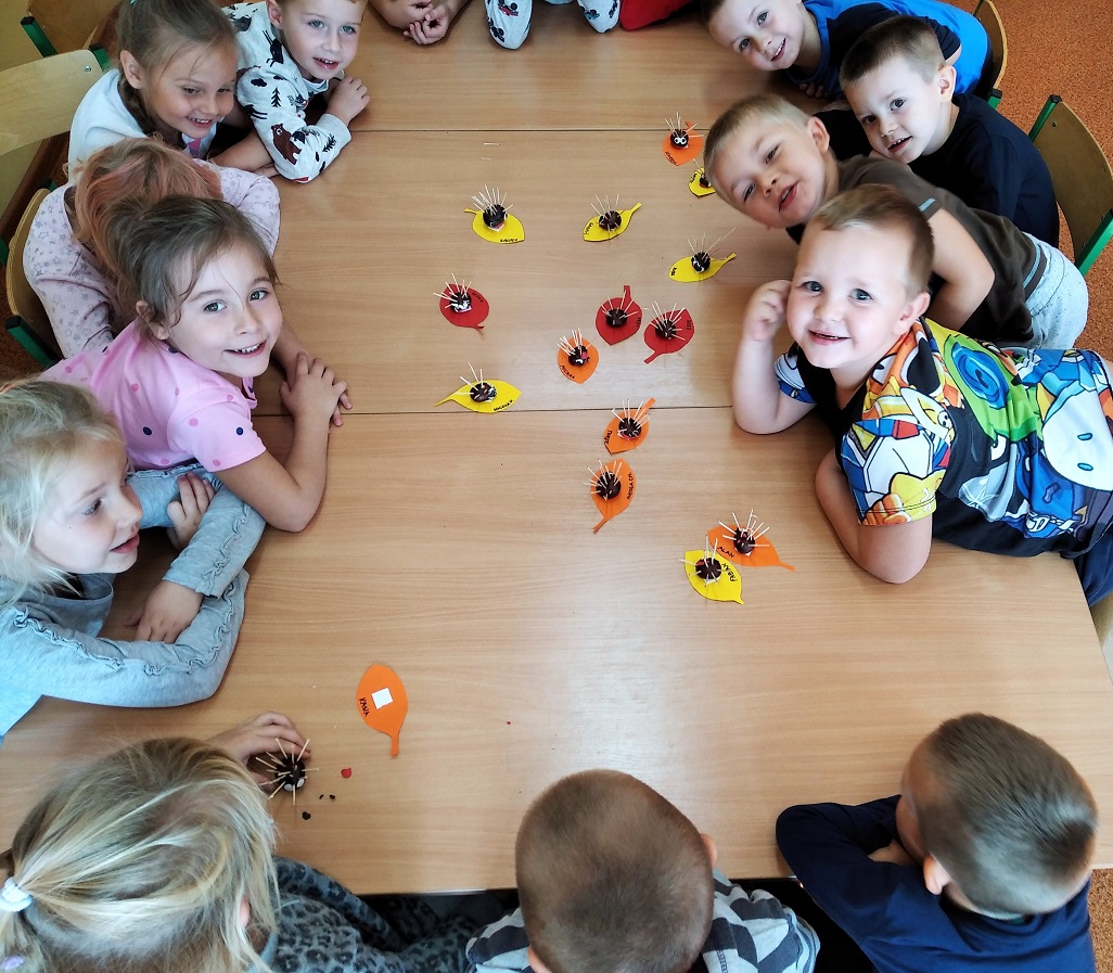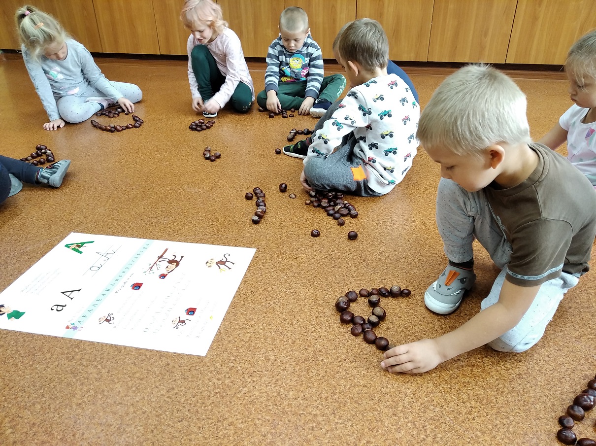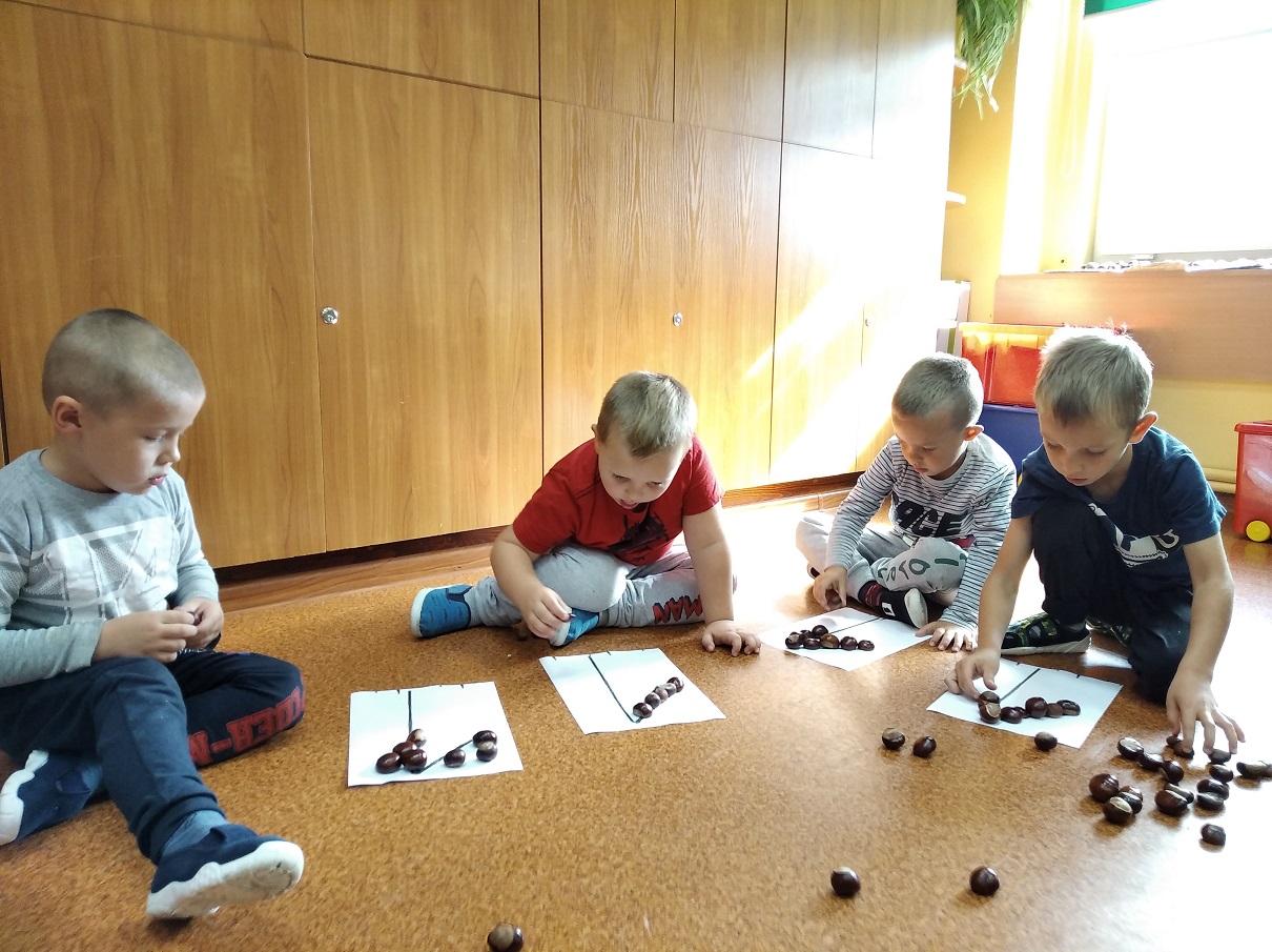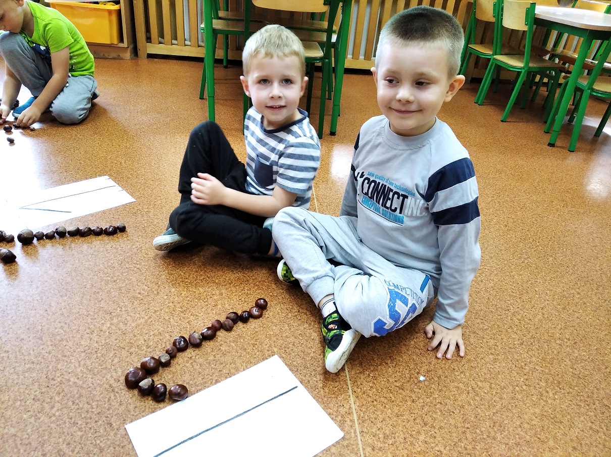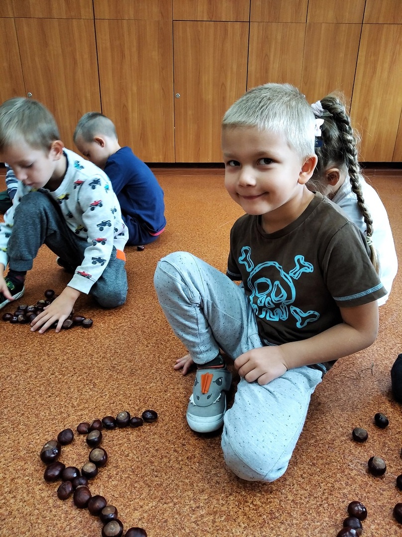 Jesień to znakomita pora na kasztanowe zabawy. Dzieci z grupy 5 – latków przyniosły do przedszkola dość sporą kolekcję . Udowodniliśmy, że kasztany nie muszą nieruchomo leżeć w koszyku, ale można je wykorzystać podczas różnorodnych zabaw. Podczas zajęć przeliczaliśmy, układaliśmy z nich różne wzory według własnych pomysłów oraz instruktażu pani Kasi. Zrobiliśmy jeżyki, ludziki oraz wykorzystaliśmy do nauki liczb i literek.