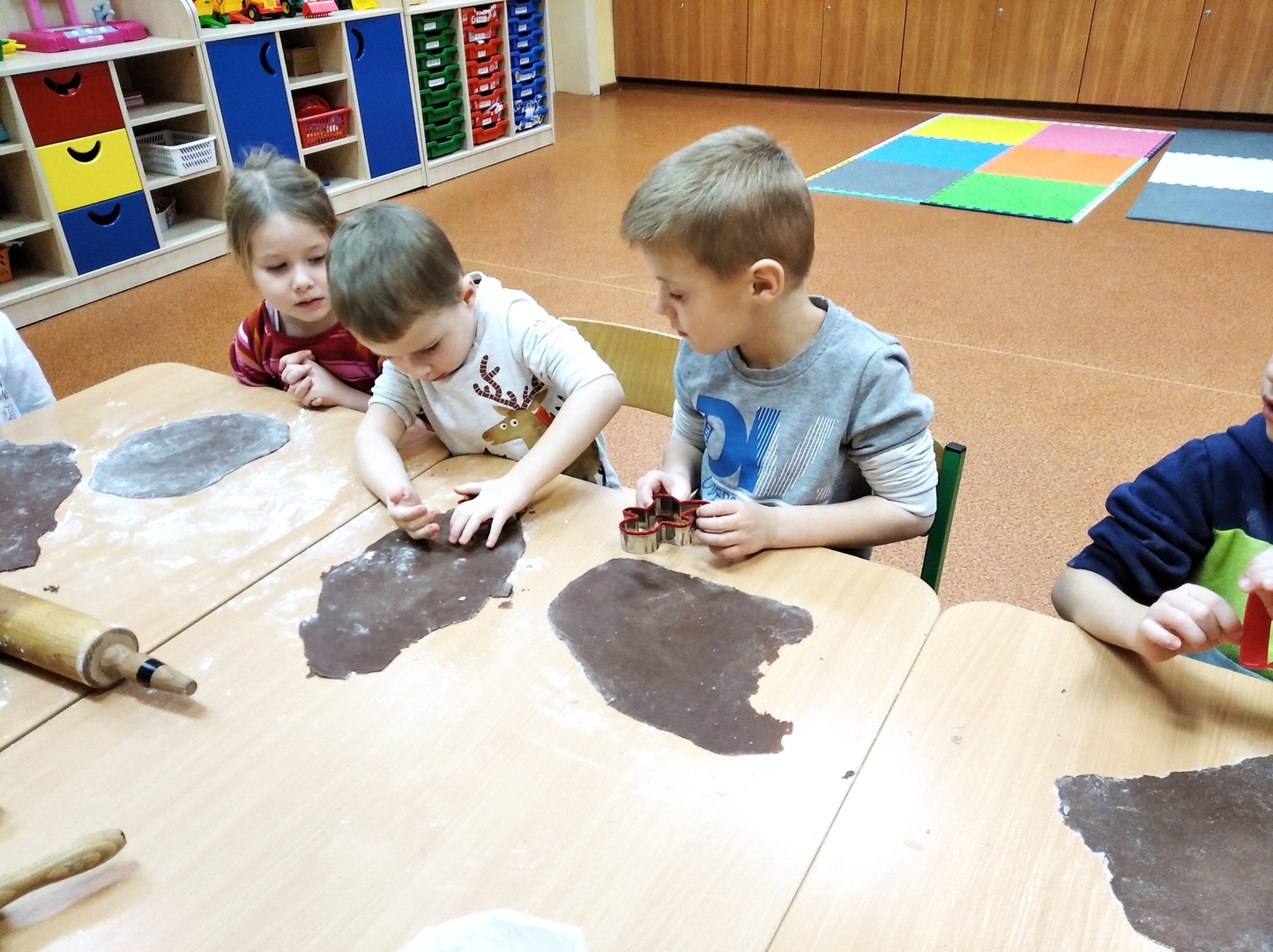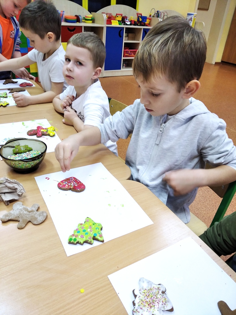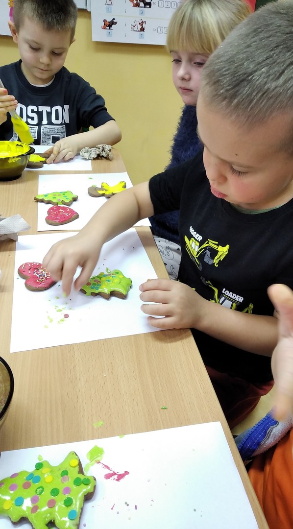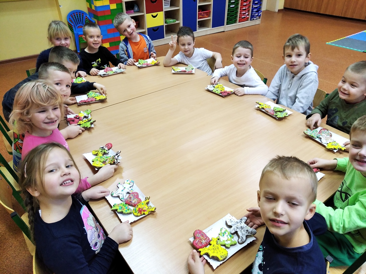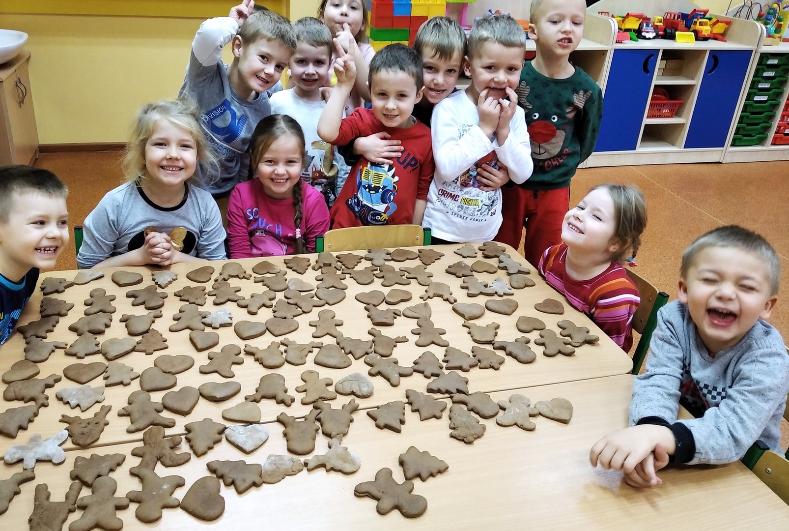 Święta tuż, tuż… czas więc na pieczenie pierników ! 5 -latki z ogromnym zapałem i zaangażowaniem zabrały się do pracy. Na początku poznaliśmy przepis na masę piernikową. Następnie wszystkie produkty zostały przez dzieci dokładnie wymieszane, zagniecione. Nasze ciasto odstawiliśmy do lodówki na 24 h. Kolejnego dnia wałkowaliśmy ciasto i wykrawaliśmy foremkami. Zrobiliśmy ponad 100 pierniczków ! Pod czujnym okiem naszych pań w kuchni, pierniki nabierały koloru piekąc się. Po upieczeniu była oczywiście degustacja. Gotowe ciasteczka udekorowaliśmy kolorowym lukrem i posypką. Każdy wyglądał inaczej, był wyjątkowy i niepowtarzalny.