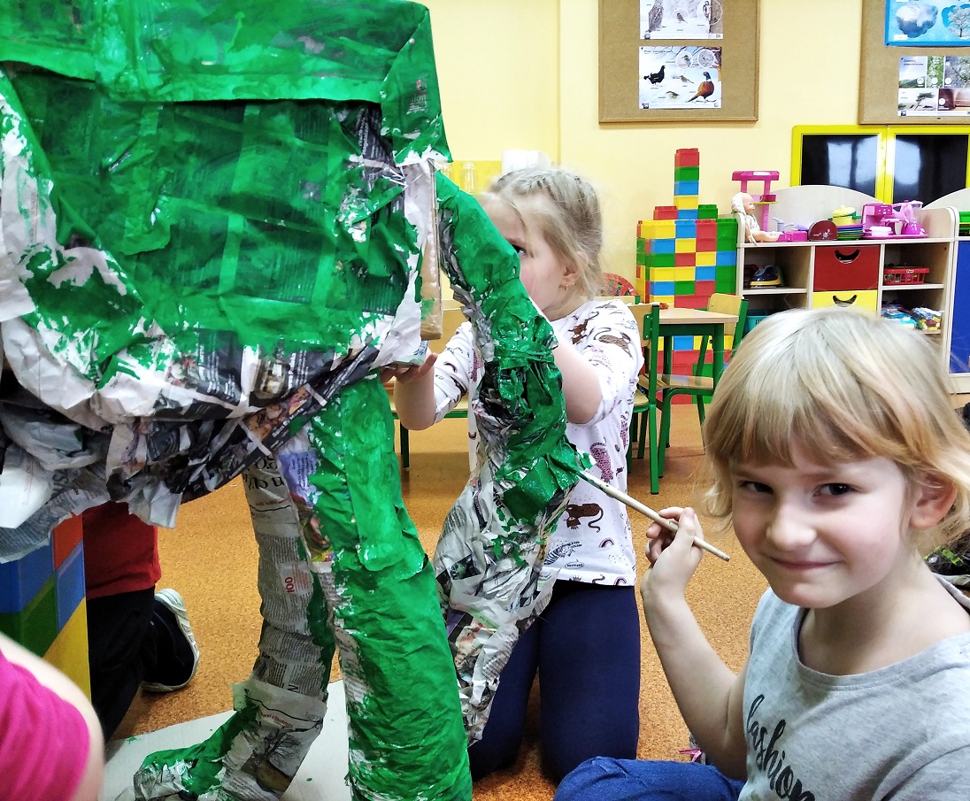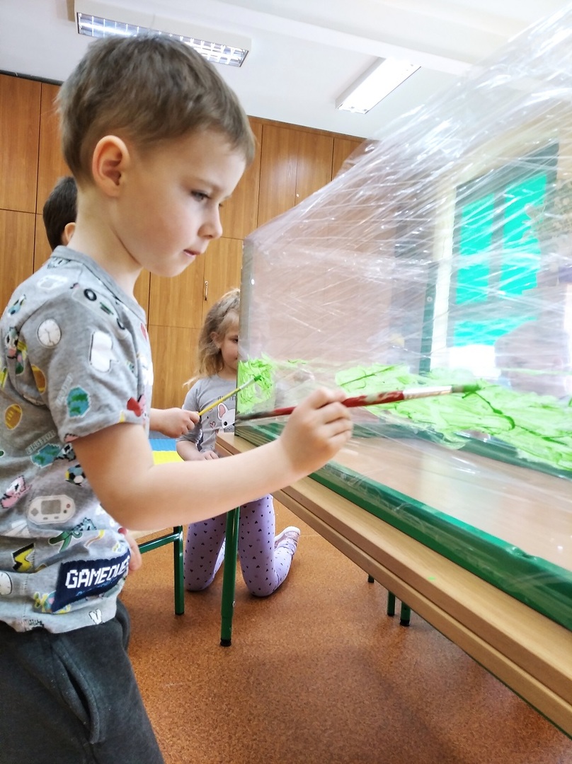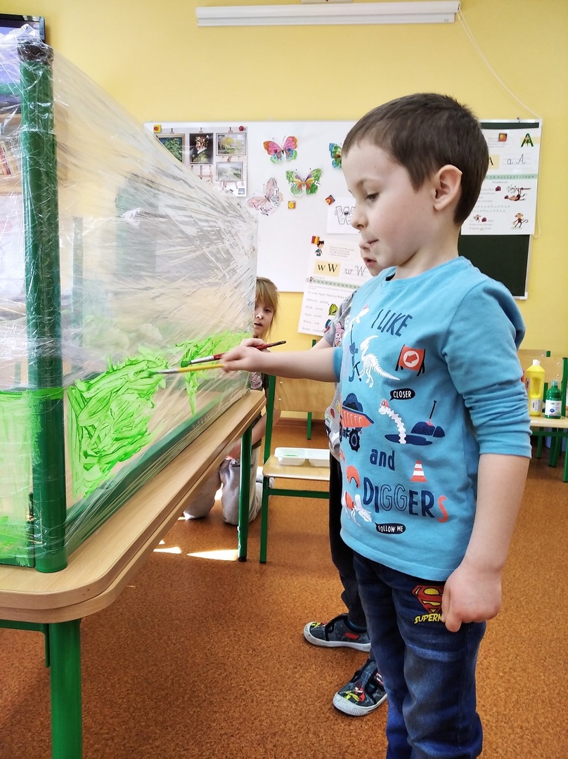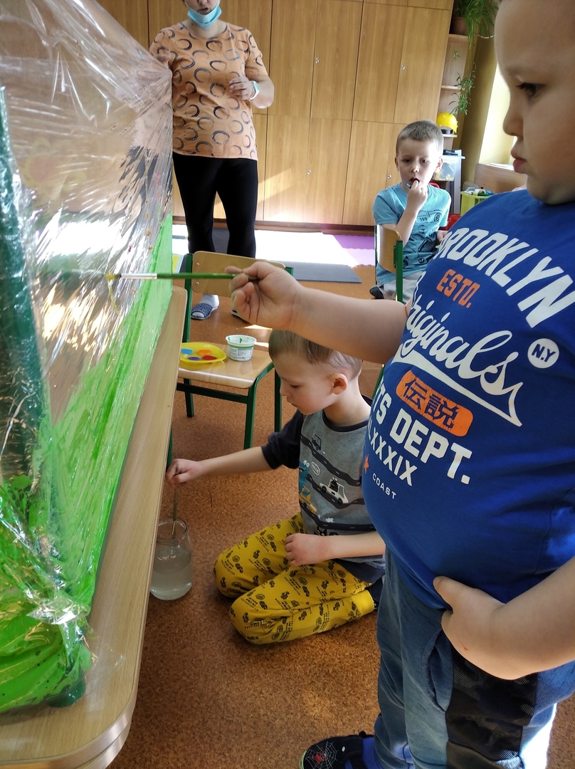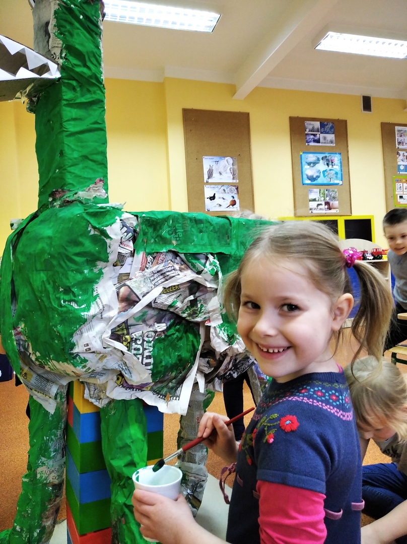 W ostatnich tygodniach grupa 5 - latków poznała tajemnice malarstwa i rzeźby. Porównaliśmy zawód malarza pokojowego z zawodem malarza artysty, któremu przyjrzeliśmy się bliżej. Zapoznaliśmy się z kilkunastoma obrazami wielkich i mniej znanych malarzy. Podczas zajęć dowiedzieliśmy się jakie są podstawowe kolory i tworzyliśmy kolory pochodne. Dzieci stworzyły samodzielnie portrety. Malowaliśmy na folii spożywczej. Poznaliśmy też pracę rzeźbiarza oraz mówiliśmy z czego mogą być wykonane rzeźby. Na koniec powstała nasza wspólna rzeźba – dinozaur !