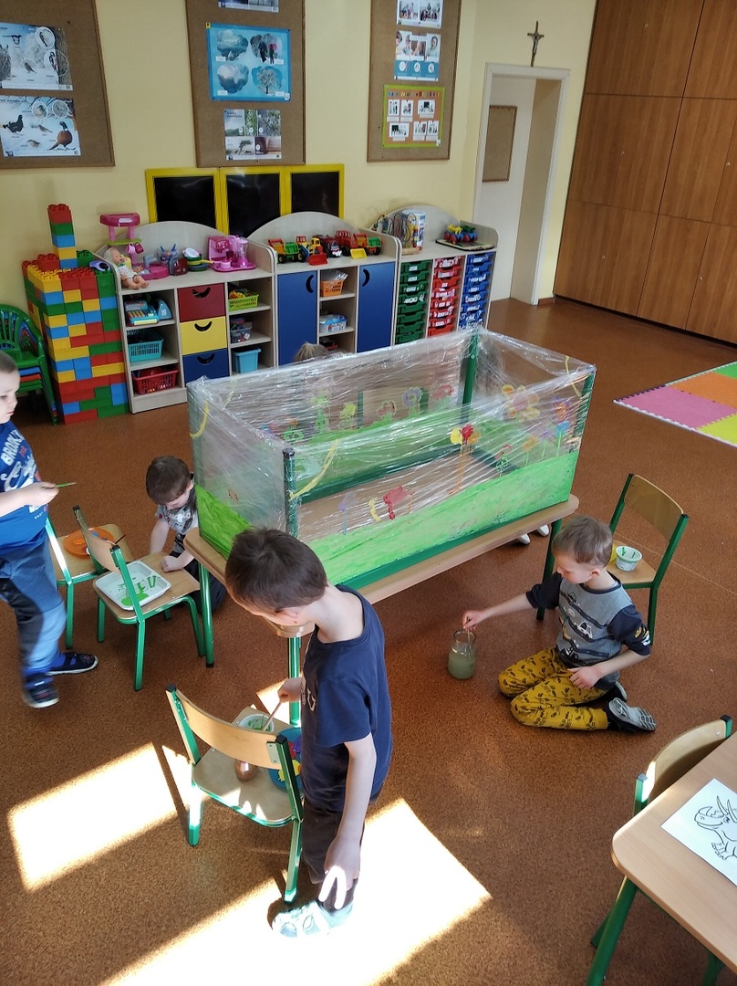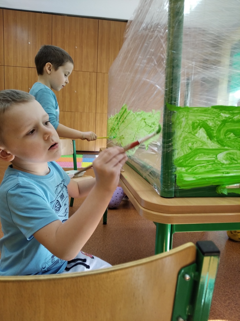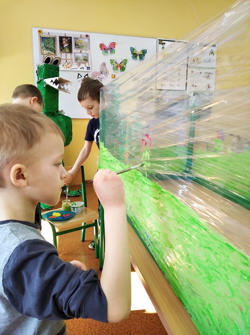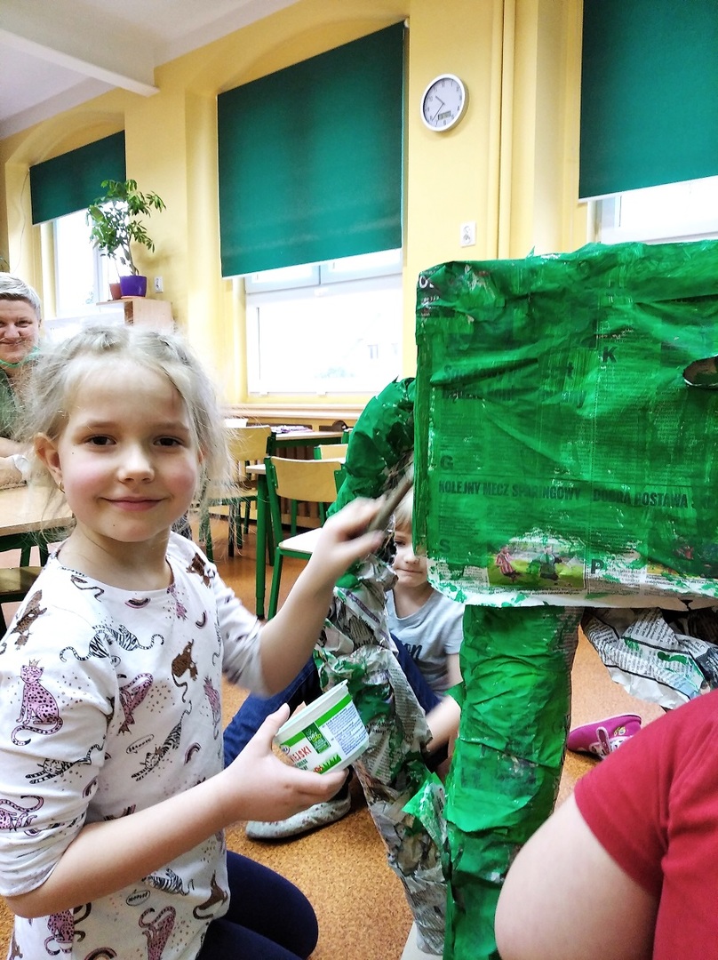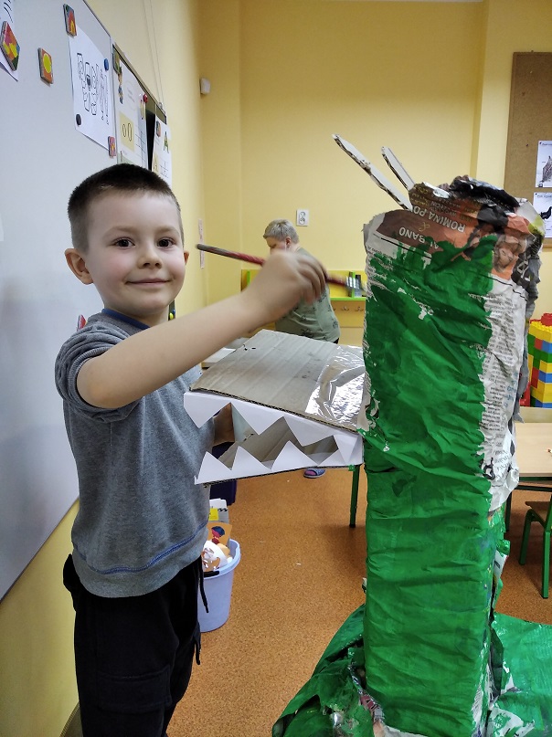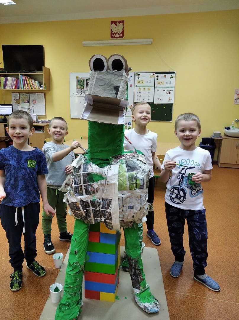 W ostatnich tygodniach grupa 5 - latków poznała tajemnice malarstwa i rzeźby. Porównaliśmy zawód malarza pokojowego z zawodem malarza artysty, któremu przyjrzeliśmy się bliżej. Zapoznaliśmy się z kilkunastoma obrazami wielkich i mniej znanych malarzy. Podczas zajęć dowiedzieliśmy się jakie są podstawowe kolory i tworzyliśmy kolory pochodne. Dzieci stworzyły samodzielnie portrety. Malowaliśmy na folii spożywczej. Poznaliśmy też pracę rzeźbiarza oraz mówiliśmy z czego mogą być wykonane rzeźby. Na koniec powstała nasza wspólna rzeźba – dinozaur !