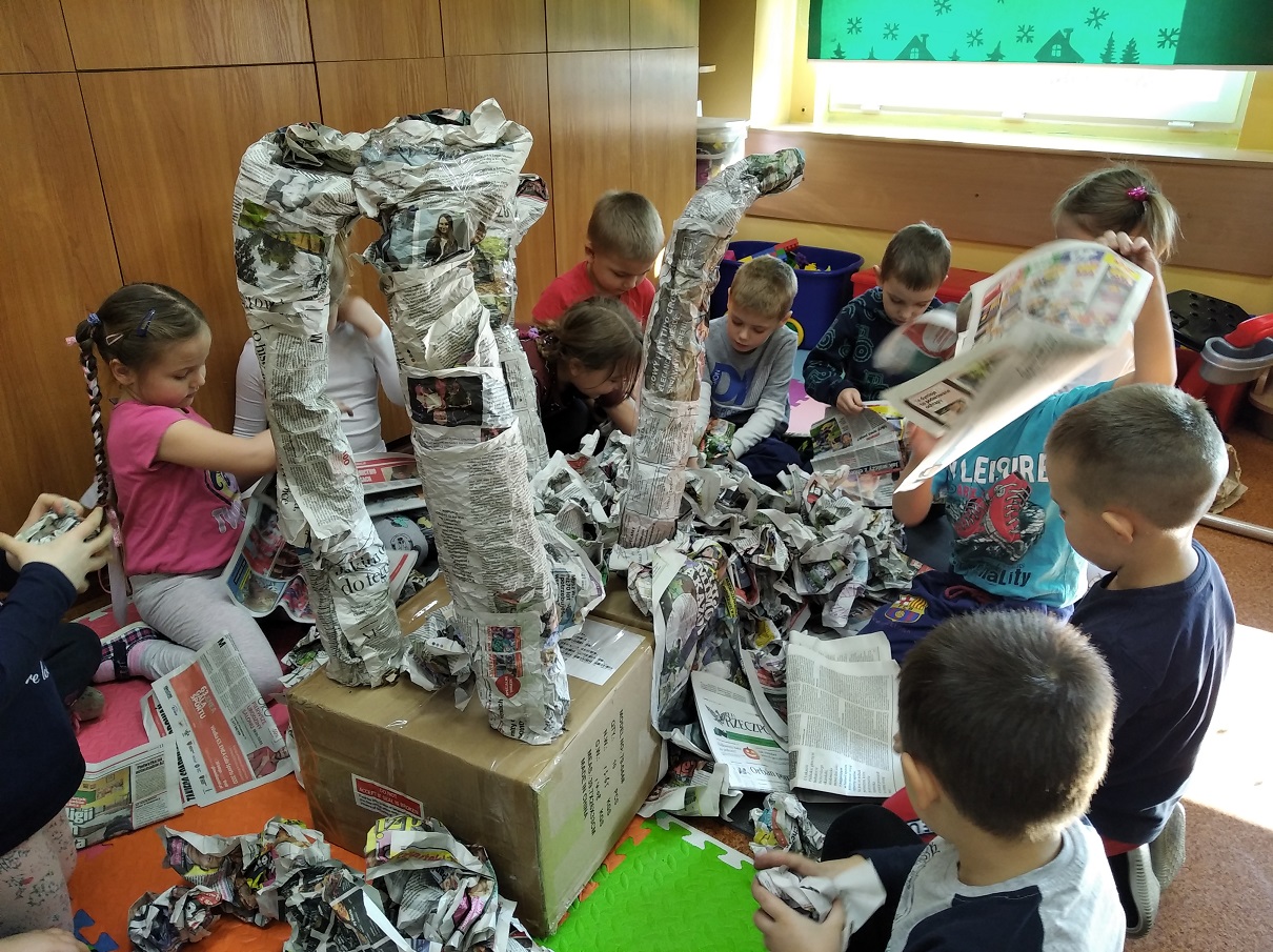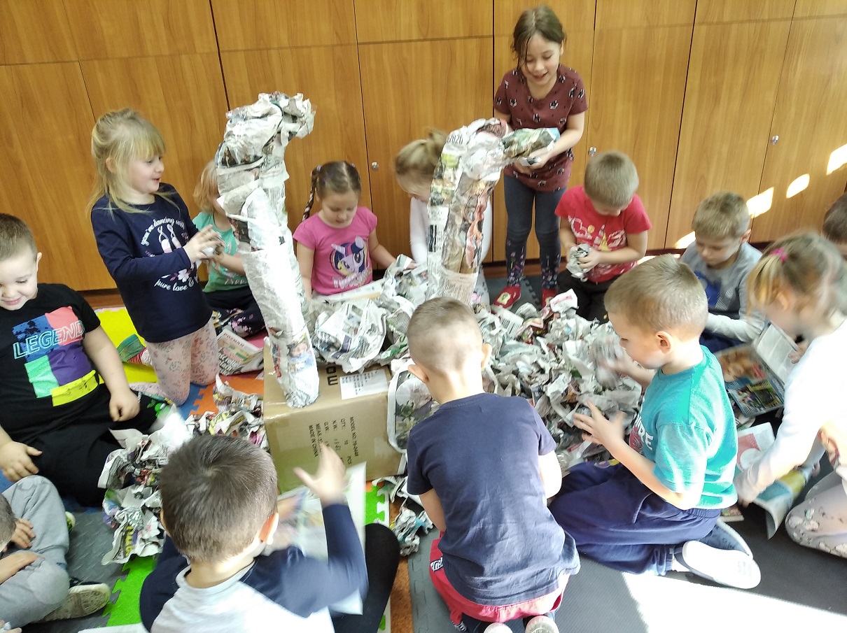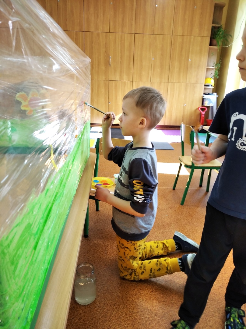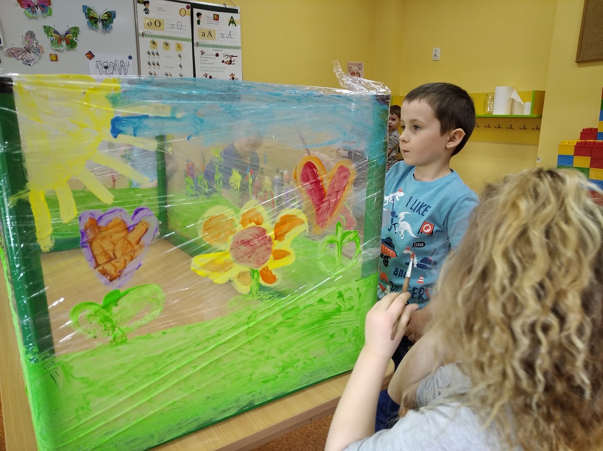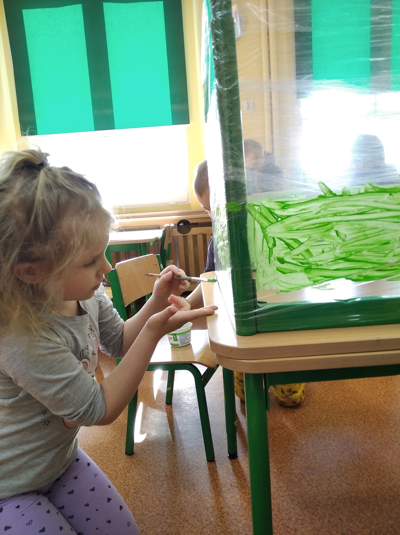 W ostatnich tygodniach grupa 5 - latków poznała tajemnice malarstwa i rzeźby. Porównaliśmy zawód malarza pokojowego z zawodem malarza artysty, któremu przyjrzeliśmy się bliżej. Zapoznaliśmy się z kilkunastoma obrazami wielkich i mniej znanych malarzy. Podczas zajęć dowiedzieliśmy się jakie są podstawowe kolory i tworzyliśmy kolory pochodne. Dzieci stworzyły samodzielnie portrety. Malowaliśmy na folii spożywczej. Poznaliśmy też pracę rzeźbiarza oraz mówiliśmy z czego mogą być wykonane rzeźby. Na koniec powstała nasza wspólna rzeźba – dinozaur !