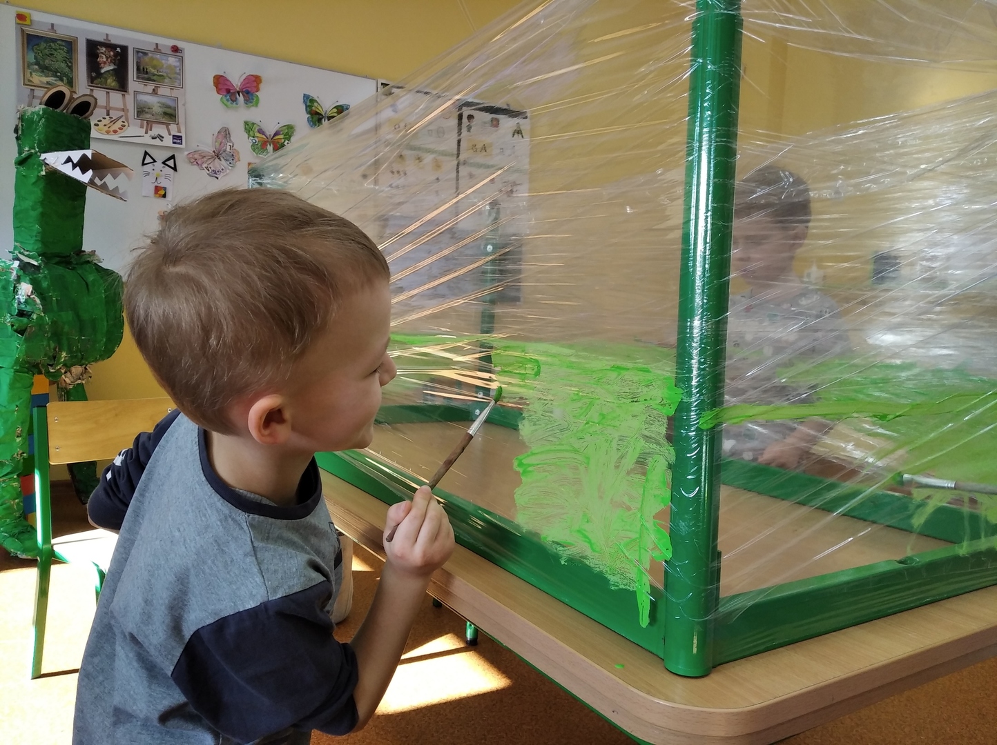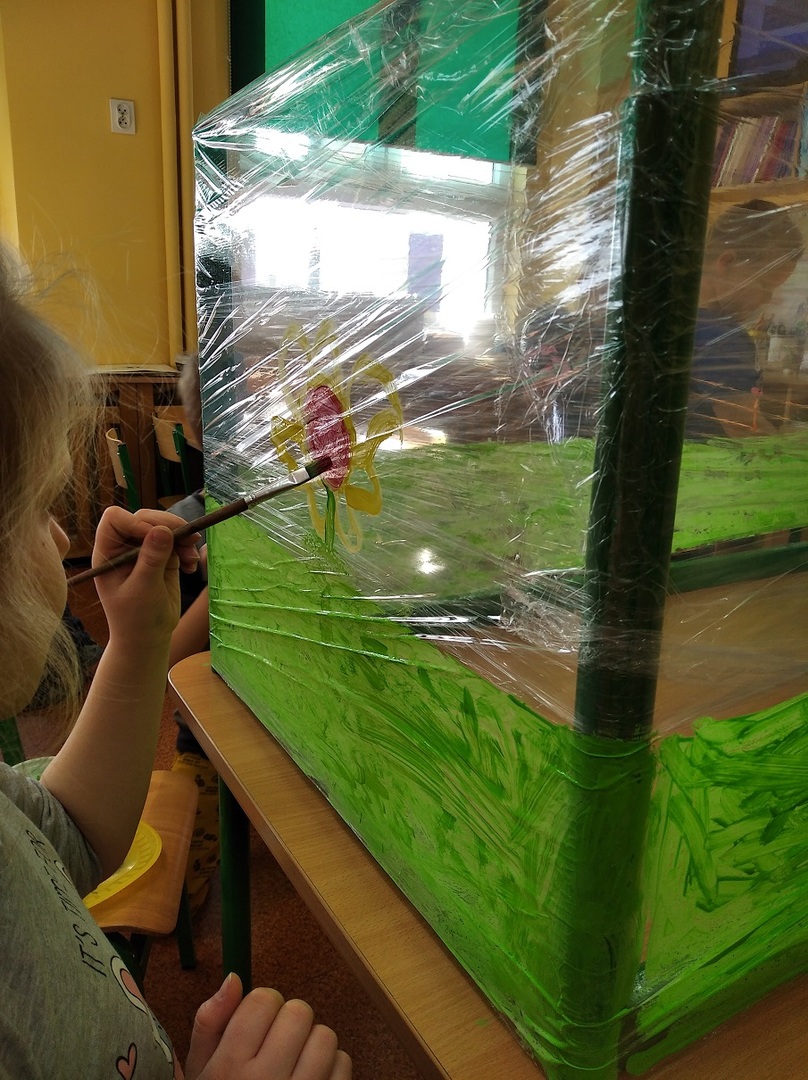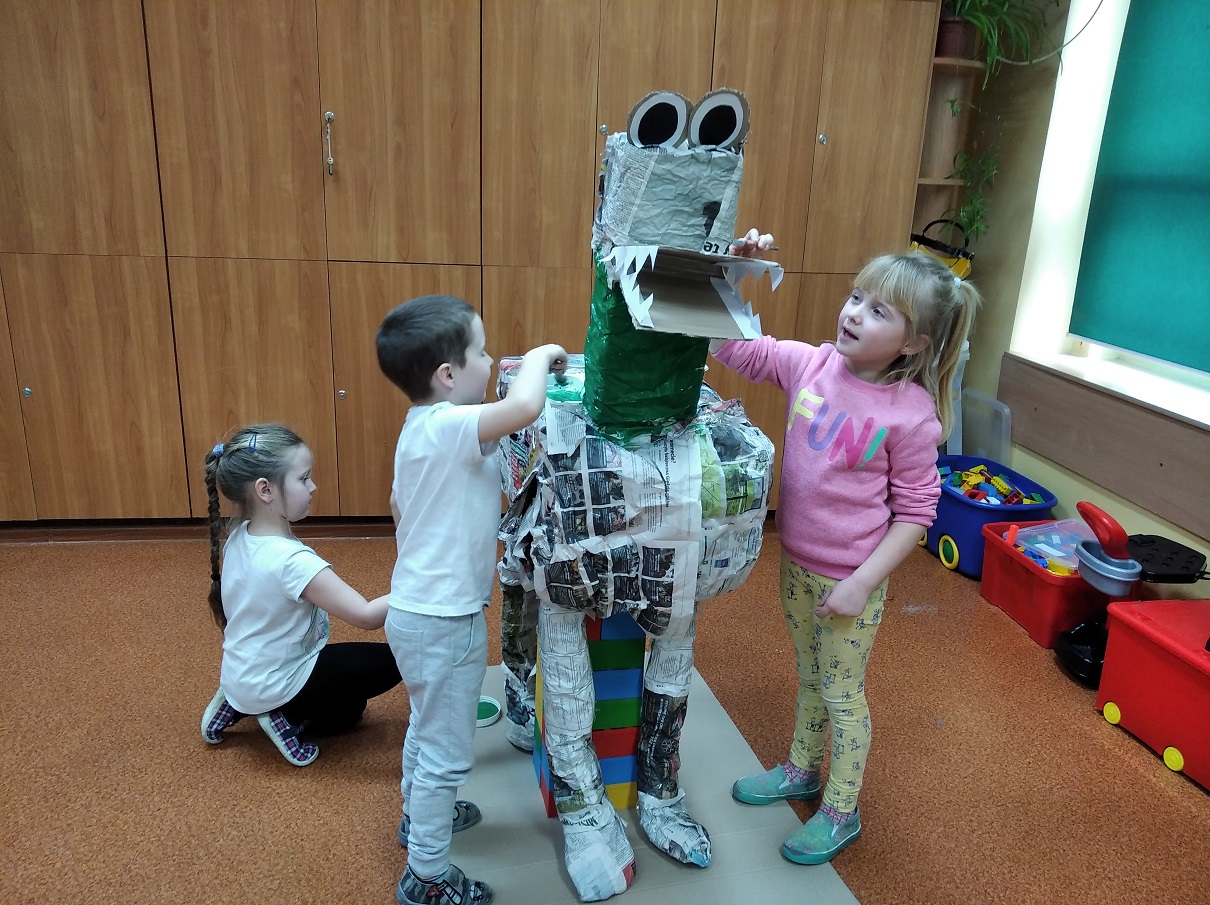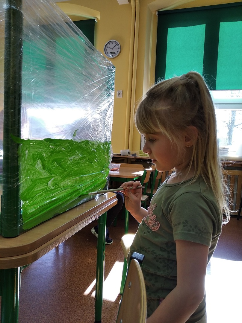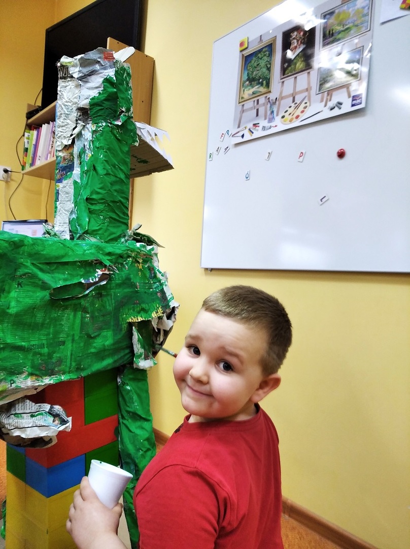 W ostatnich tygodniach grupa 5 - latków poznała tajemnice malarstwa i rzeźby. Porównaliśmy zawód malarza pokojowego z zawodem malarza artysty, któremu przyjrzeliśmy się bliżej. Zapoznaliśmy się z kilkunastoma obrazami wielkich i mniej znanych malarzy. Podczas zajęć dowiedzieliśmy się jakie są podstawowe kolory i tworzyliśmy kolory pochodne. Dzieci stworzyły samodzielnie portrety. Malowaliśmy na folii spożywczej. Poznaliśmy też pracę rzeźbiarza oraz mówiliśmy z czego mogą być wykonane rzeźby. Na koniec powstała nasza wspólna rzeźba – dinozaur !