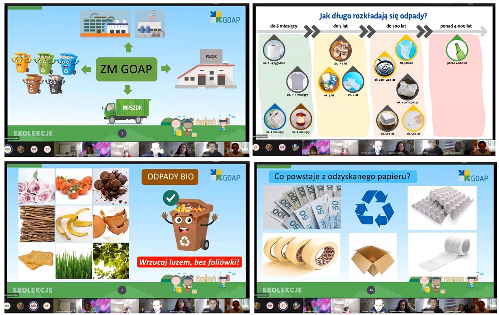 12 kwietnia klasy: pierwsza, druga i trzecia wzięły udział w EKOLEKCJACH prowadzonych przez Związek Międzygminny Gospodarki Odpadami Aglomeracji Poznańskiej tzw. GOAP . Spotkania odbyły się online. Nasi uczniowie mogli pochwalić się własną wiedzą na temat gospodarowania odpadami i śmieciami problemowymi. Przedstawiciel GOAP-u pani Agnieszka Delebris uzupełniła naszą wiedzę, odpowiedziała na nurtujące nas pytania i przedstawiła nam ciekawą prezentację na temat segregacji śmieci. Po tym spotkaniu z pewnością bardziej świadomie dbać będziemy o nasze otoczenie i środowisko naturalne.