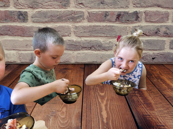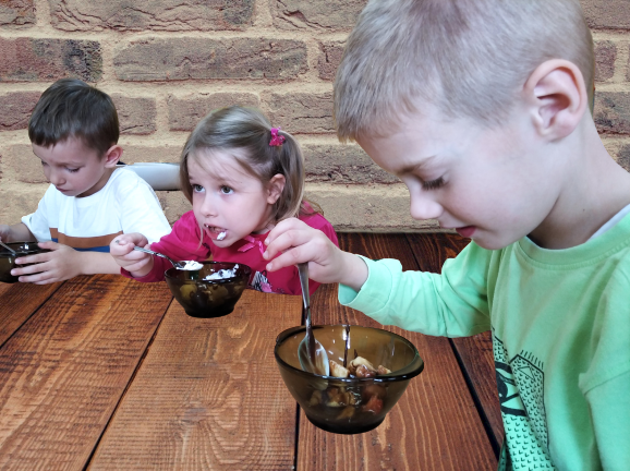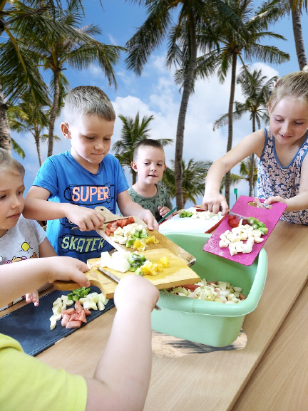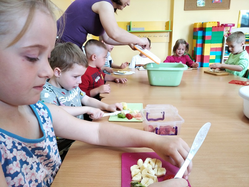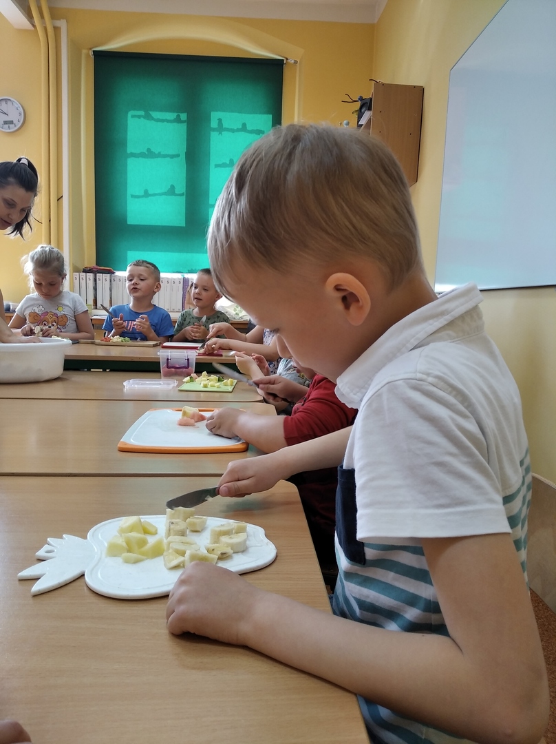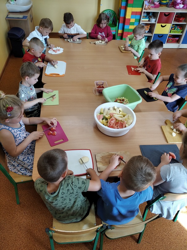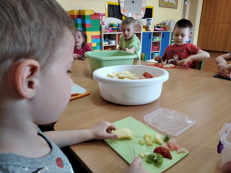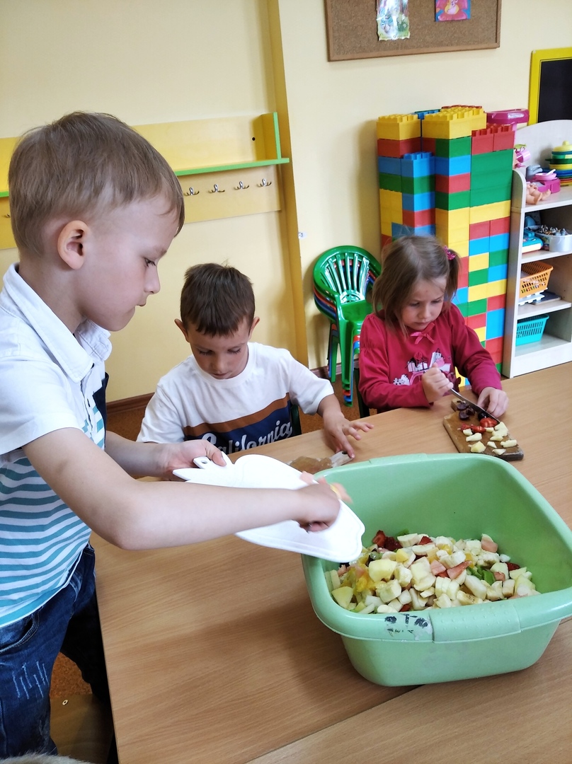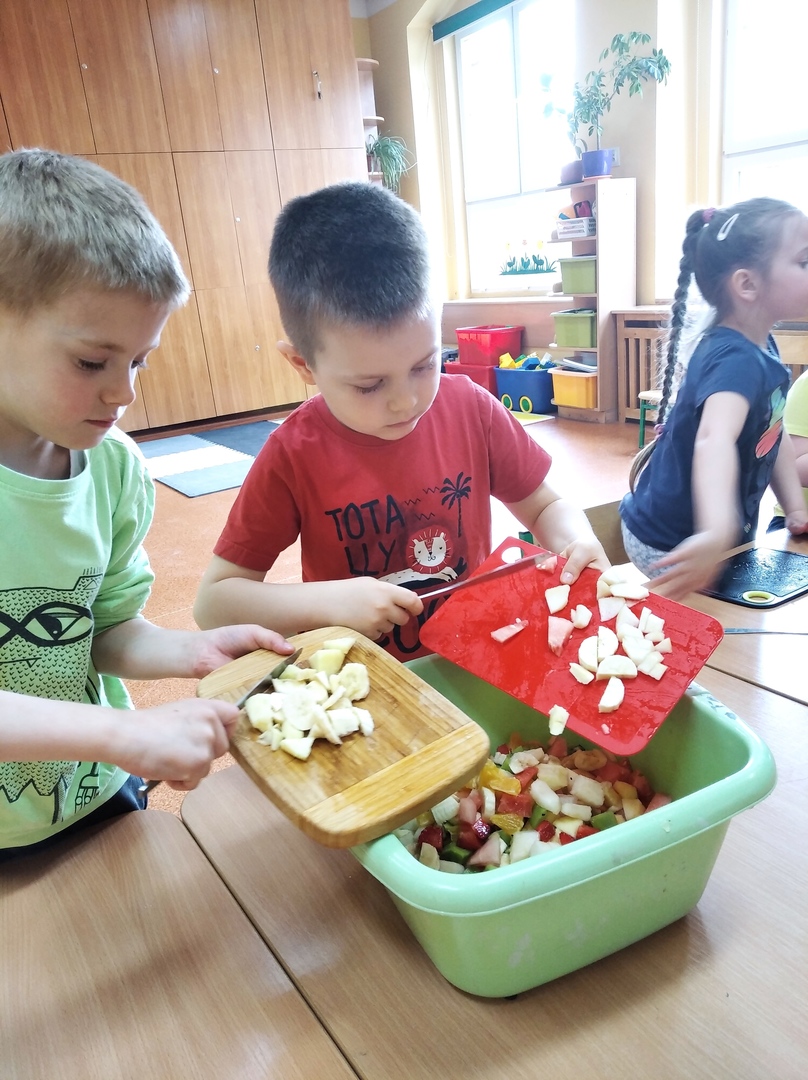 Na dzisiejszych zajęciach było przesmacznie, a przede wszystkim zdrowo! Dzieci własnoręcznie przygotowały pyszną, witaminową sałatkę. Wcześniej przyniosły z domów różne świeże owoce. Były jabłka, gruszki, banany, brzoskwinie, kiwi, pomarańcze, winogrona, truskawki oraz arbuz. Wszyscy mieli soczyste minki na widok tak smakowitych owoców i każdy ochoczo zabrał się do pracy. Dzieci samodzielnie kroiły i przyrządzały sałatkę owocową przestrzegając zasad bezpieczeństwa przy posługiwaniu się nożem. Potem oczywiście nastąpiła degustacja. Przyrządzanie sałatek dało dzieciom wiele satysfakcji jednocześnie uświadamiając jak ważną rolę odgrywają witaminy we właściwym funkcjonowaniu organizmu. Sałatka udała się, wyszła wspaniale!