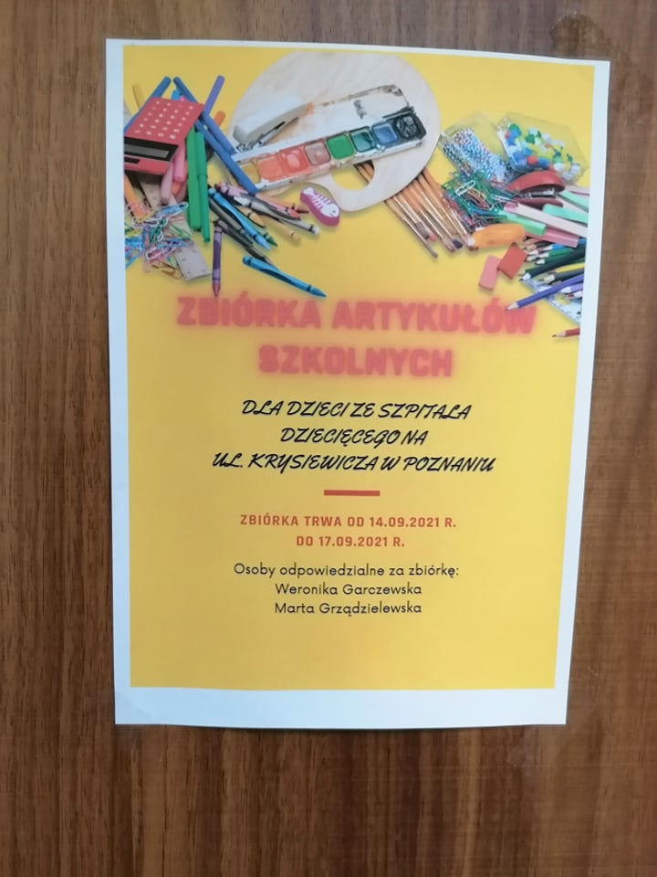 W dniach 14-17.09.2021r. w naszej szkole odbyła się zbiórka artykułów szkolnych dla dzieci z Specjalistycznego Zespołu Opieki Zdrowotnej nad Matką i Dzieckiem w Poznaniu. Udało nam się zebrać sporą ilość przyborów szkolnych dla dzieci.