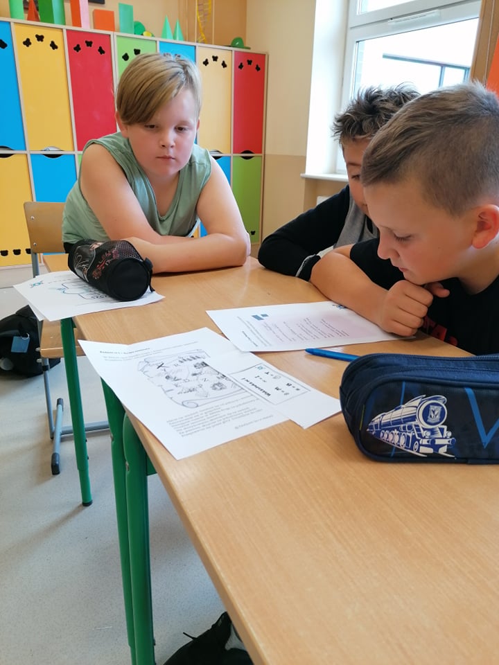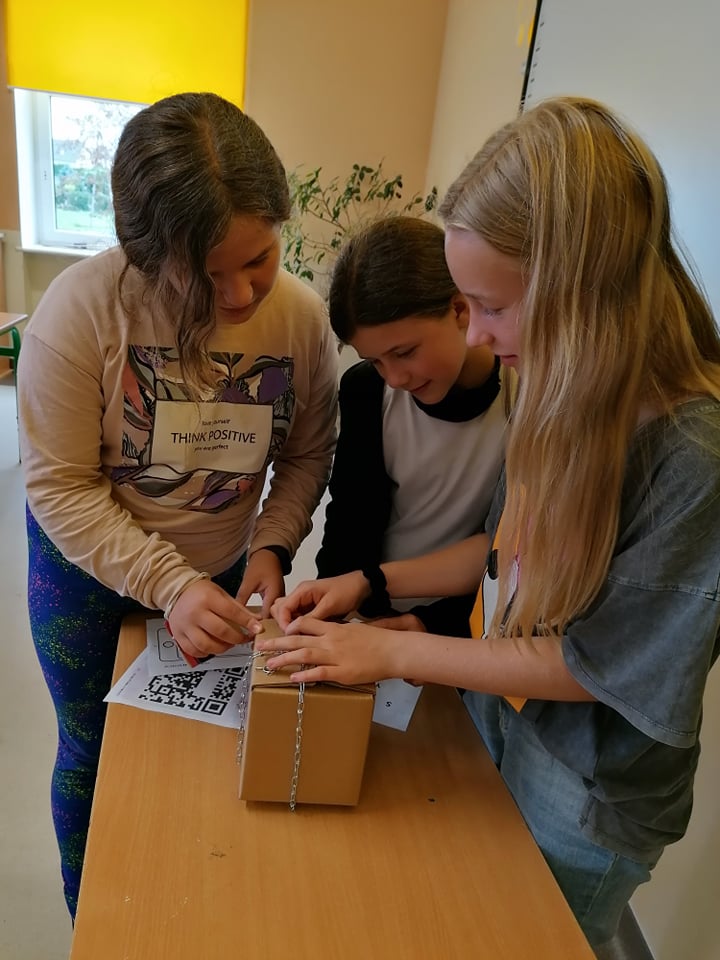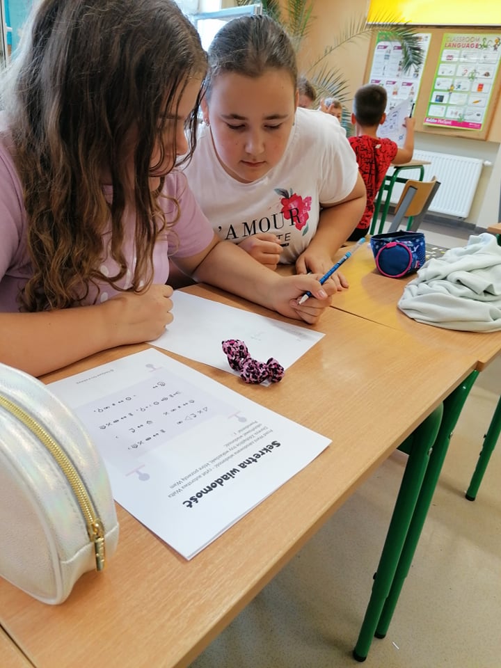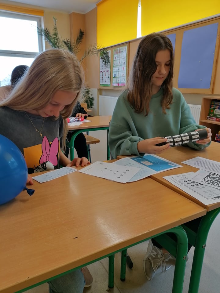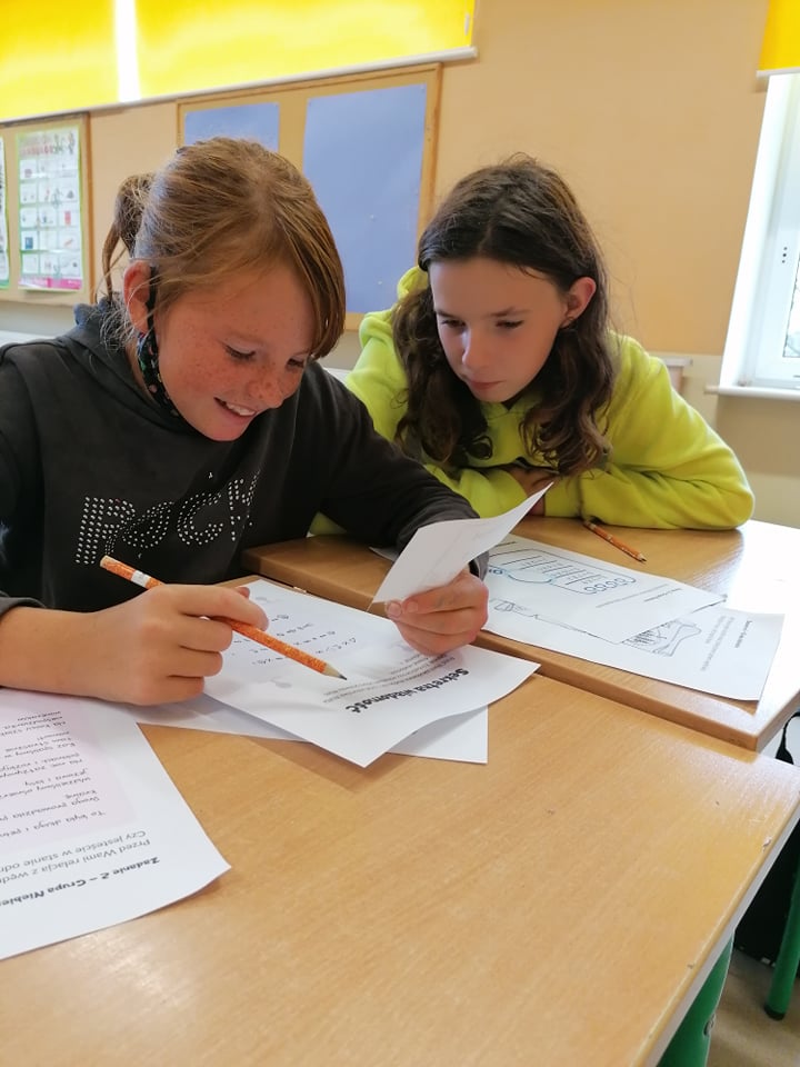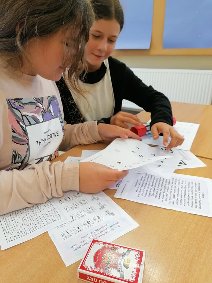 Na czwartkowych zajęciach logiczno-matematycznych uczniowie klasy V i VI mieli okazję pierwszy raz zmierzyć się ze szkolnym escape roomem. Klasa V miała za zadanie odszyfrować sekretną wiadomością przy pomocy wskazówek, które otrzymywali za rozwiązanie łamigłówki/zagadki. Natomiast klasa VI musiała zdobyć kod, aby otworzyć tajemnicze pudełko z kłódką, w której znajdował się „skarb”. Uczniowie wykorzystując zdobytą do tej pory wiedzę, mogli w praktyczny sposób ją wykorzystać, a zarazem świetnie się bawić.