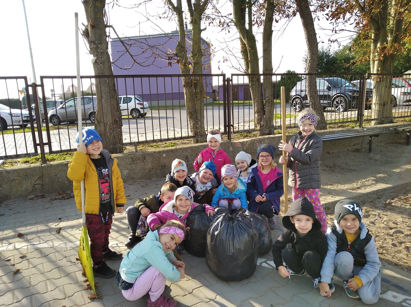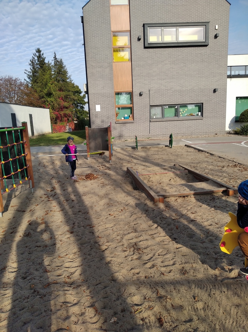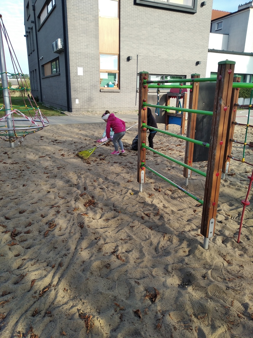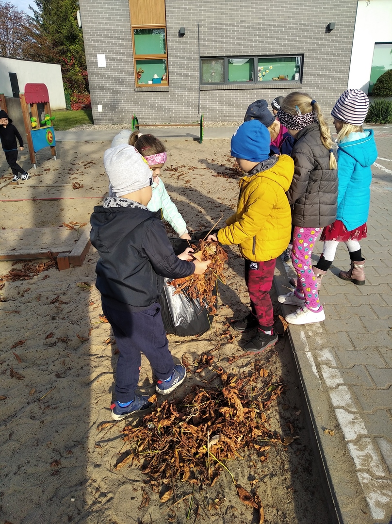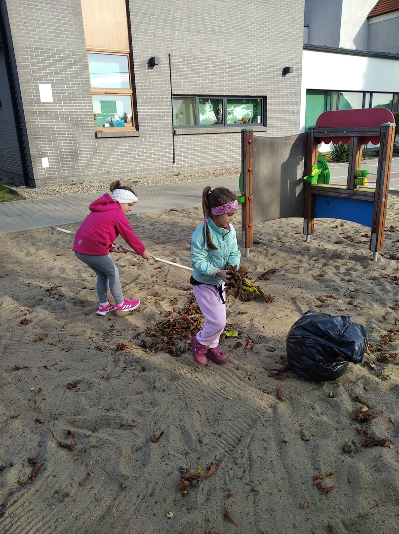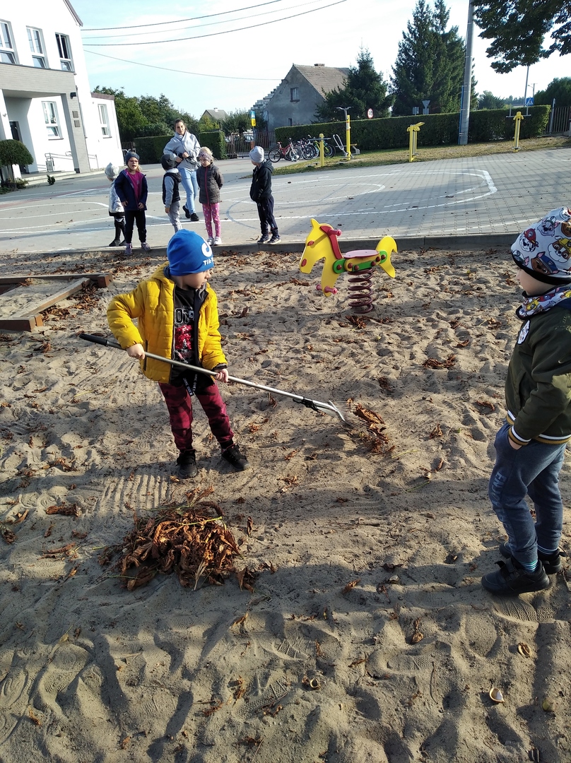 W czasie jednego z pobytów na świeżym powietrzu grupa 5 -latków wzięła udział w porządkowaniu placu zabaw: grabiła i zbierała liście. Radości było co nie miara . Dzieci bardzo się zaangażowały, to była dla nich sama przyjemność.