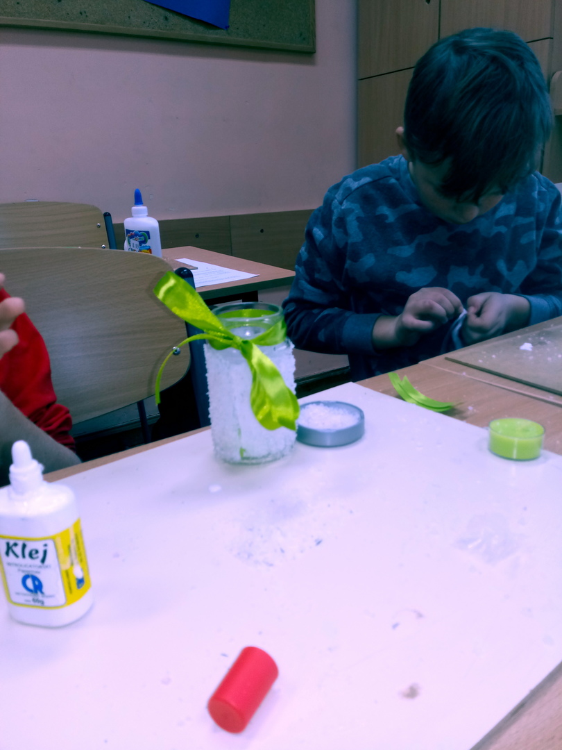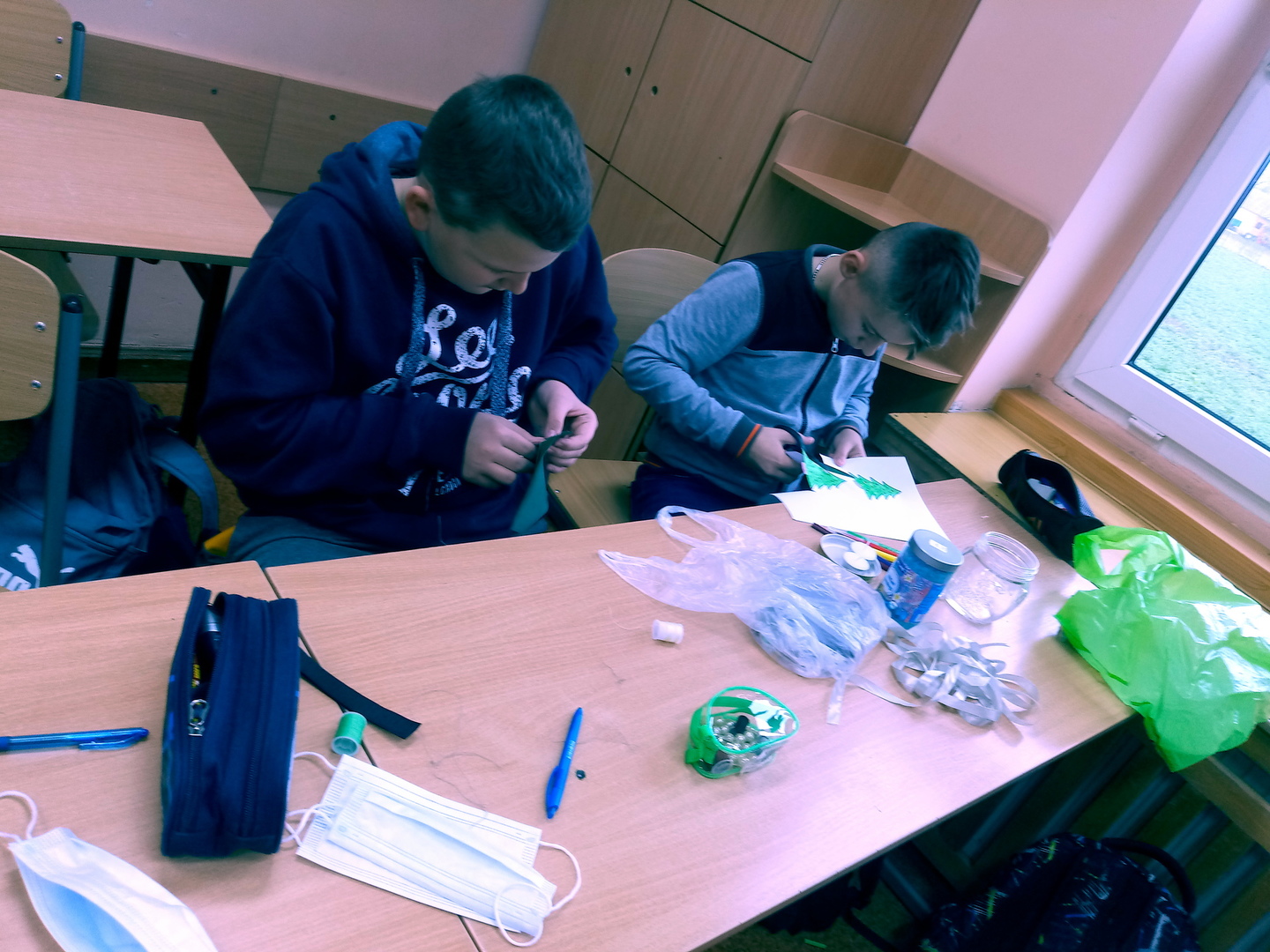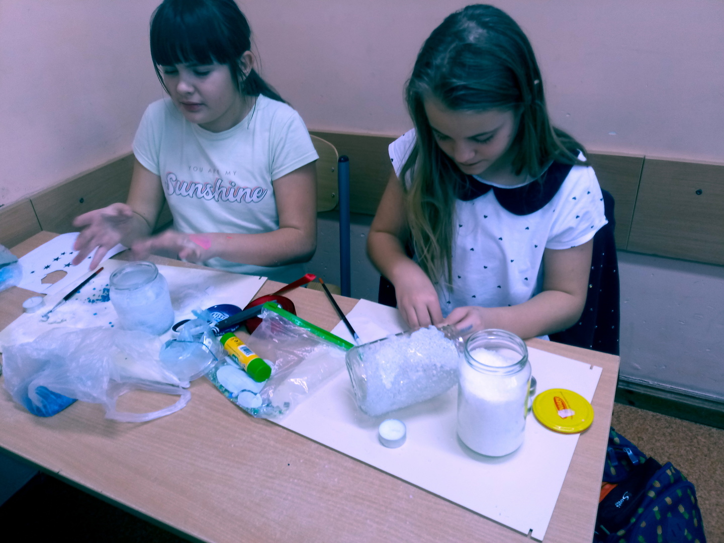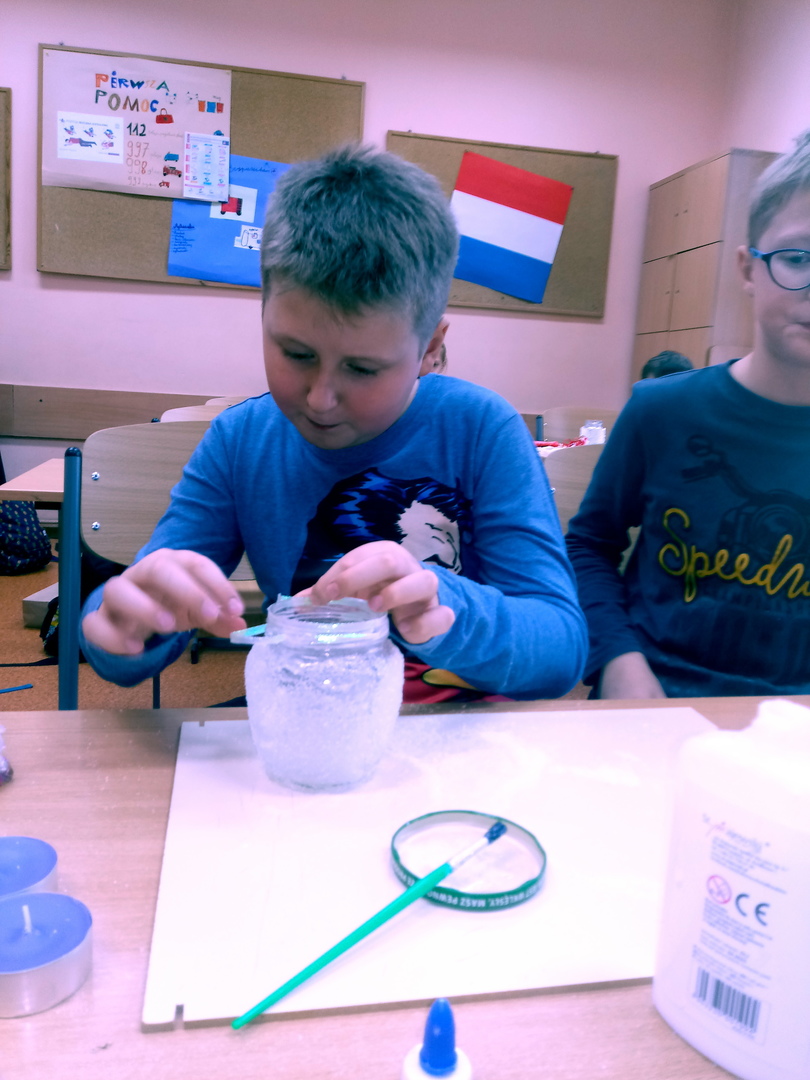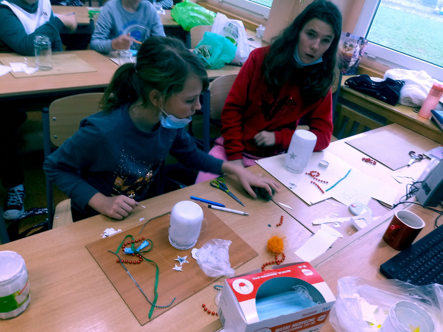 Dzieci od kilku dni podczas techniki przygotowują ozdoby świąteczne. Klasa VI zrobiła z tej okazji przepiękne, choć pracochłonne kule świetlne oraz świeczniki ze słoiczków. Klasa IV zmierzyła się z wykonaniem świeczników ze słoiczków, które posmarowano klejem i obtoczono solą/cukrem - niby metoda bardzo prosta aczkolwiek niezwykle efektowna. Klasa V wykonała natomiast świczniki z użyciem szblonów i farby.