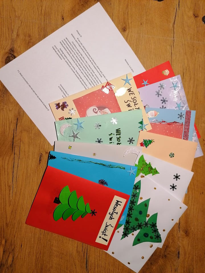 Kartki są już gotowe i czekają na wysyłkę, a nam zostaje teraz czekać na kartki od naszego partnera. Projekt ma na celu budowanie relacji społecznych, integrację zespołu klasowego oraz rozwijanie kreatywności i wyobraźni.