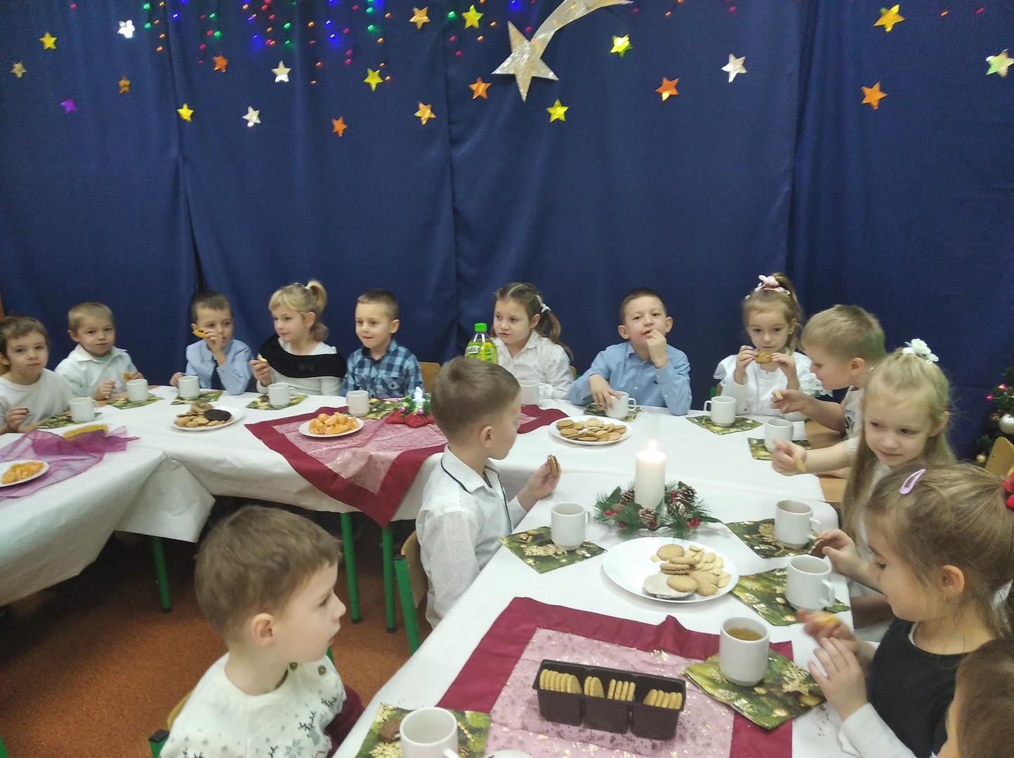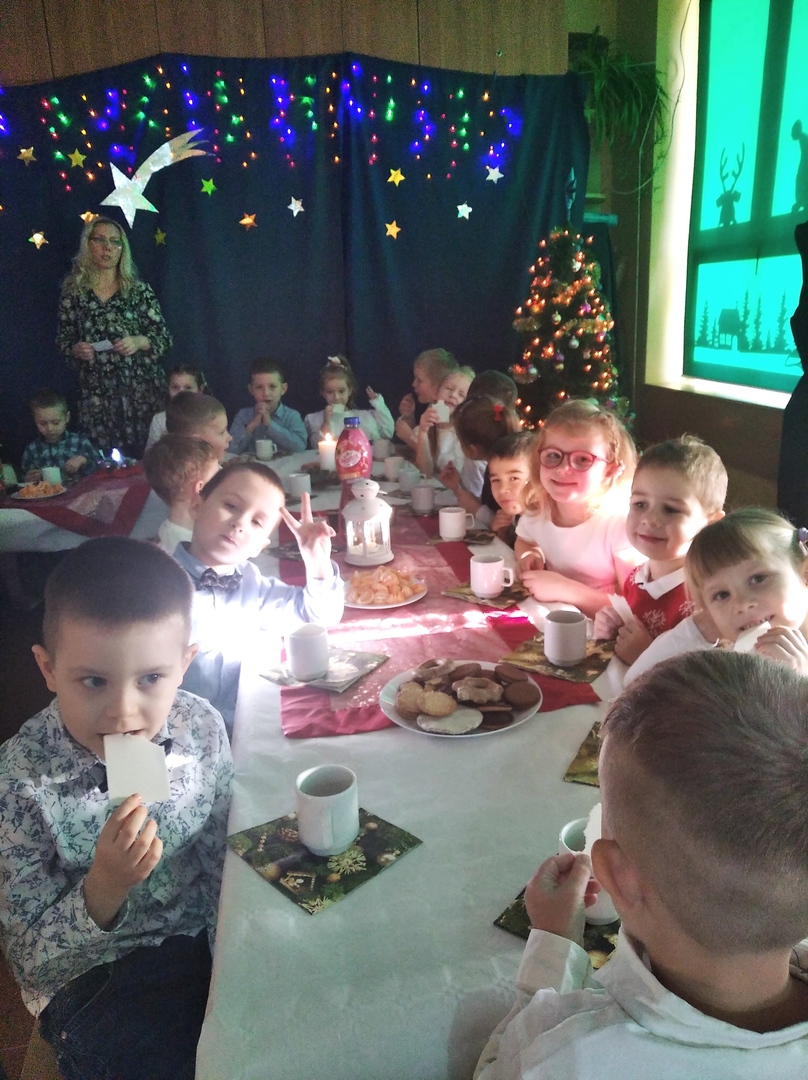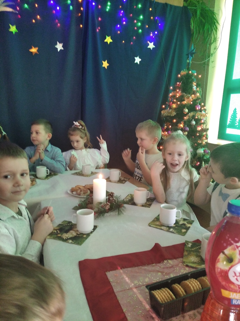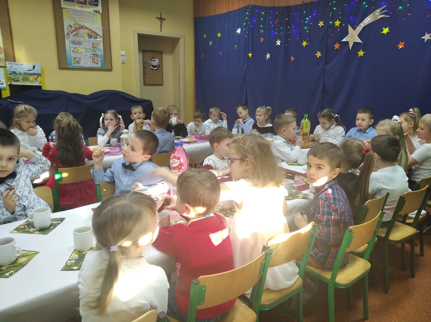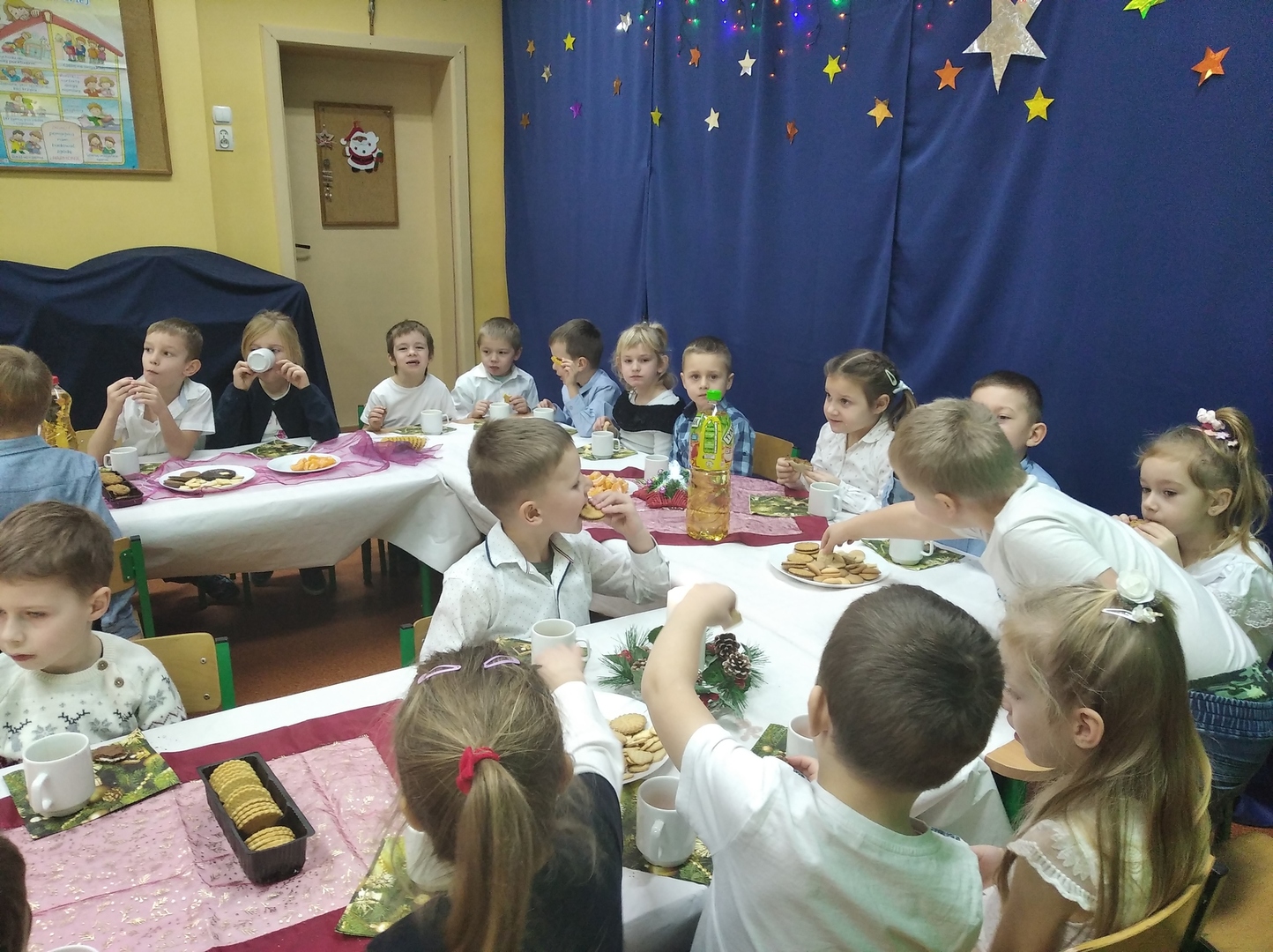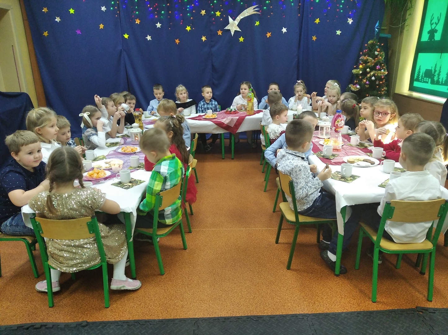 W sali przedszkolnej odświętnie ubrane przedszkolaki wysłuchały życzeń, które złożyły im panie wychowawczynie. Następnie wszyscy zasiedli do pięknie przystrojonych stołów. Nie zabrakło również wspólnego śpiewania kolęd i pastorałek.