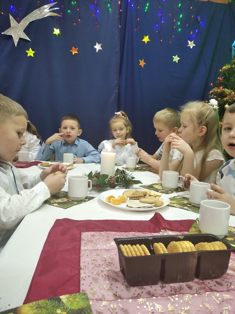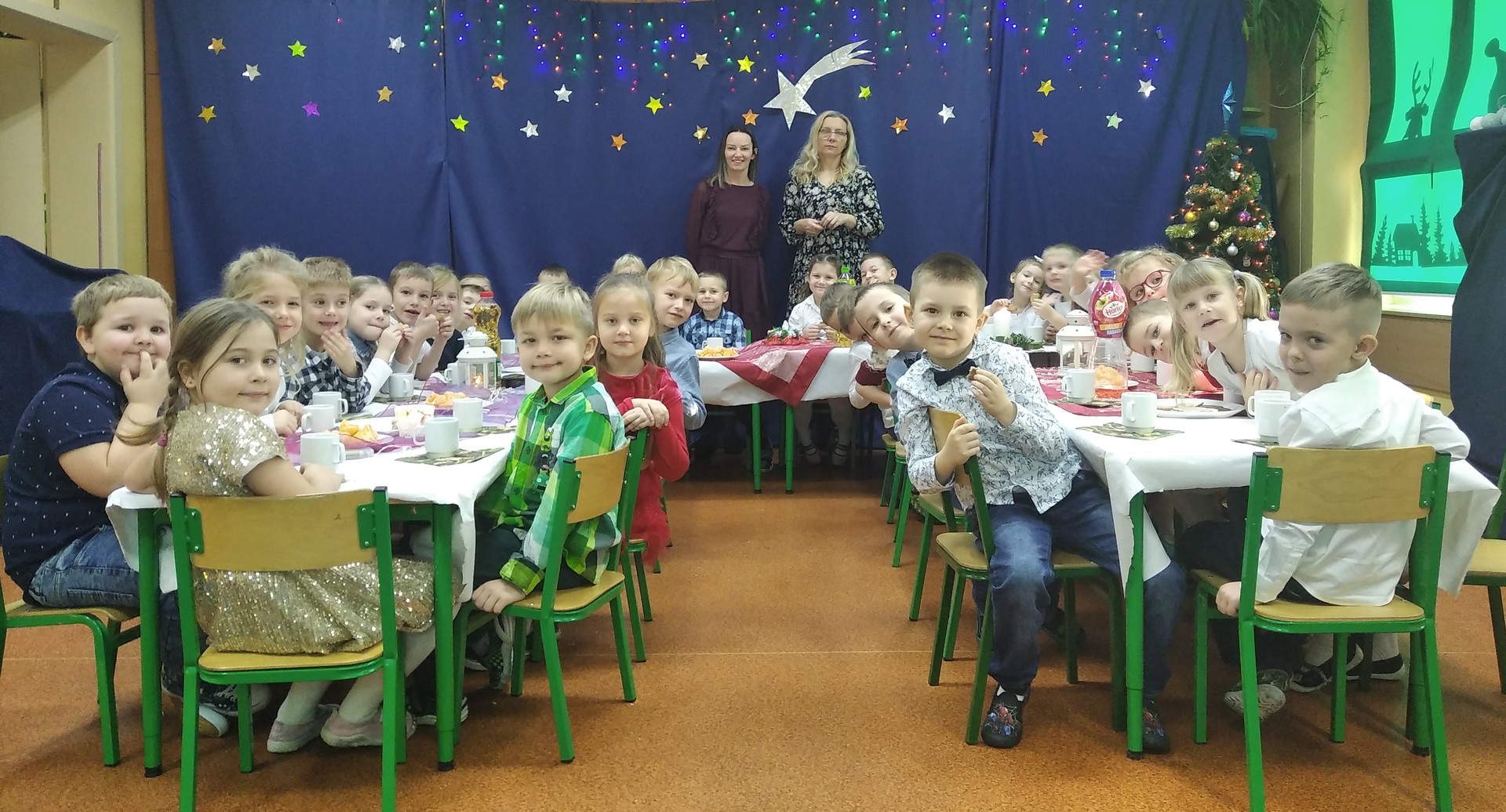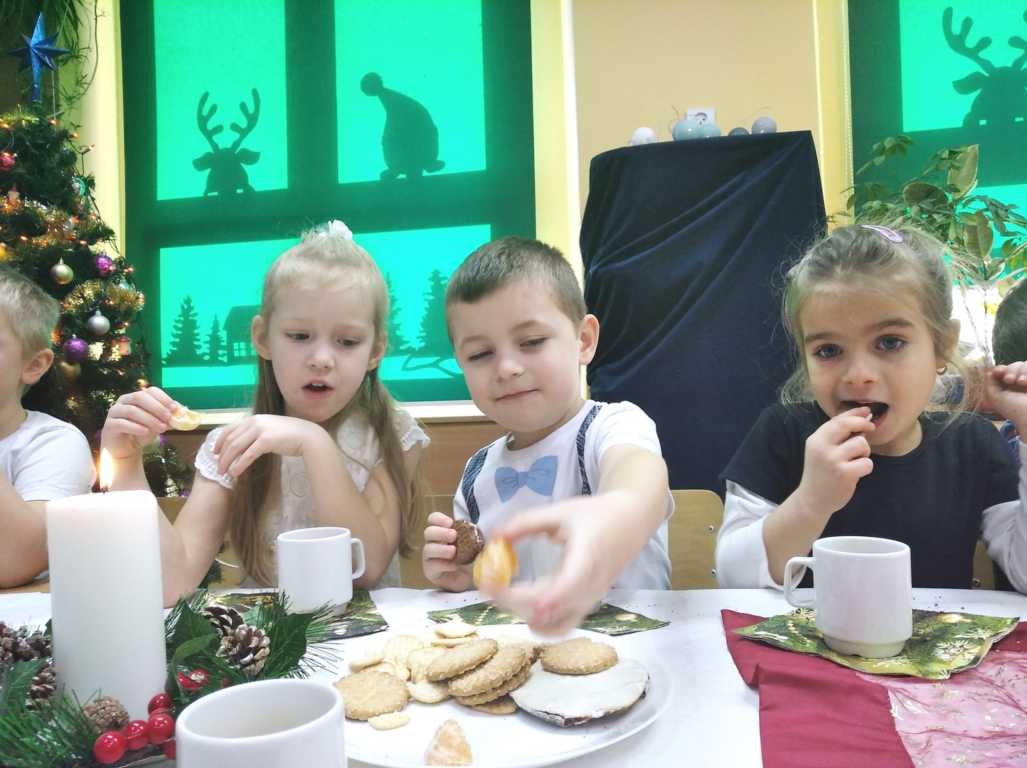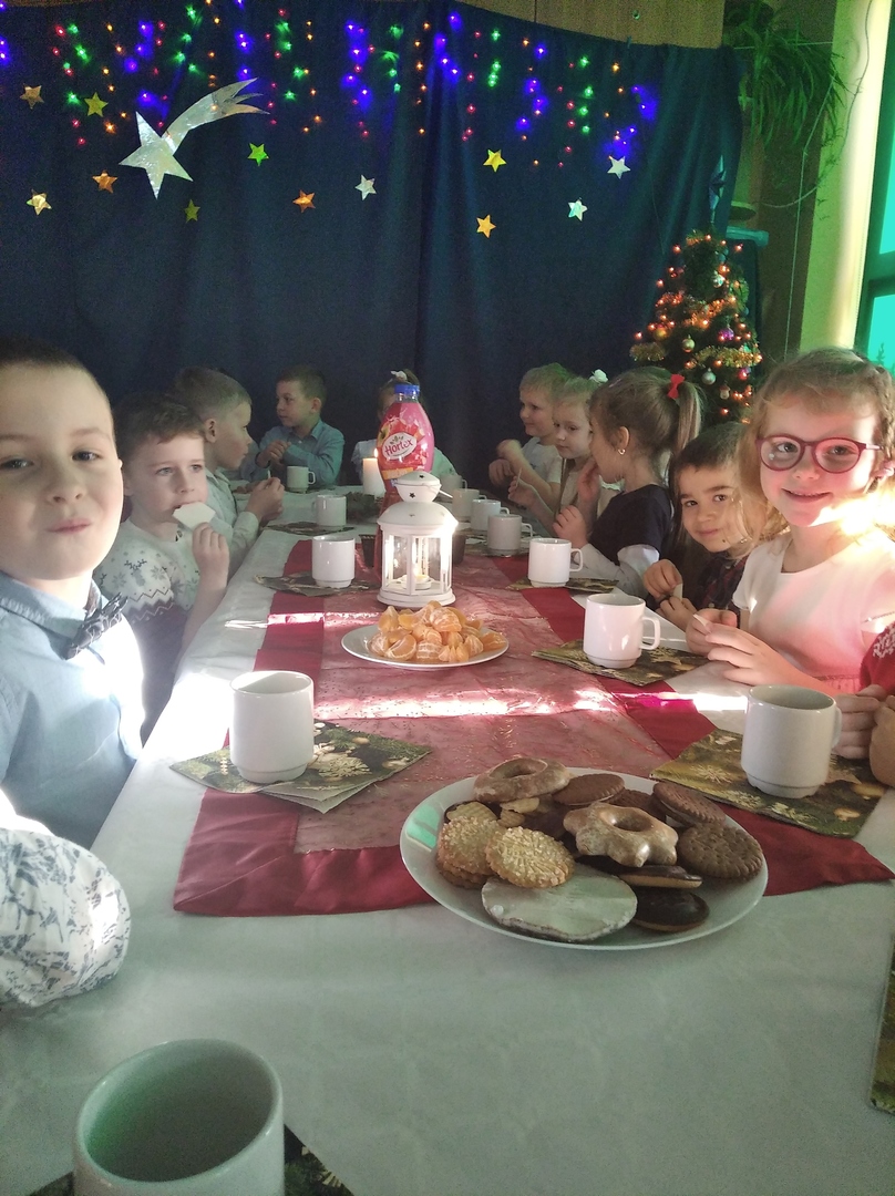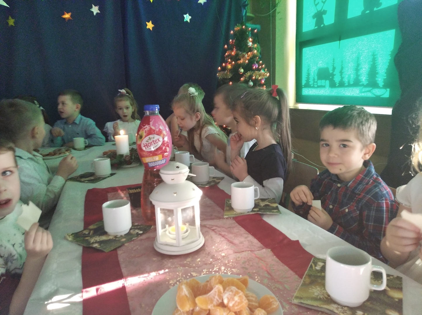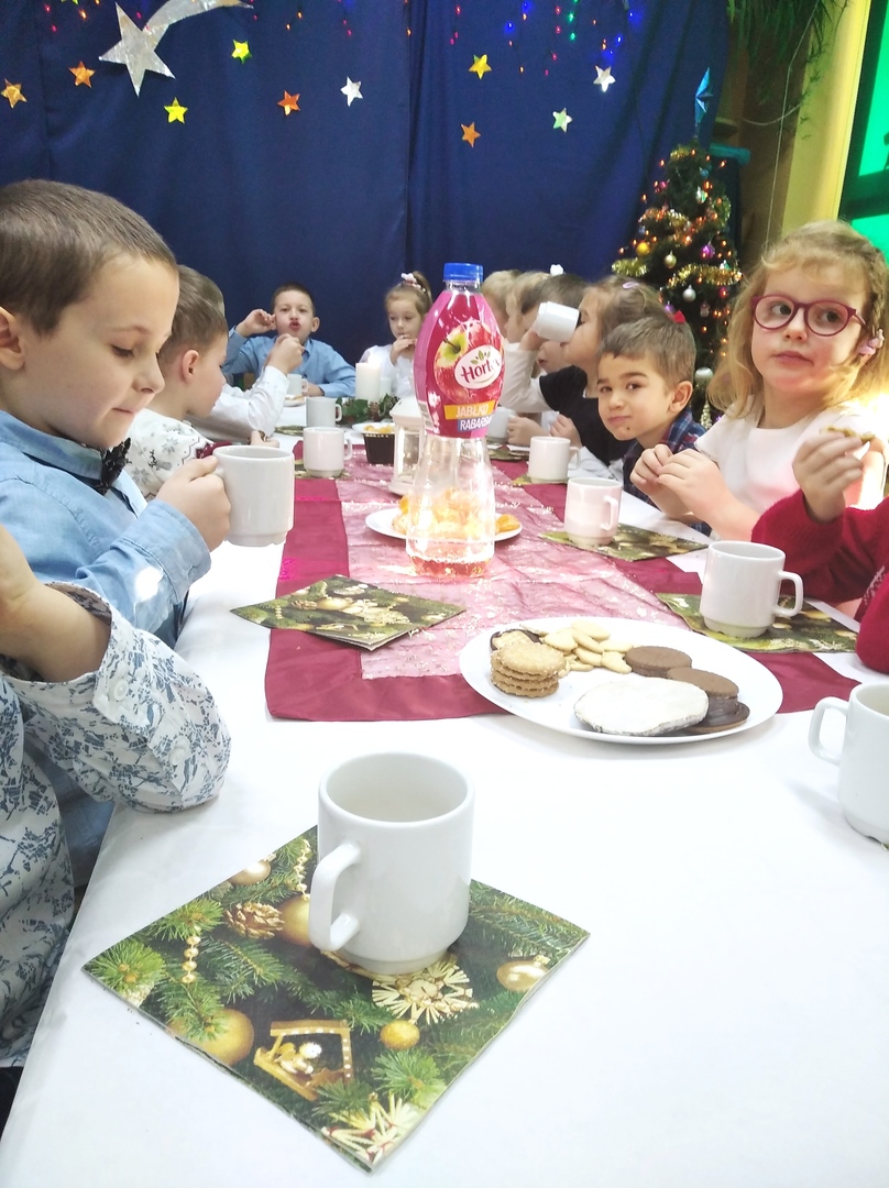 W sali przedszkolnej odświętnie ubrane przedszkolaki wysłuchały życzeń, które złożyły im panie wychowawczynie. Następnie wszyscy zasiedli do pięknie przystrojonych stołów. Nie zabrakło również wspólnego śpiewania kolęd i pastorałek.