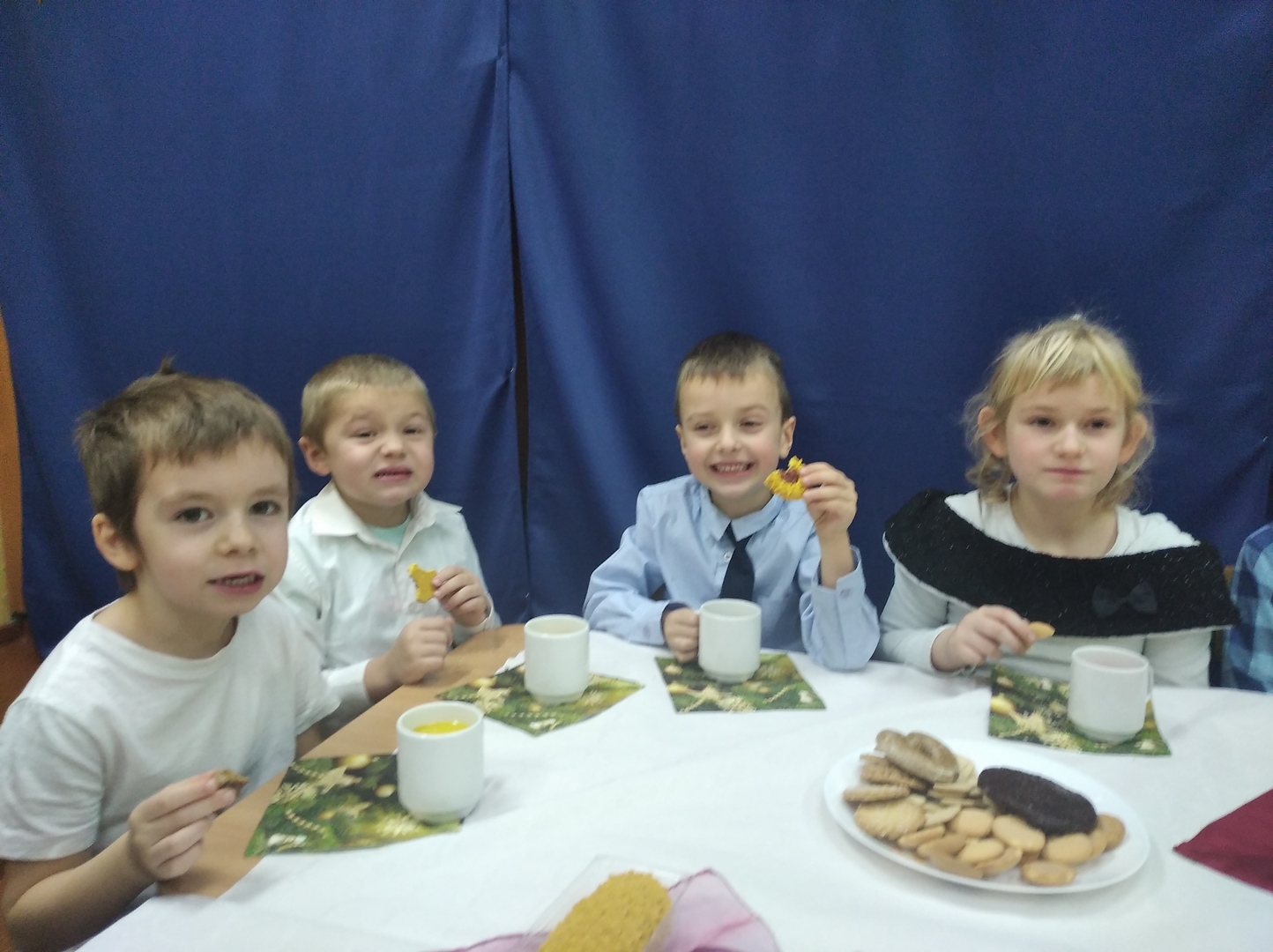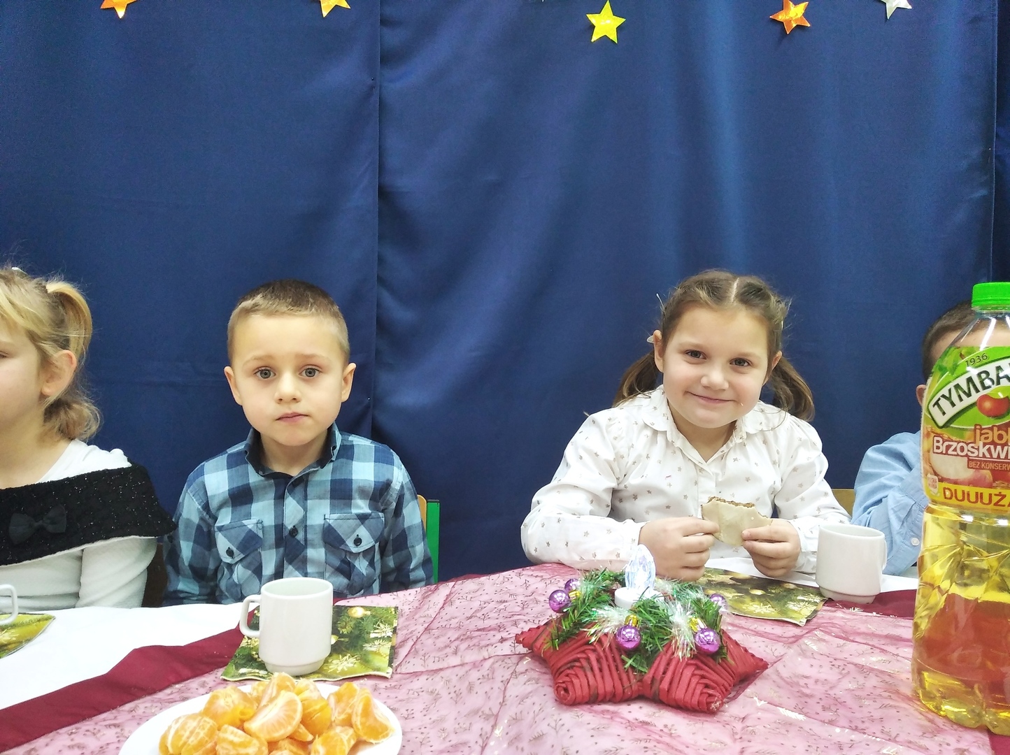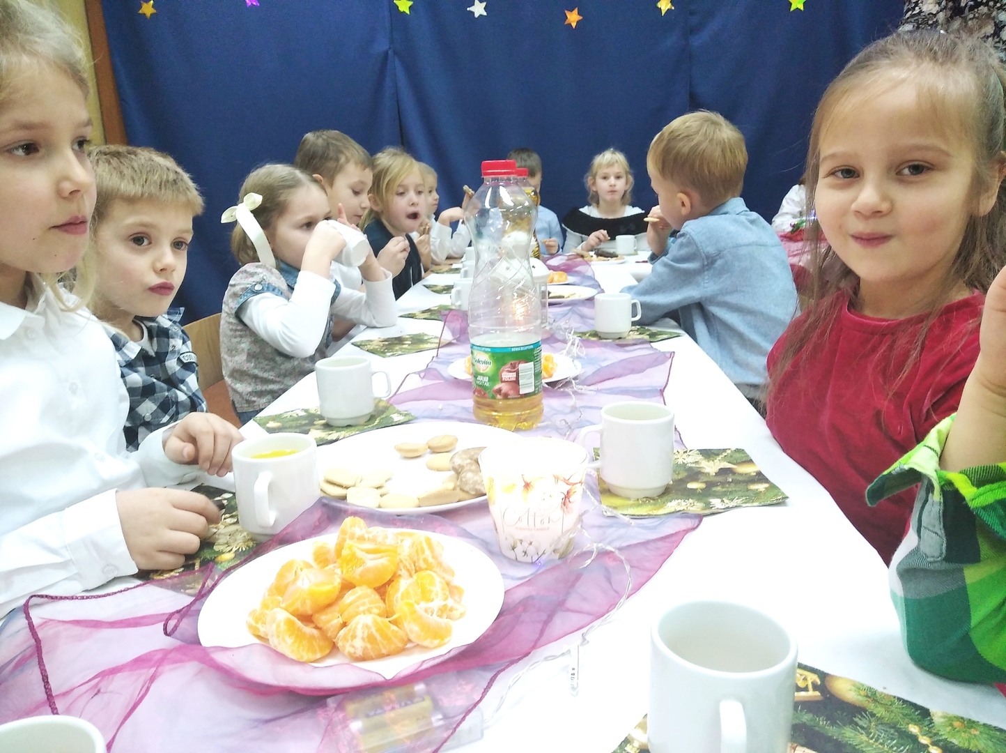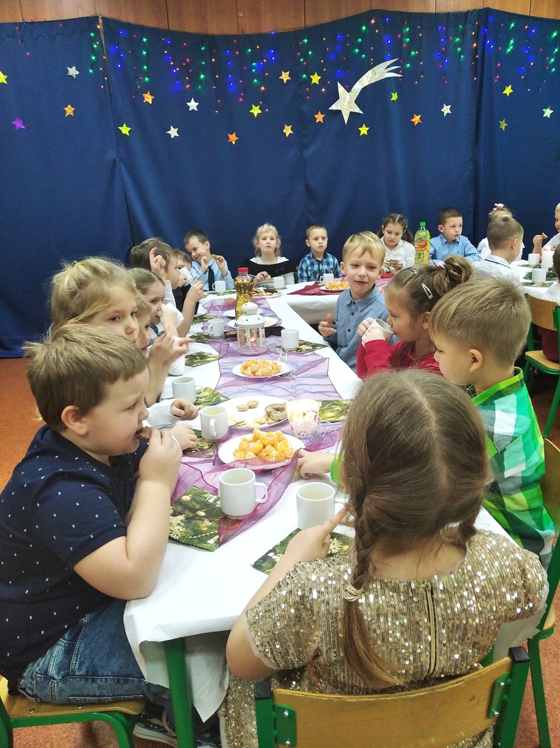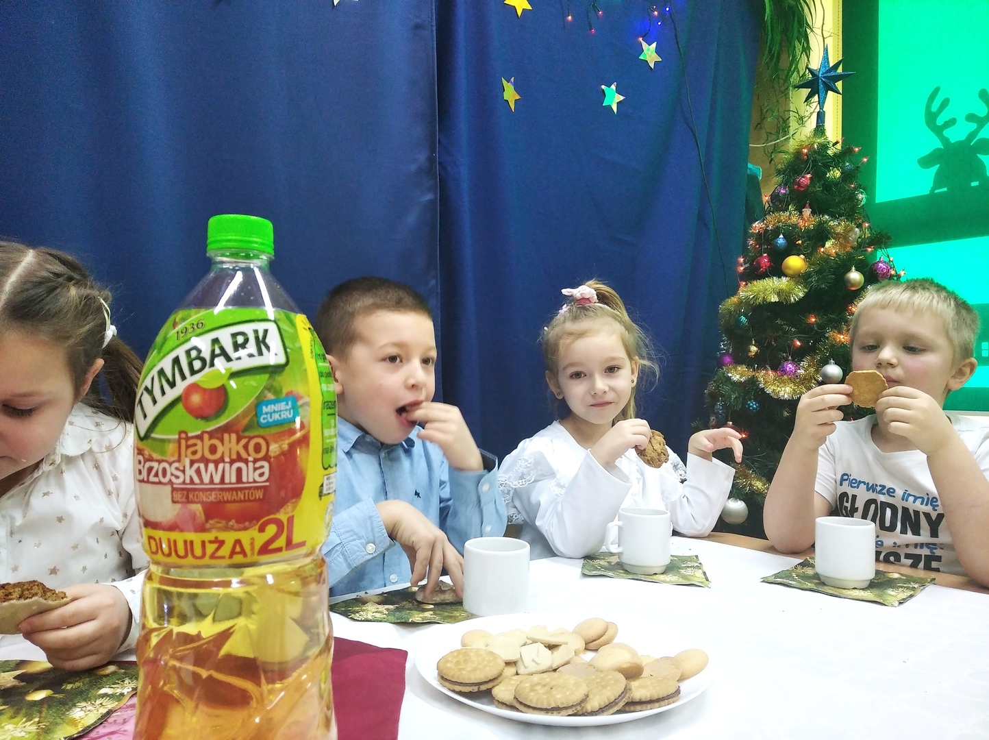 W sali przedszkolnej odświętnie ubrane przedszkolaki wysłuchały życzeń, które złożyły im panie wychowawczynie. Następnie wszyscy zasiedli do pięknie przystrojonych stołów. Nie zabrakło również wspólnego śpiewania kolęd i pastorałek.