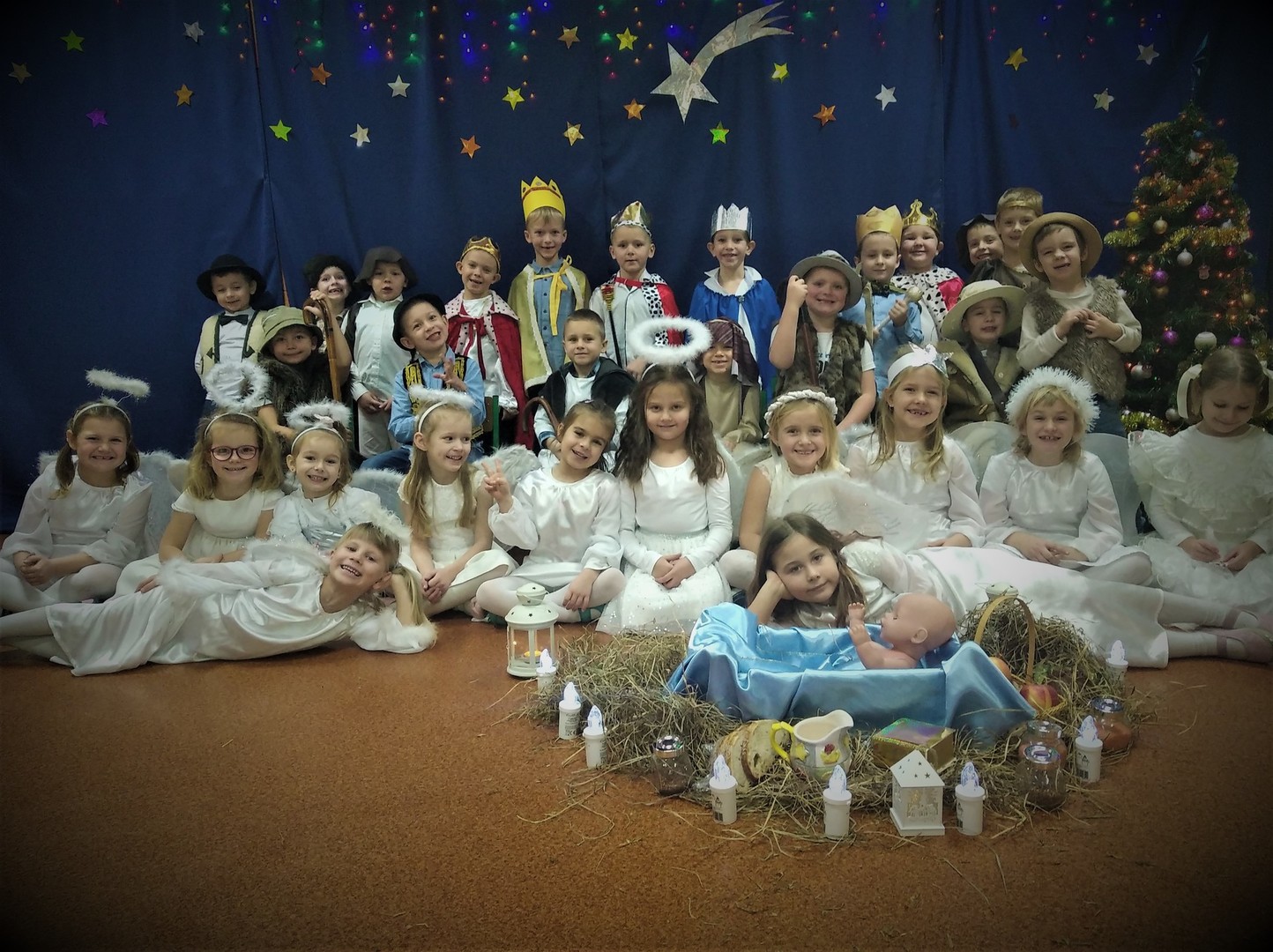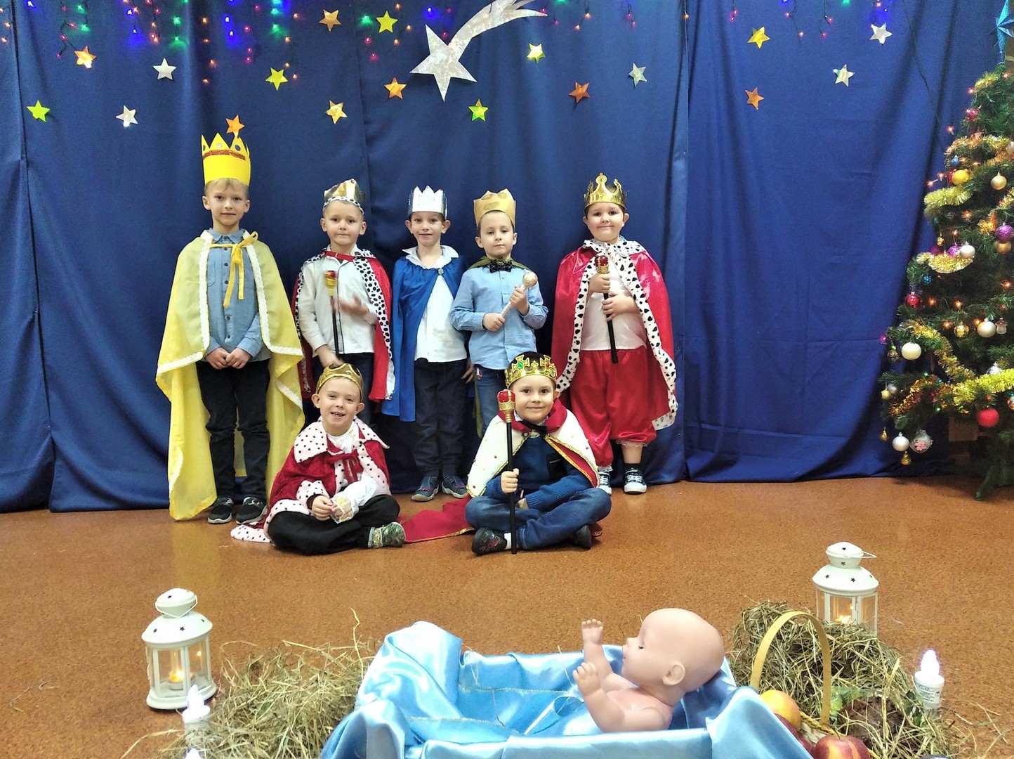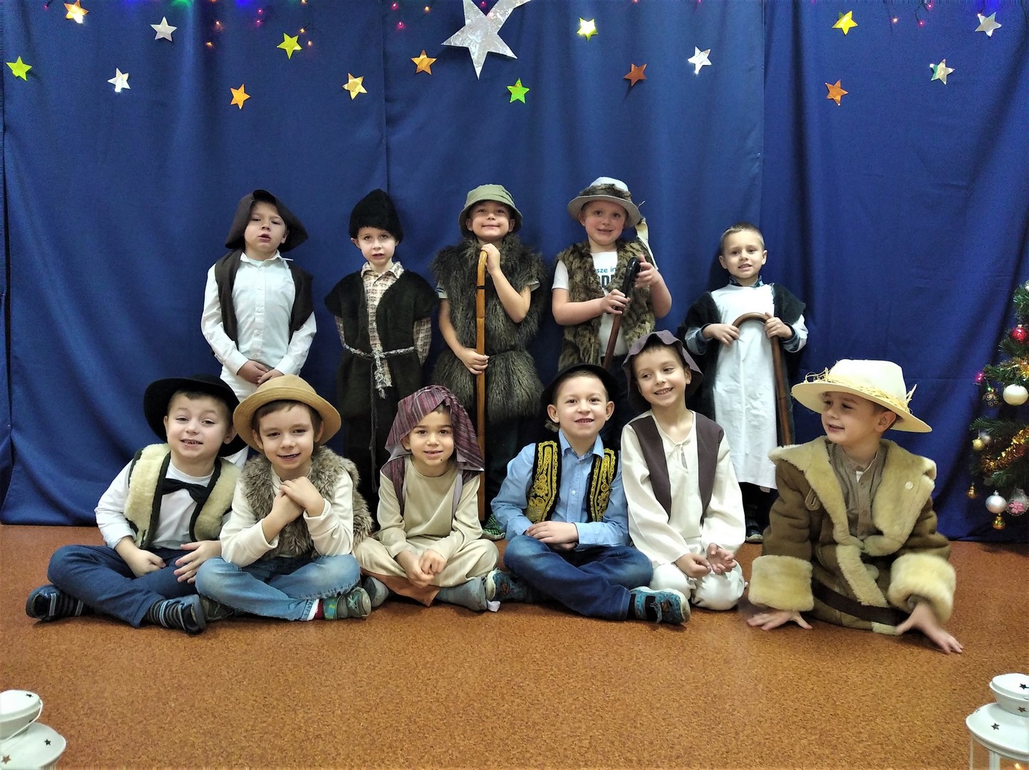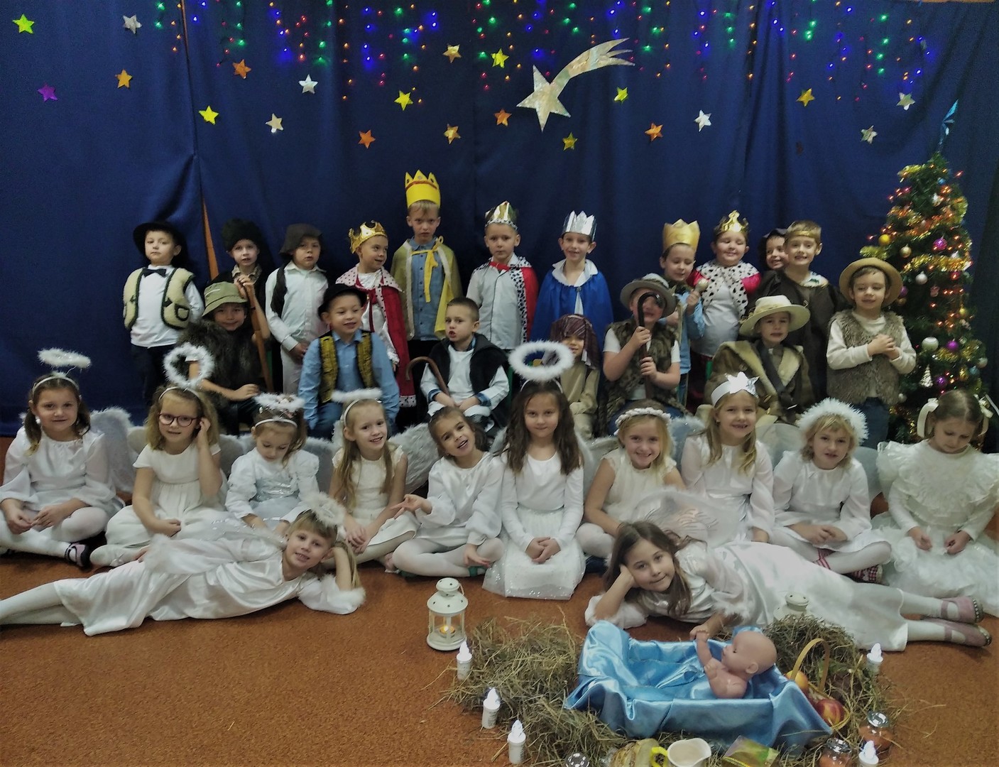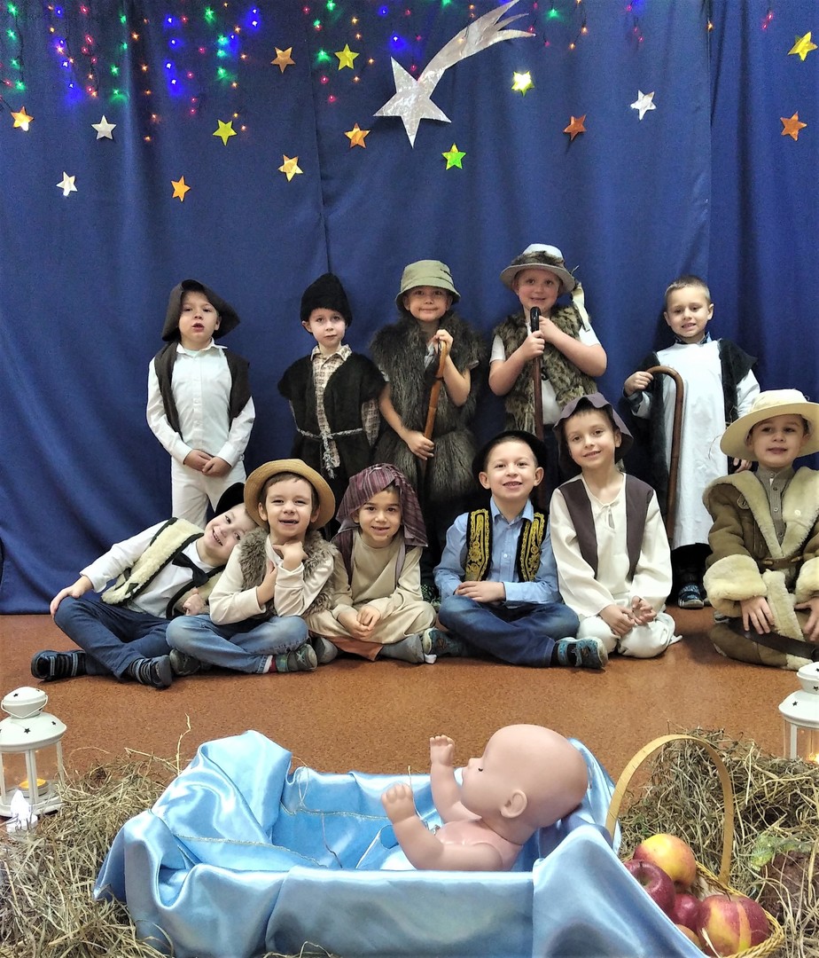 Po wigilii odbyło się w naszym przedszkolu przedstawienie jasełkowe w wykonaniu grupy 5 i 6 - latków. Mali aktorzy z dużym zaangażowaniem odtwarzali swoje role. Prezentowali swoje zdolności recytatorskie, wokalne i taneczne.