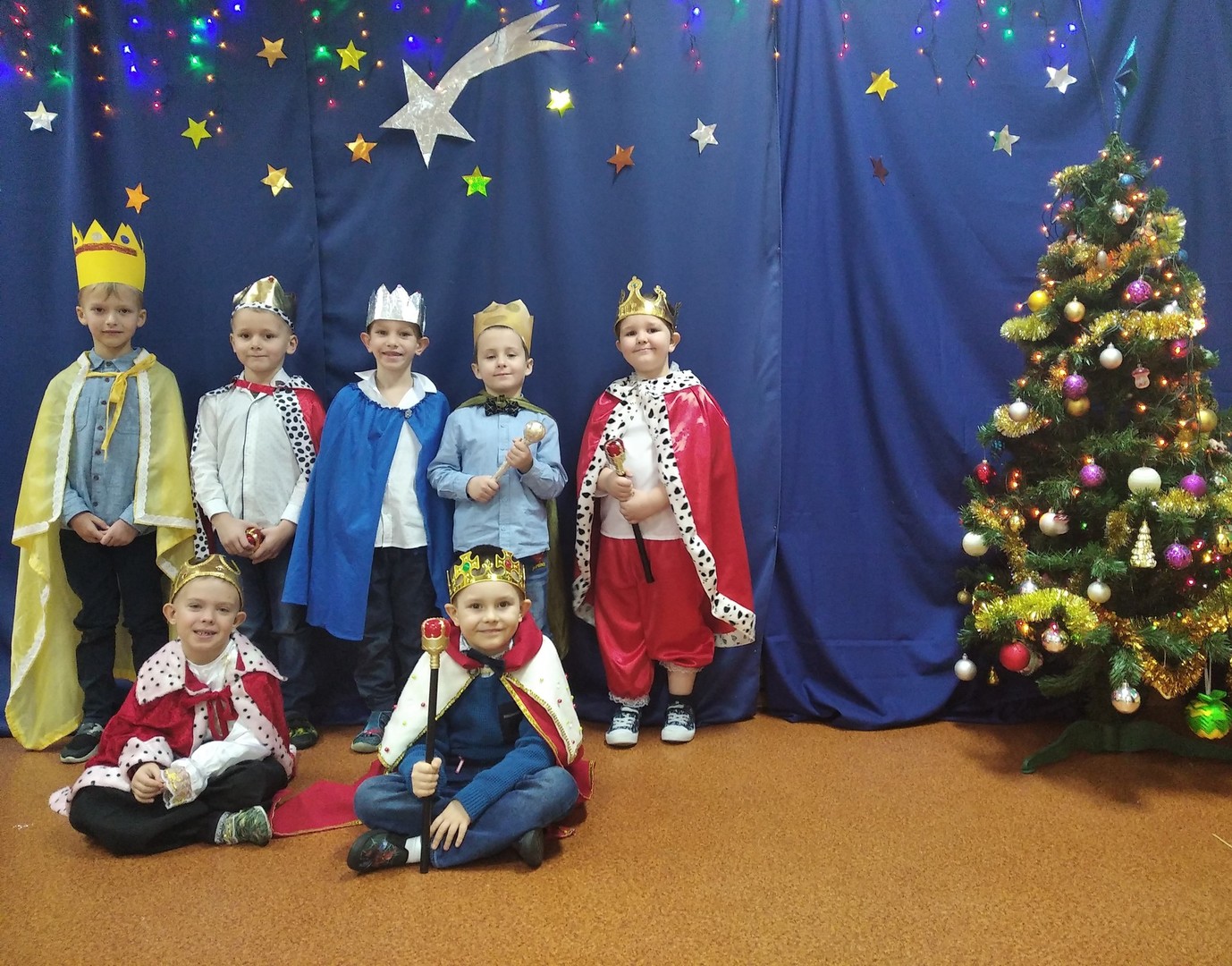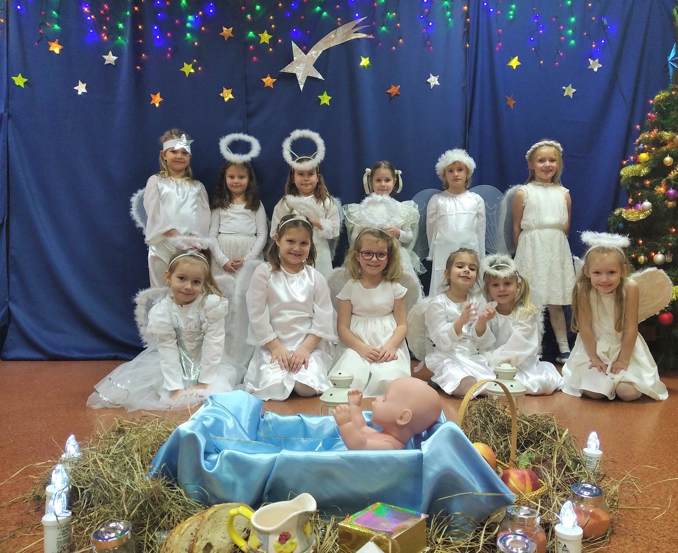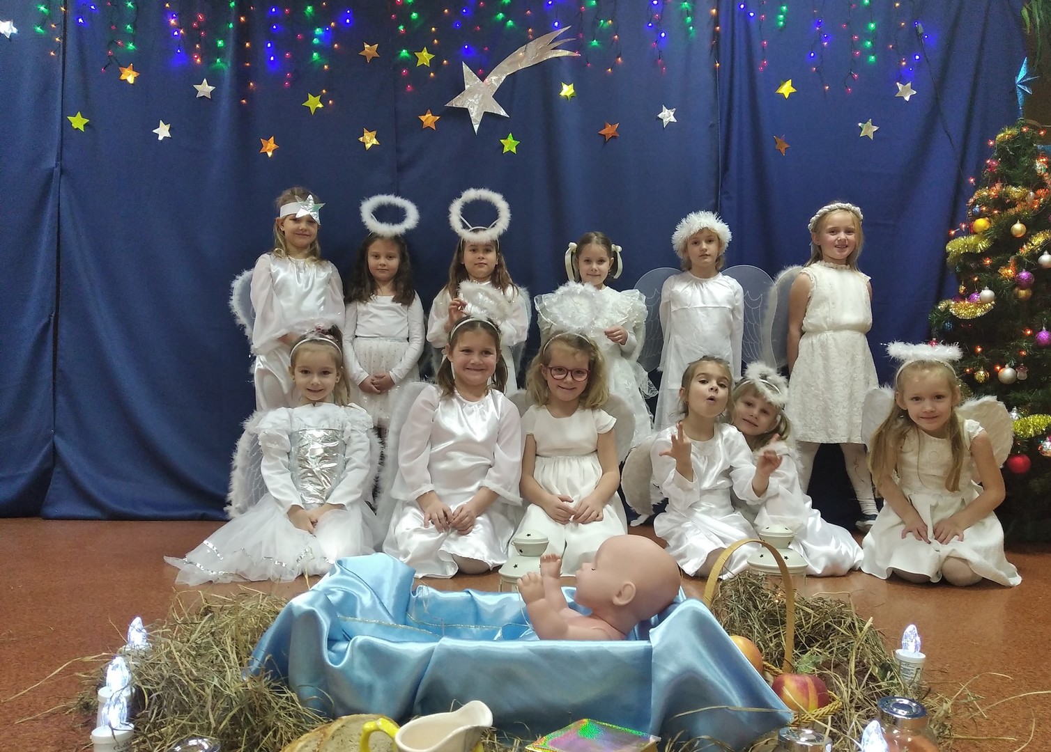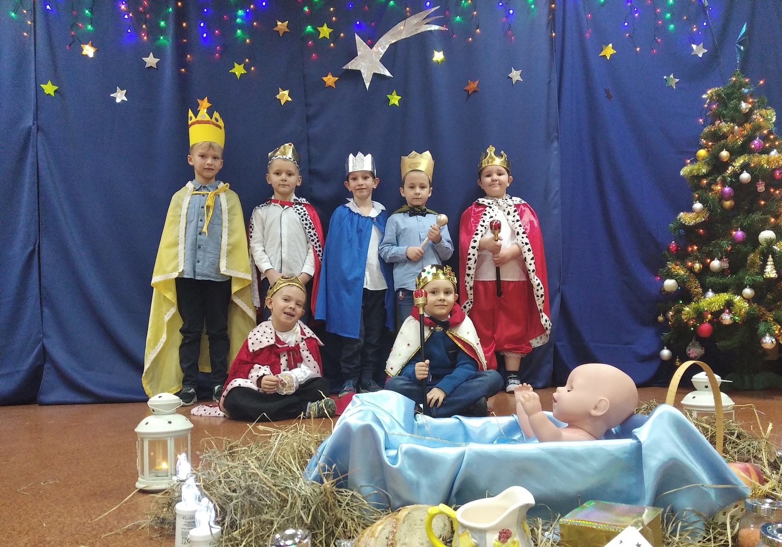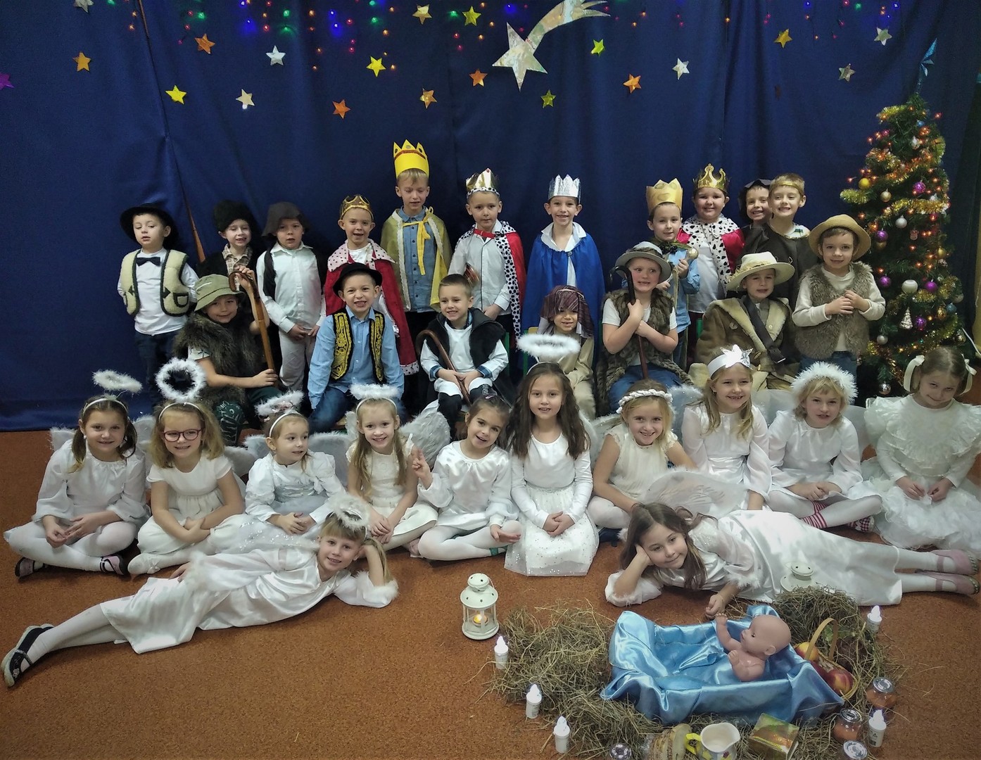 Po wigilii odbyło się w naszym przedszkolu przedstawienie jasełkowe w wykonaniu grupy 5 i 6 - latków. Mali aktorzy z dużym zaangażowaniem odtwarzali swoje role. Prezentowali swoje zdolności recytatorskie, wokalne i taneczne.