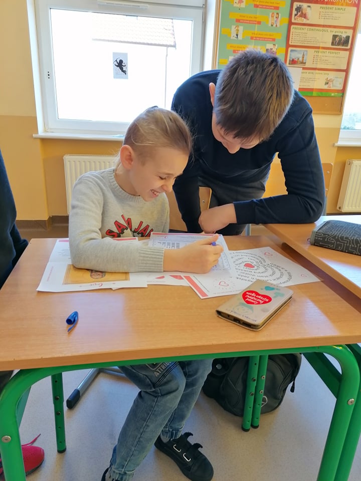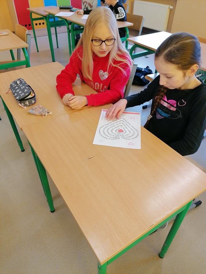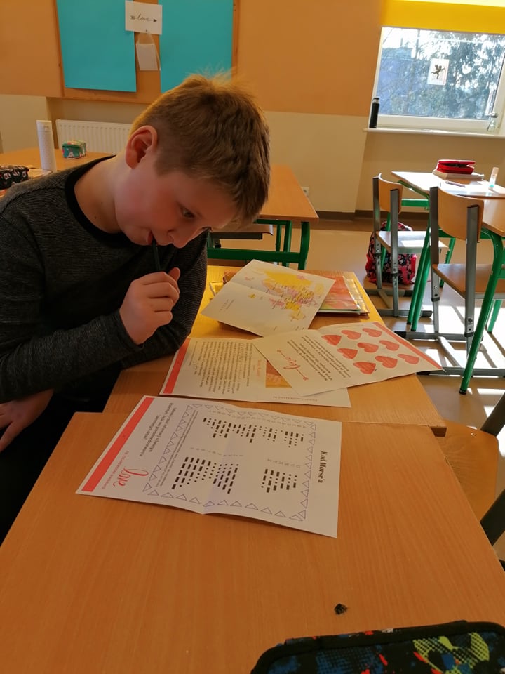 Z okazji święta zakochanych klasa IV na zajęciach z wychowawcą zmierzyła się z walentynkowym escape roomem. W czasie rozwiązywania zadań uczniowie poznali krótką historię Świętego Walentego oraz zapoznali się ze słowem „kocham Cię” w różnych językach. Następnie przy pomocy telefonów uczniowie odczytywali QR kody, na których były zaszyfrowane polecenia. Końcowy wynik ostatniego zadania otwierał tajemnicze pudełko z kłódką, w którym znajdowała się słodka niespodzianka oraz magiczna kolorowanka – rozszerzona rzeczywistość. Podczas ostatnich minut lekcji uczniowie przystąpili do kolorowania. Przy pomocy aplikacji quiver rysunki ożyły. Powstały piękne prace.