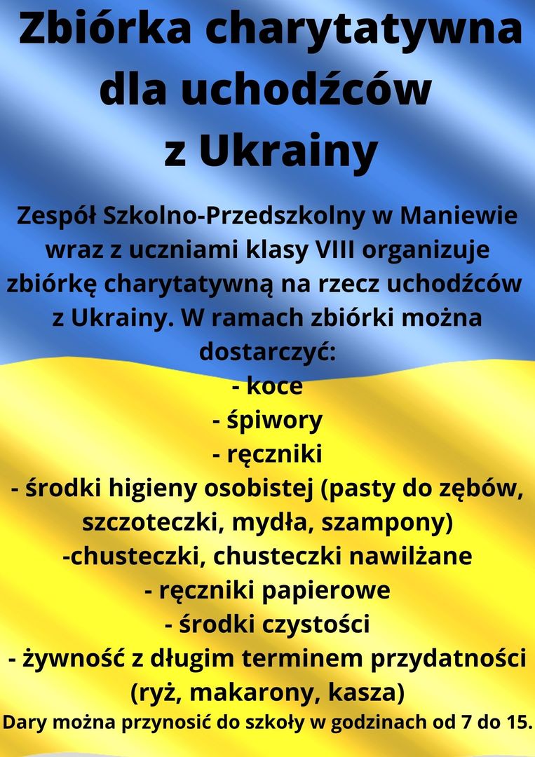 Zespół Szkolno-Przedszkolny w Maniewie wraz z uczniami klasy VIII organizuje zbiórkę charytatywną na rzecz uchodźców z Ukrainy.