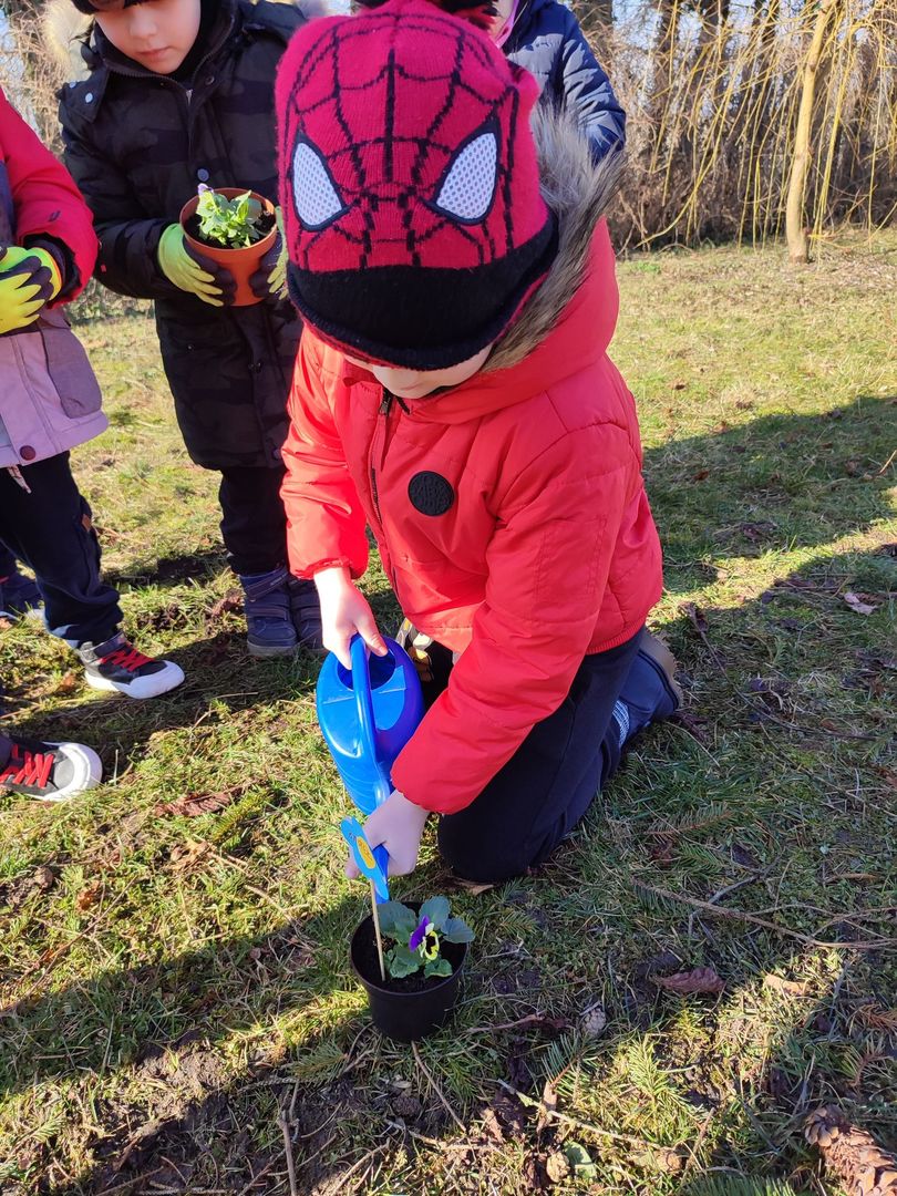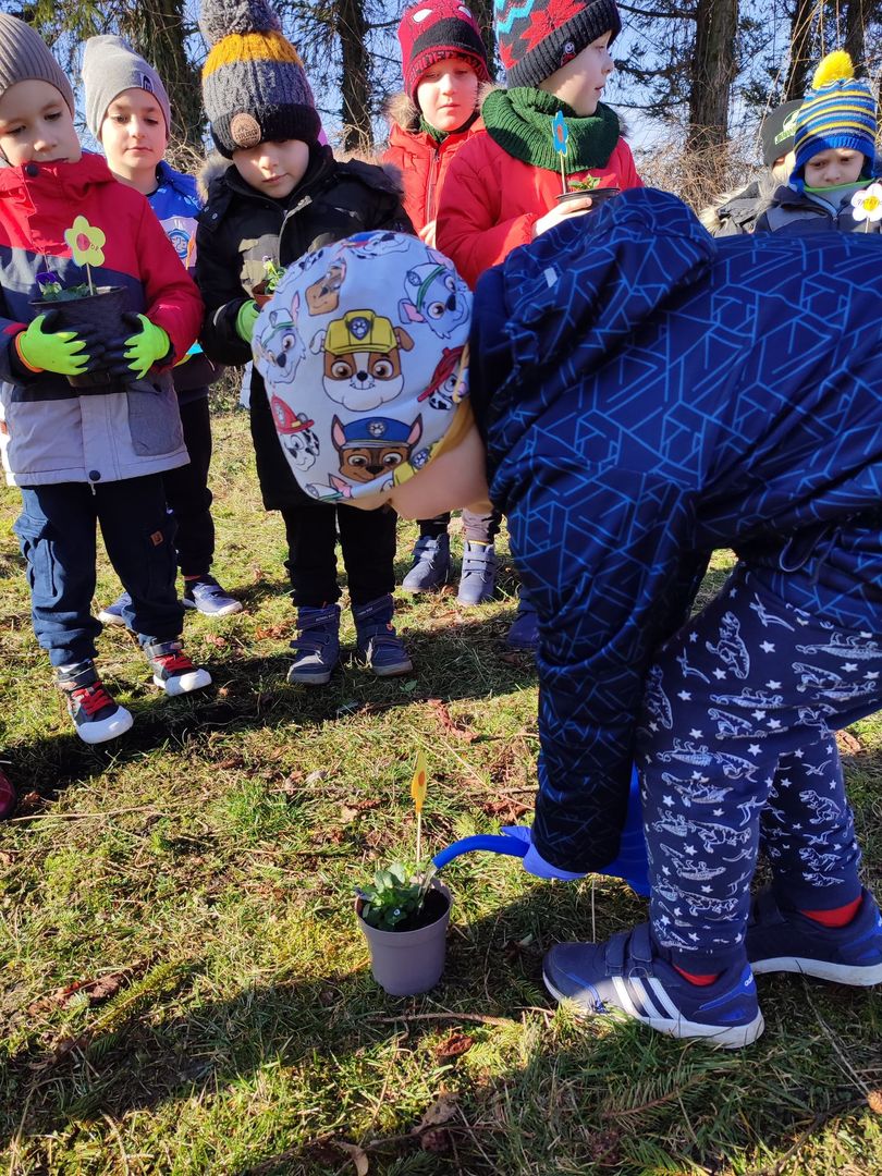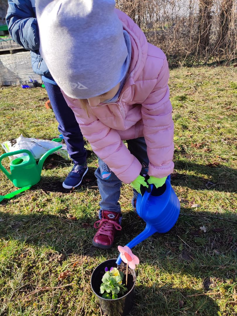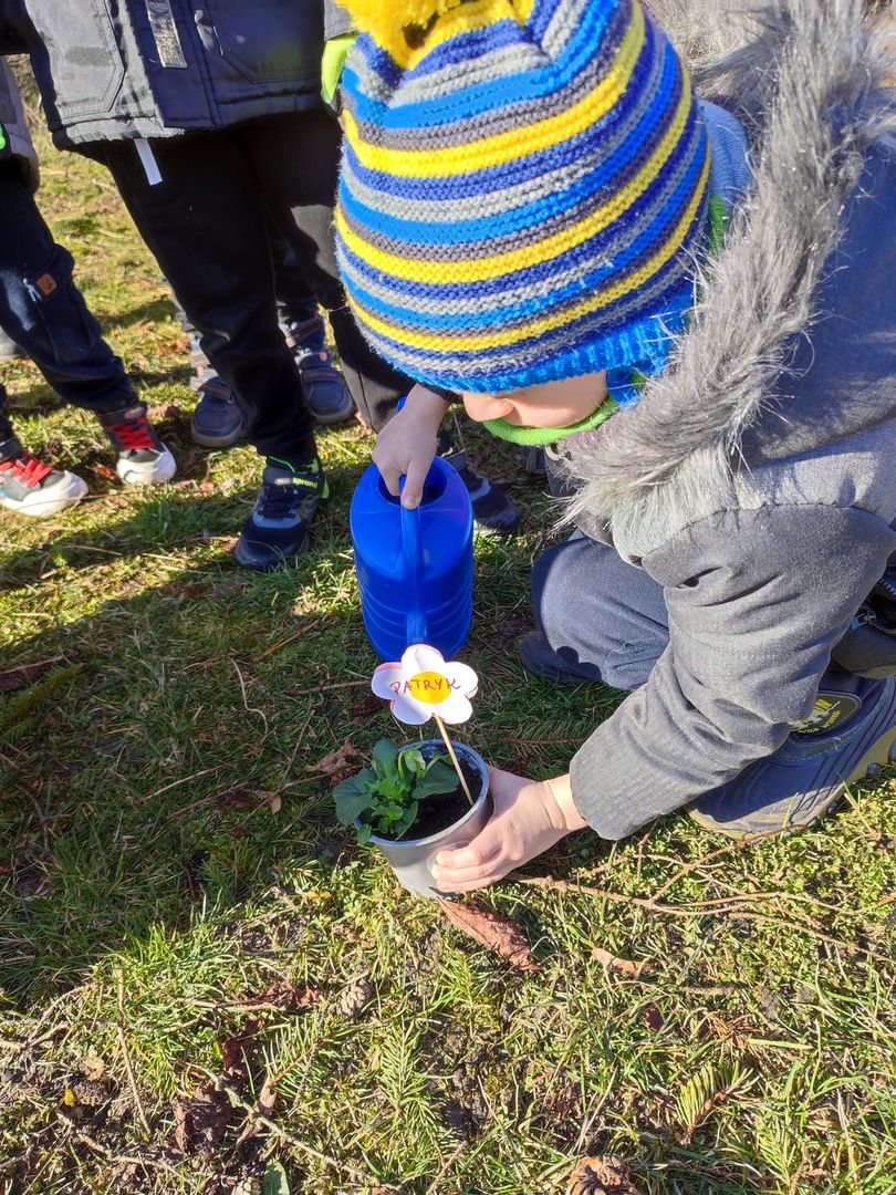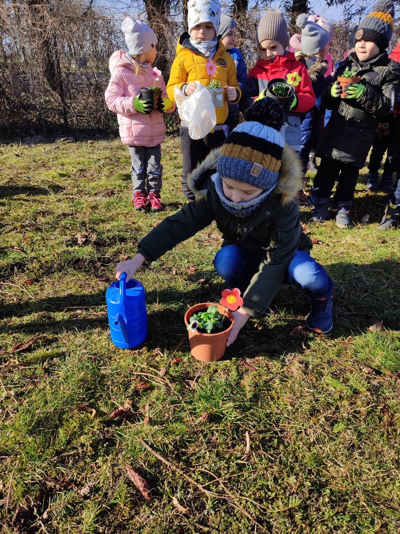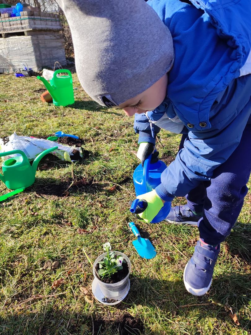 5 –latki w dniu dzisiejszym z niewielką pomocą pań posadziły wiosenne kwiatki - bratki. Celem zajęć było między innymi poszerzenie wiadomości na temat warunków niezbędnych do rozwoju roślin. Mali ogrodnicy nie spodziewali się, że tyle radości może im sprawić sadzenie kwiatków. Dzieci zabierając bratki do domu zobowiązały się codziennej pielęgnacji poprzez podlewanie i doglądanie.