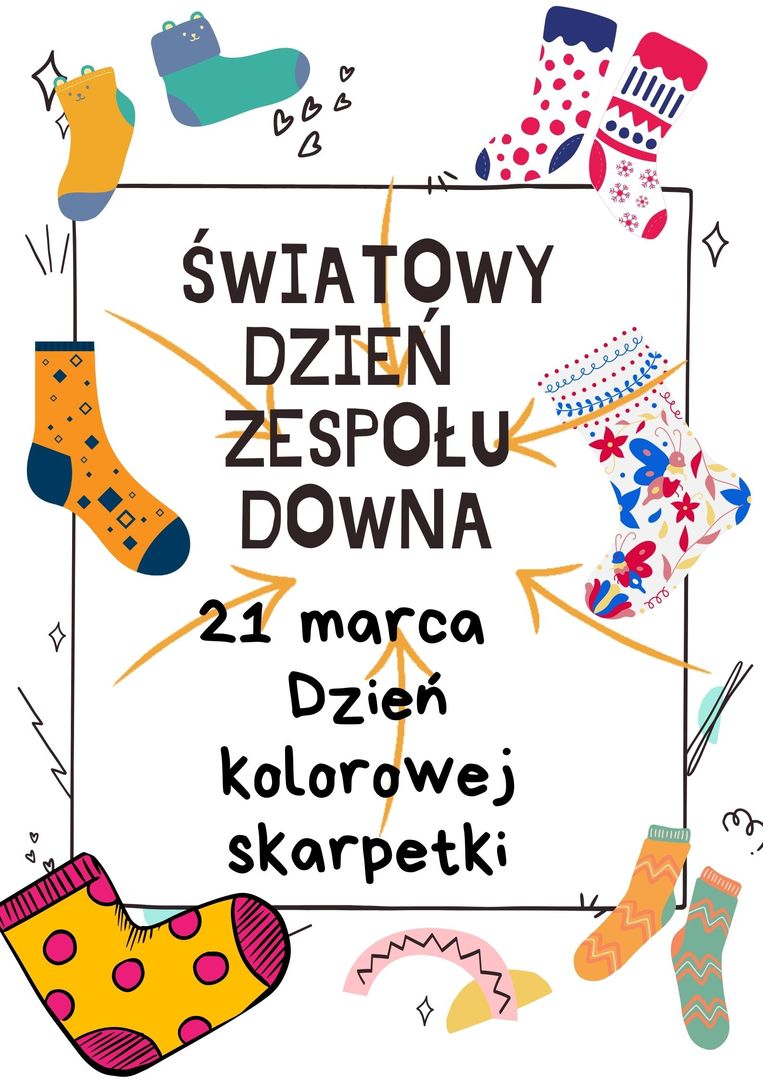 21 marca przypada Światowy Dzień Zespołu Downa. Data nie jest przypadkowa i nawiązuje do obecności u osób z zespołem Downa dodatkowego, trzeciego chromosomu w 21. parze chromosomów.Włączmy się w akcje pokazującą akceptację i zrozumienie. Dajmy osobom z zespołem Downa i ich bliskim czytelny znak naszego zainteresowania i aprobaty. Drobne gesty mają znaczenie, mogą przysłużyć się niwelowaniu barier i przezwyciężaniu krzywdzących stereotypów. Ubierzmy w tym dniu kolorowe skarpetki. Zachęcamy do wzięcia udziału w naszej akcji nauczycieli, obsługę, uczniów oraz przedszkolaków.