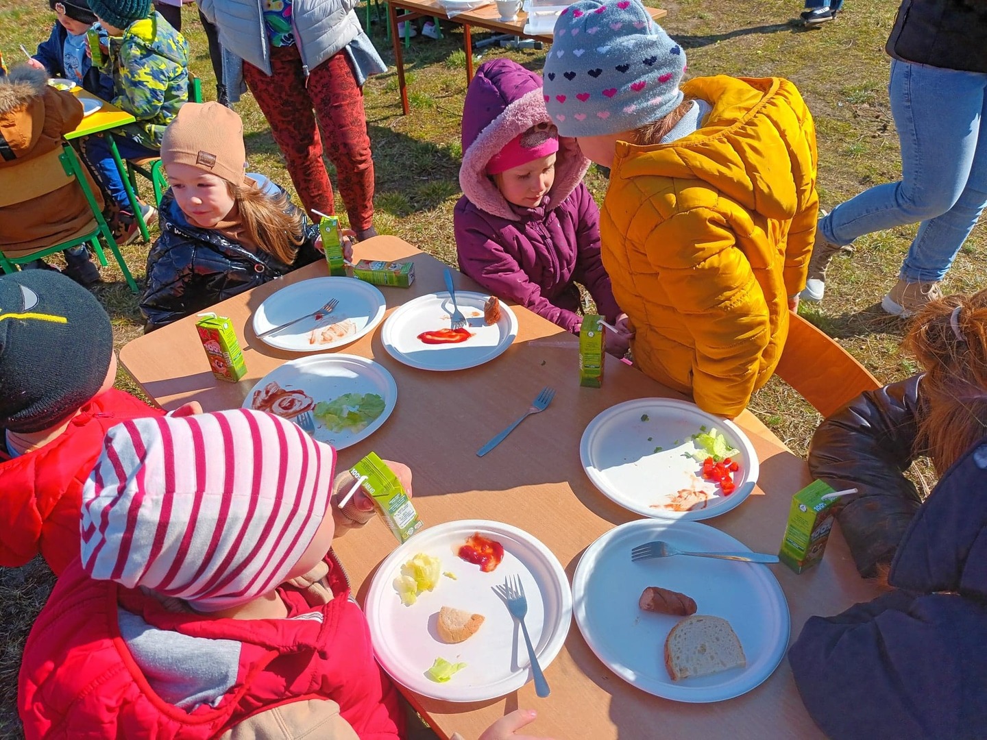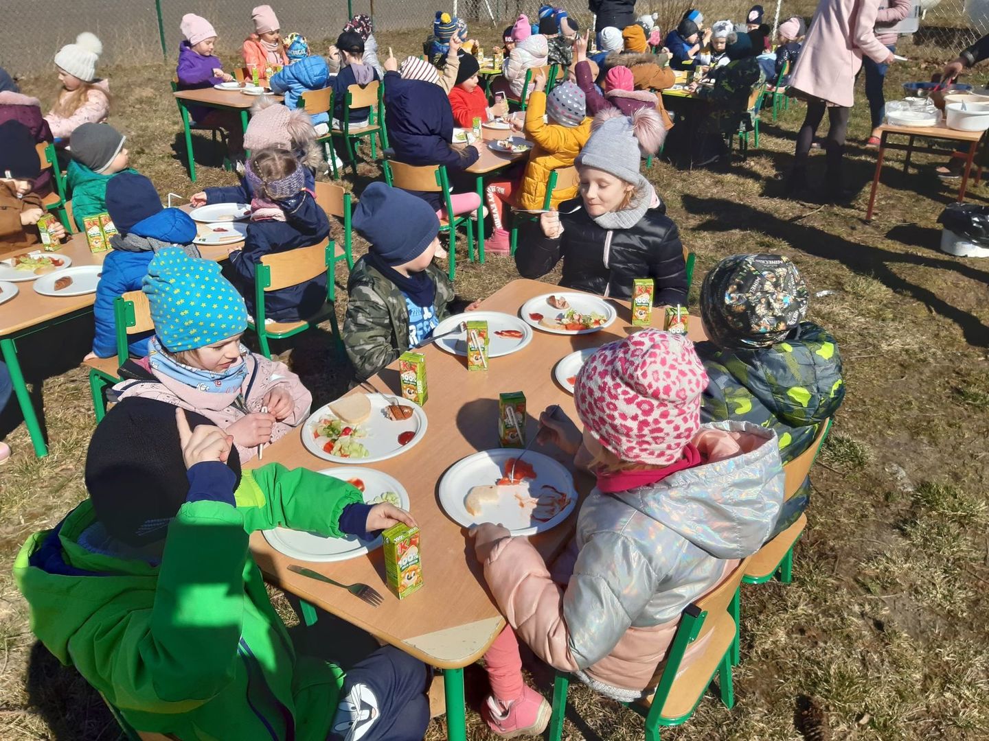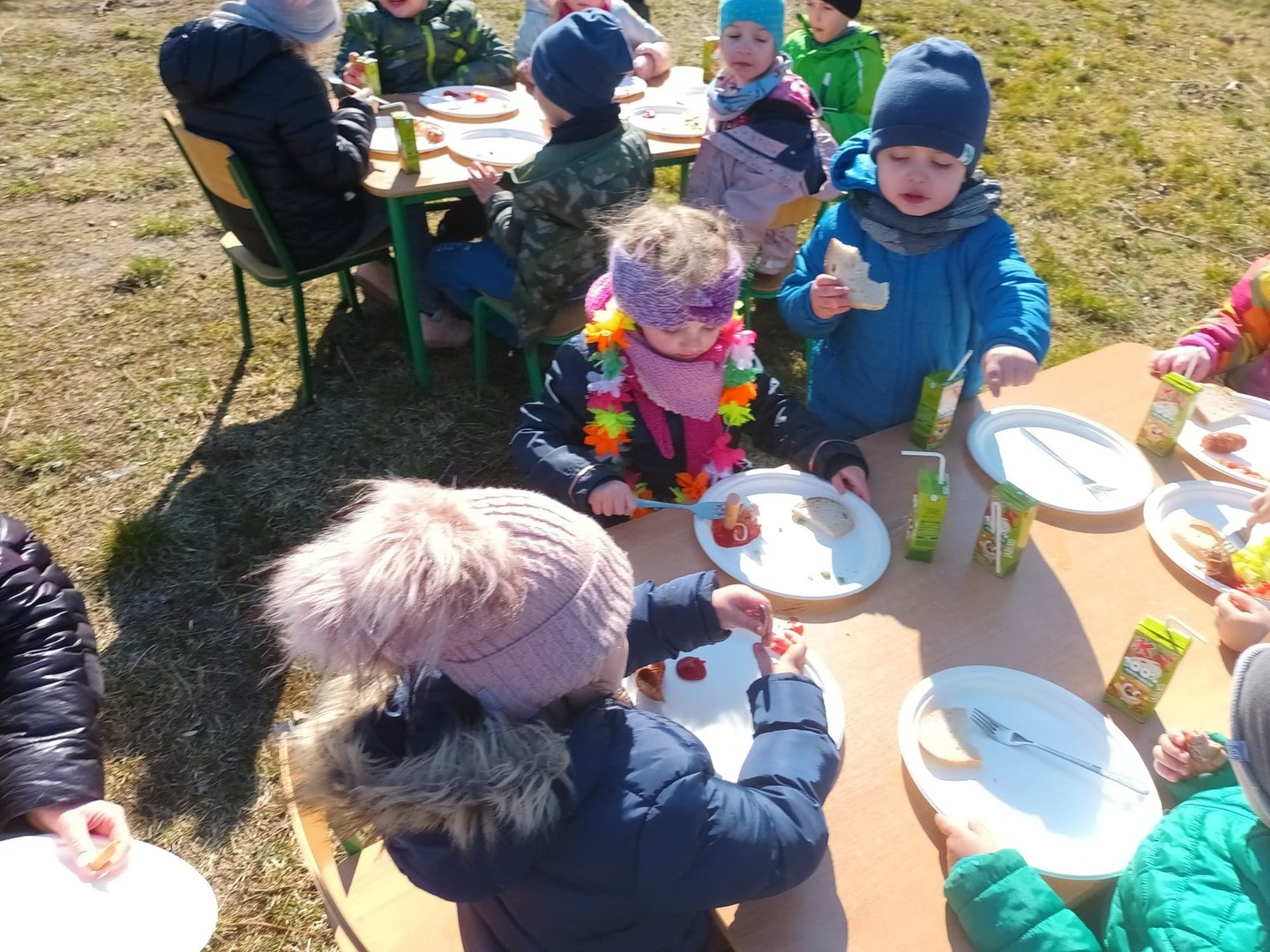 Uroczystość powitania wiosny rozpoczęła się od przygotowania sałatki przez wszystkie grupy przedszkolne. Podczas uroczystości dzieci miały okazję wykazać się znajomością i wiedzą o nadchodzącej porze roku, rozwiązywały zagadki i wykonywały zadania dotyczące wiosny. Mimo wielu atrakcji najbardziej oczekiwaną częścią dnia było wyjście na spacer, podczas którego mogliśmy pożegnać zimę i powitać wiosnę. Dzieci radośnie maszerowały w wiosennym korowodzie. Barwnym pochodem z gaikami wróciliśmy do przedszkola. W ten sposób wszystkie dzieci chciały wyrazić swoją radość z przyjścia nowej pory roku. Na koniec na świeżym powietrzu zjedliśmy kiełbaski oraz przygotowaną wcześniej sałatkę.