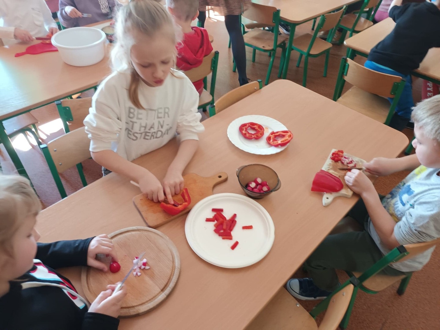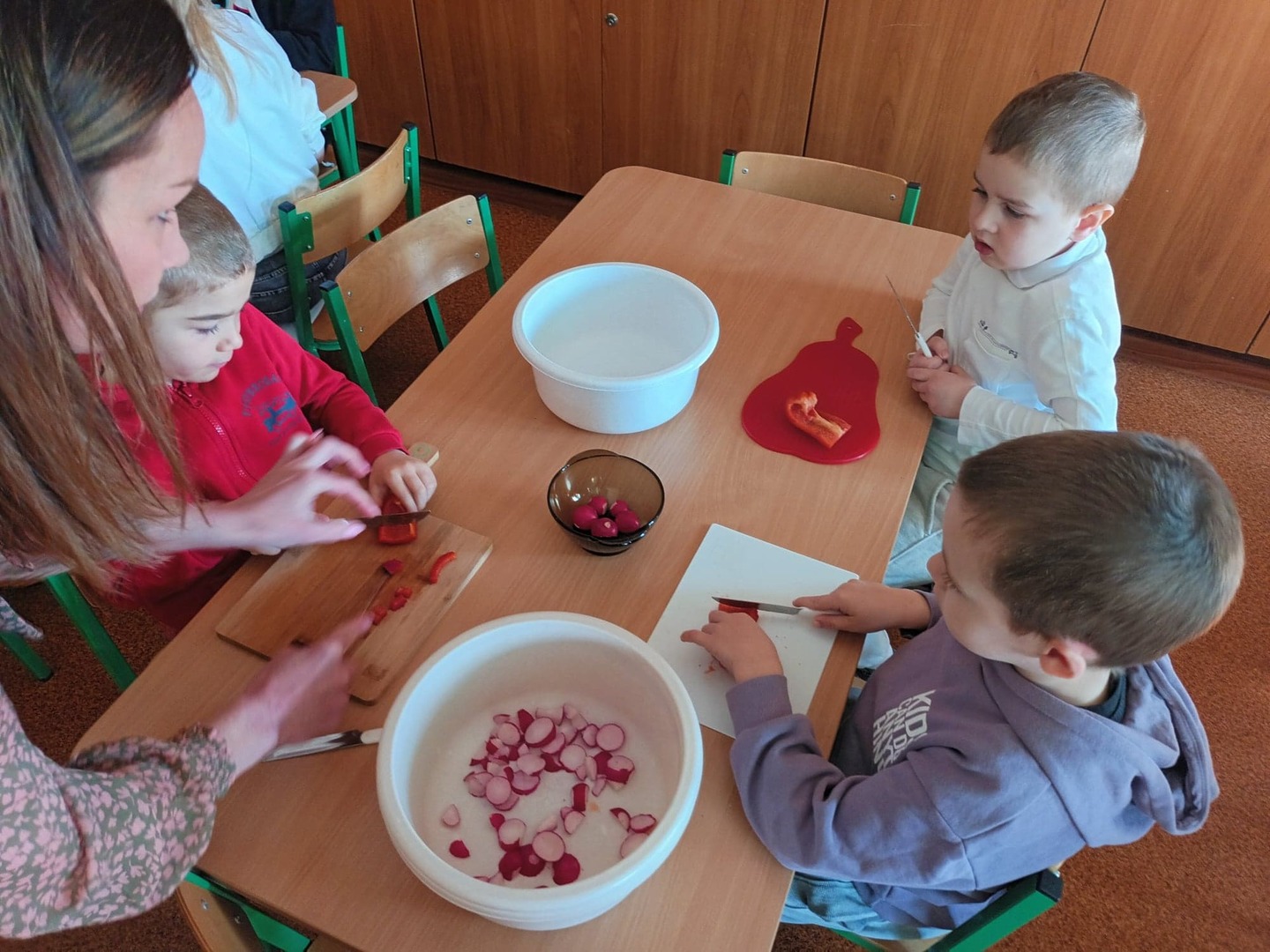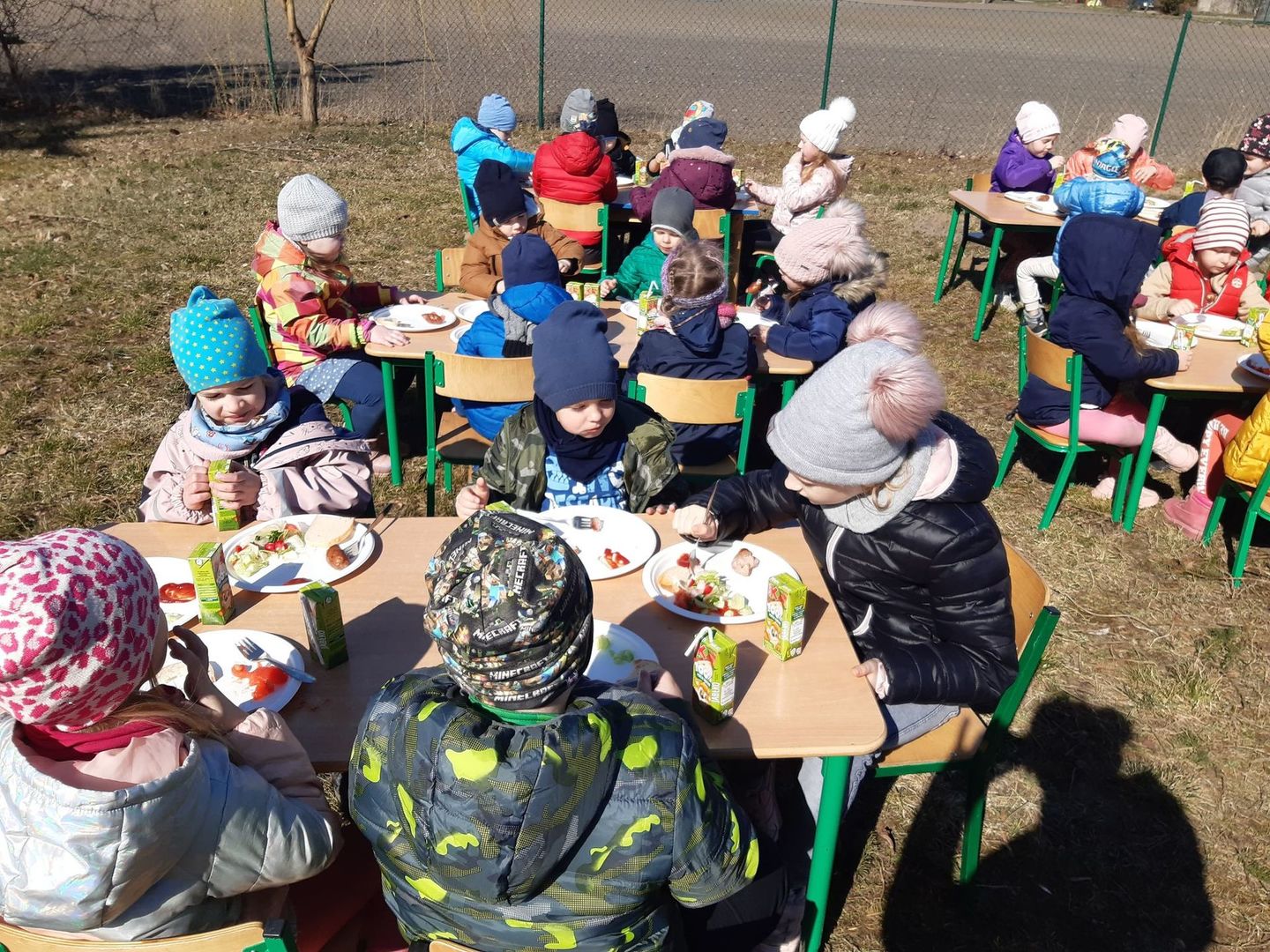 Uroczystość powitania wiosny rozpoczęła się od przygotowania sałatki przez wszystkie grupy przedszkolne. Podczas uroczystości dzieci miały okazję wykazać się znajomością i wiedzą o nadchodzącej porze roku, rozwiązywały zagadki i wykonywały zadania dotyczące wiosny. Mimo wielu atrakcji najbardziej oczekiwaną częścią dnia było wyjście na spacer, podczas którego mogliśmy pożegnać zimę i powitać wiosnę. Dzieci radośnie maszerowały w wiosennym korowodzie. Barwnym pochodem z gaikami wróciliśmy do przedszkola. W ten sposób wszystkie dzieci chciały wyrazić swoją radość z przyjścia nowej pory roku. Na koniec na świeżym powietrzu zjedliśmy kiełbaski oraz przygotowaną wcześniej sałatkę.