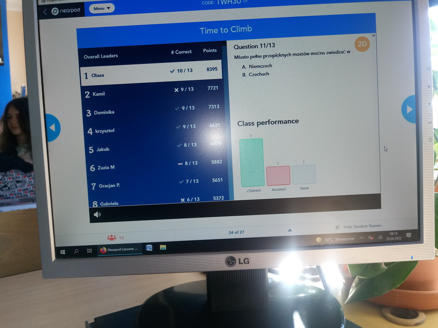 29 kwietnia br. po raz czwarty odbył się Dzień Nowych Technologii w Edukacji. To inicjatywa Ministerstwa Edukacji i Nauki, której celem jest popularyzowanie technologii informacyjno-komunikacyjnych w pracy dydaktycznej. W tym roku również nasza szkoła wzięła udział w akcji, bowiem klasa 6 podczas zajęć z geografii korzystając z zasobów multimedialnych naszej szkoły, wykorzystała do swej pracy aplikację NEARPOD. Lekcja dotyczyła stosunków Polski z jej najbliższymi sąsiadami oraz współpracy w ramach różnych organizacji m.in. Unii Europejskiej czy Grupy Wyszehradzkiej oraz Euroregionów. Uczniowie po krótkiej prezentacji najważniejszych informacji na temat Niemiec, Czech, Słowacji, Ukrainy, Białorusi, Litwy oraz Rosji mieli za zadanie zagrać w Memory Test z flagami państw oraz rywalizować w grze Time to Climb. Rywalizacja była zacięta aż do ostatniego pytania. Jeśli ktoś ma ochotę zobaczyć jak wygląda ta lekcja zapraszamy:)