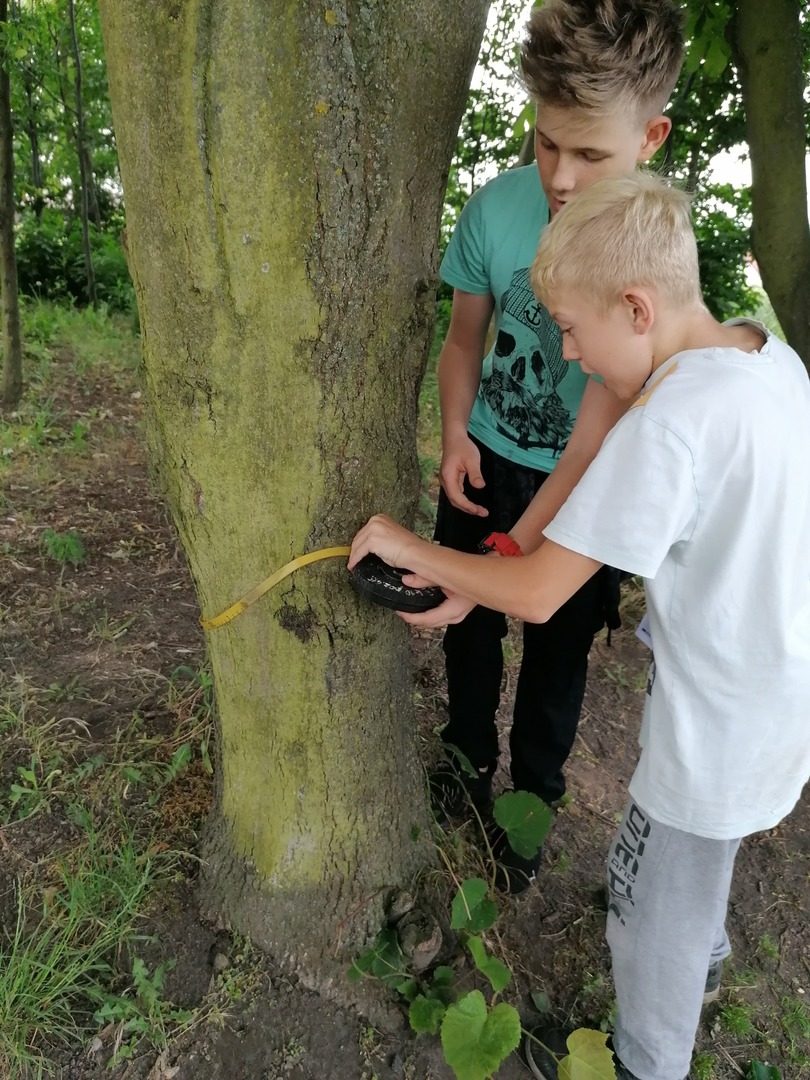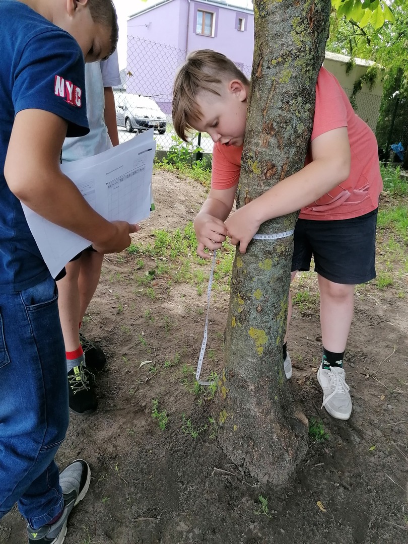 Na lekcji biologii uczniowie klasy V wybrali się na zajęcia w terenie. Przy pomocy atlasu drzew rozpoznawali drzewa liściaste znajdujące się na terenie naszej szkoły. Korzystając z miary uczniowie określali przybliżony wiek drzew, mierząc obwód pnia.
