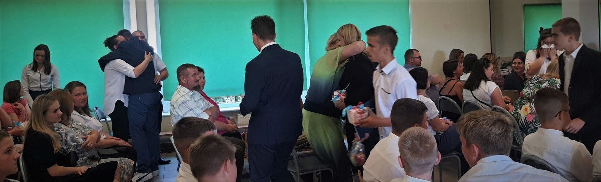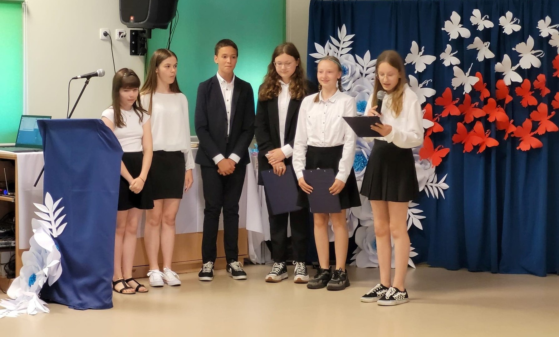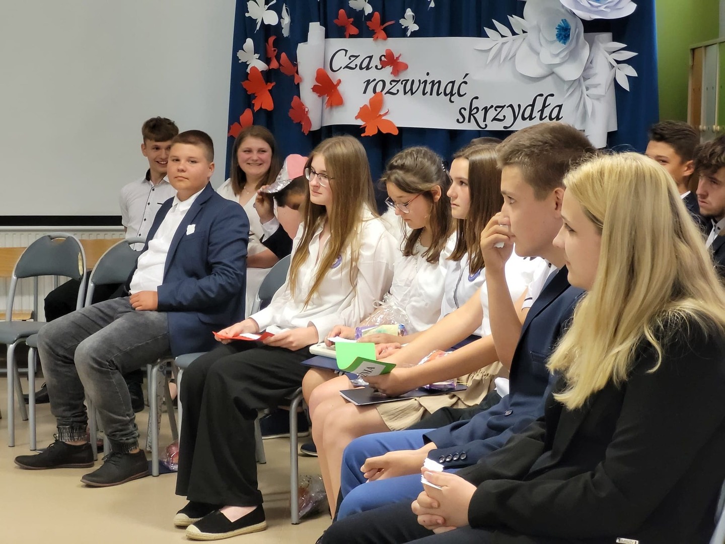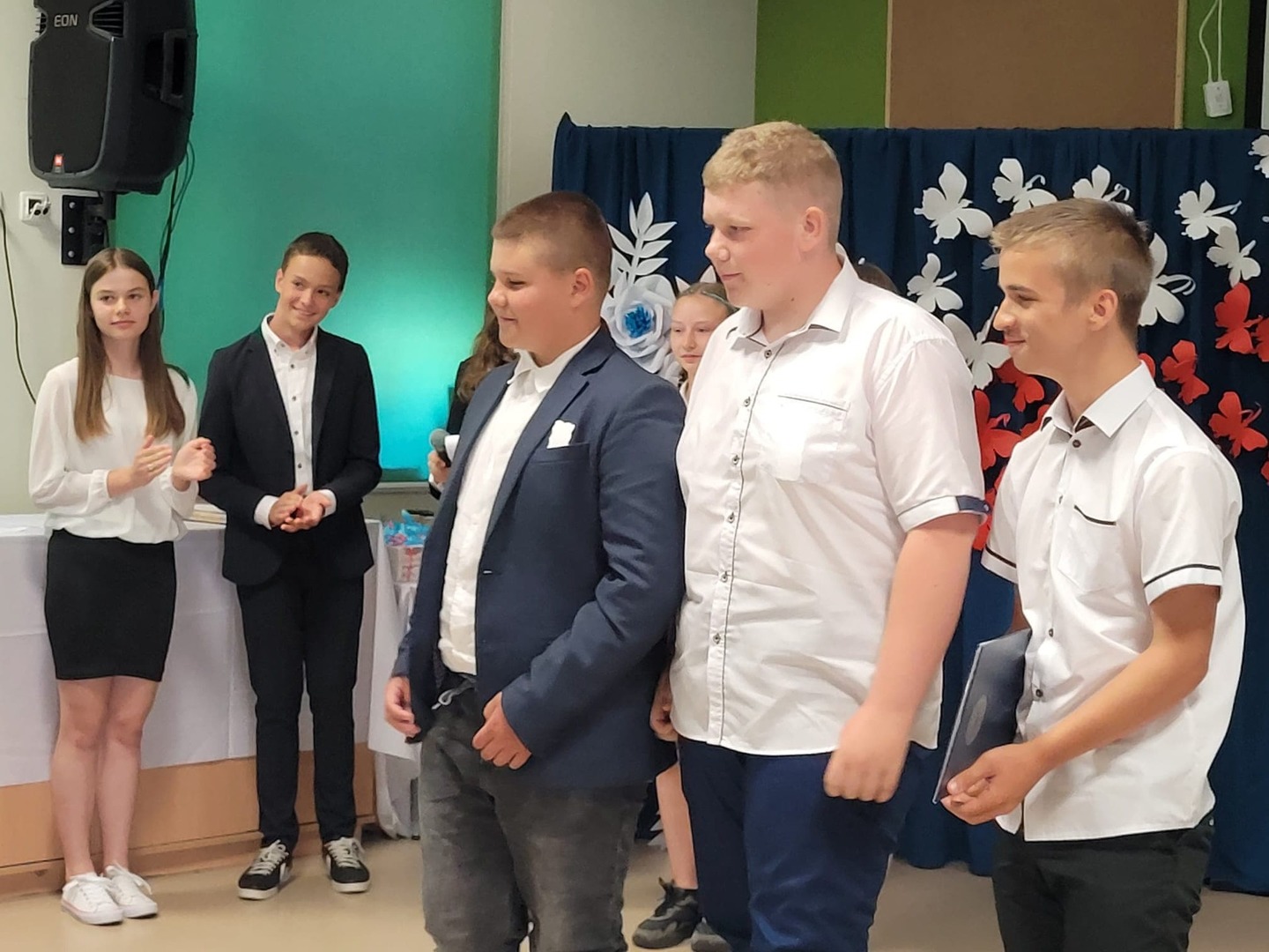 To było bardzo wzruszające pożegnanie ósmej klasy. Ostatni raz w uroczystych strojach, ostatni raz odśpiewany przez nich hymn w naszej szkole, ostatni raz wręczane nagrody, świadectwa, podziękowania dla najstarszych uczniów i ich rodziców. Mamy nadzieję, że z chęcią odwiedzicie nas nie raz :).