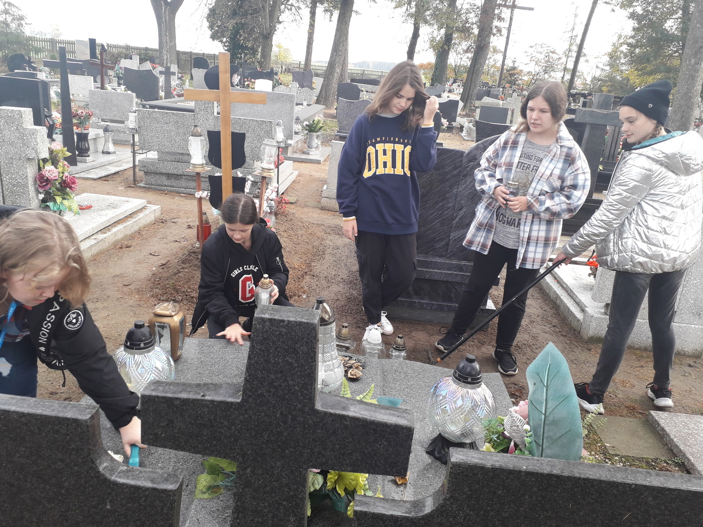 Koło Historyczne naszej szkoły z okazji zbliżającego się święta zmarłych uczciło pamięć o lokalnych bohaterach. W miniony poniedziałek udało się na cmentarz parafialny, aby uporządkować groby osób biorących udział w zwycięskim powstaniu wielkopolskim oraz zapalić znicz pamięci.