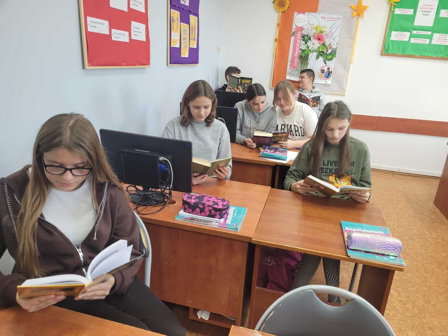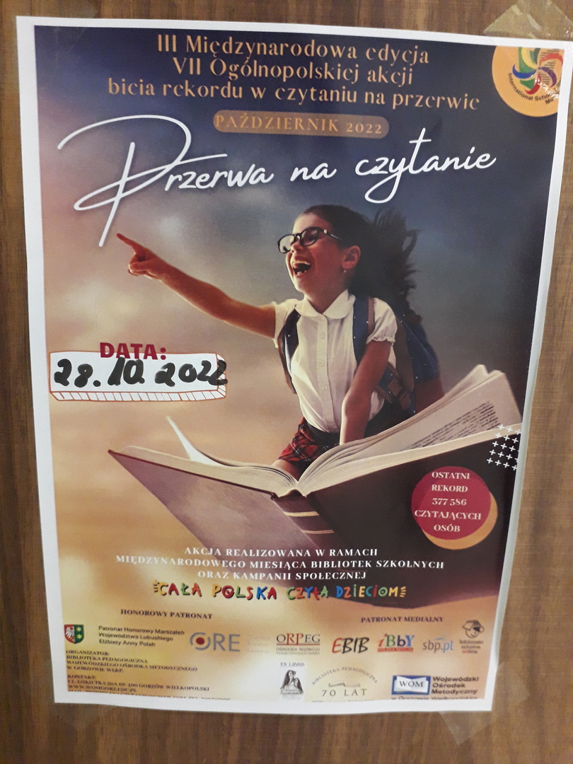 To właśnie dziś, podczas zajęć lekcyjnych zrobiliśmy sobie przerwę na czytanie... Wzięliśmy tym samym, po raz drugi, udział w III Międzynarodowej a VII Ogólnopolskiej akcji bicia rekordu w liczbie osób czytających na przerwie pt. Przerwa na czytanie – bicie rekordu w czytaniu na przerwie, organizowanego w ramach obchodu Miesiąca Bibliotek Szkolnych. Biblioteka szkolna w dniu dzisiejszym cieszyła dużym zainteresowaniem młodych czytelników, a czytał każdy kto miał na to ochotę. Poniżej fotorelacja z naszego małego święta czytelniczego. Wszystkim biorącym udział serdecznie dziękujemy i zapraszamy w następnej edycji już za rok. Niech będzie nas jeszcze więcej!