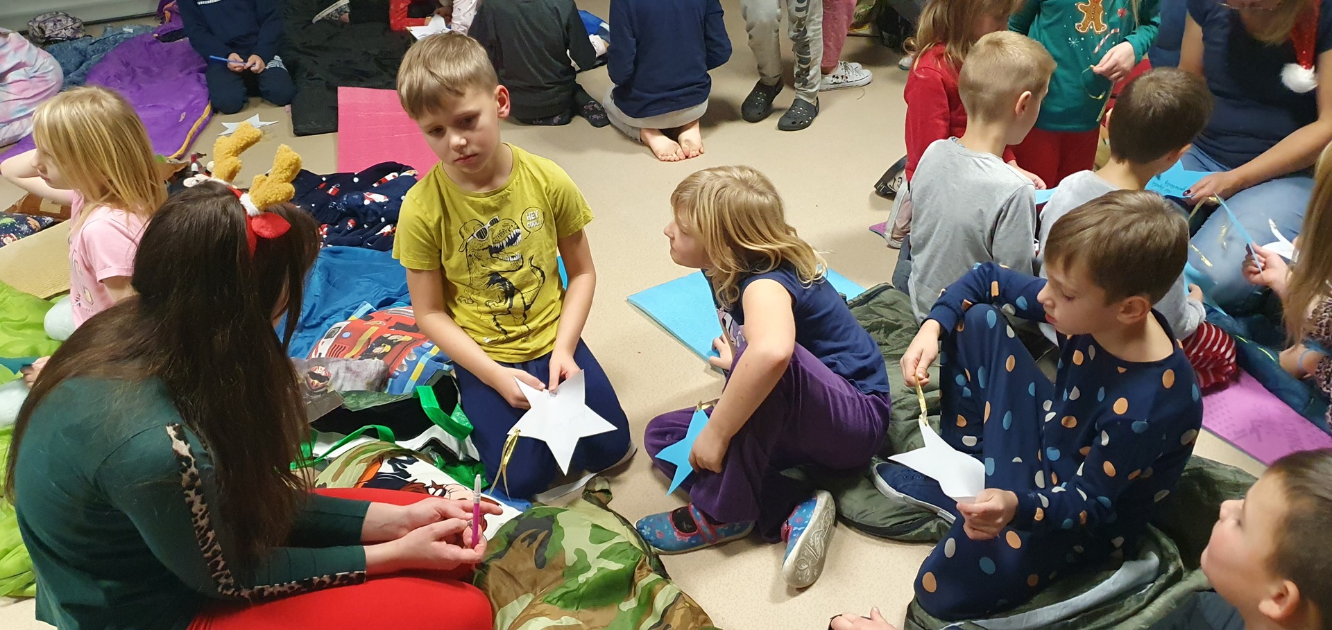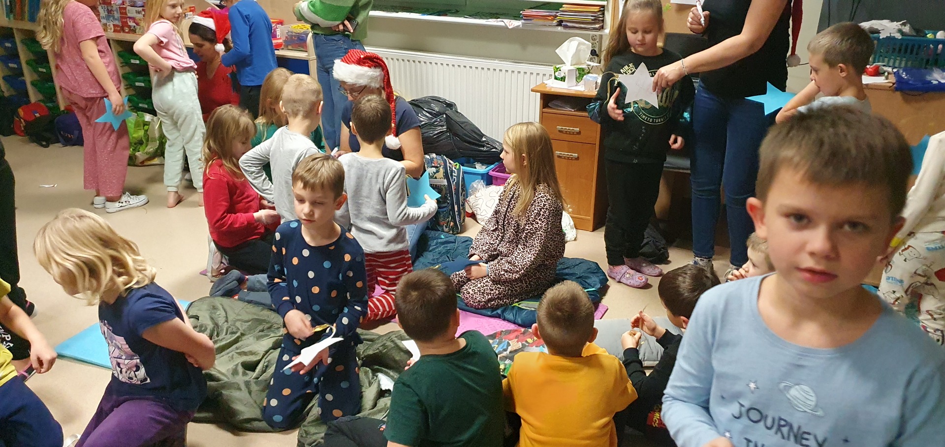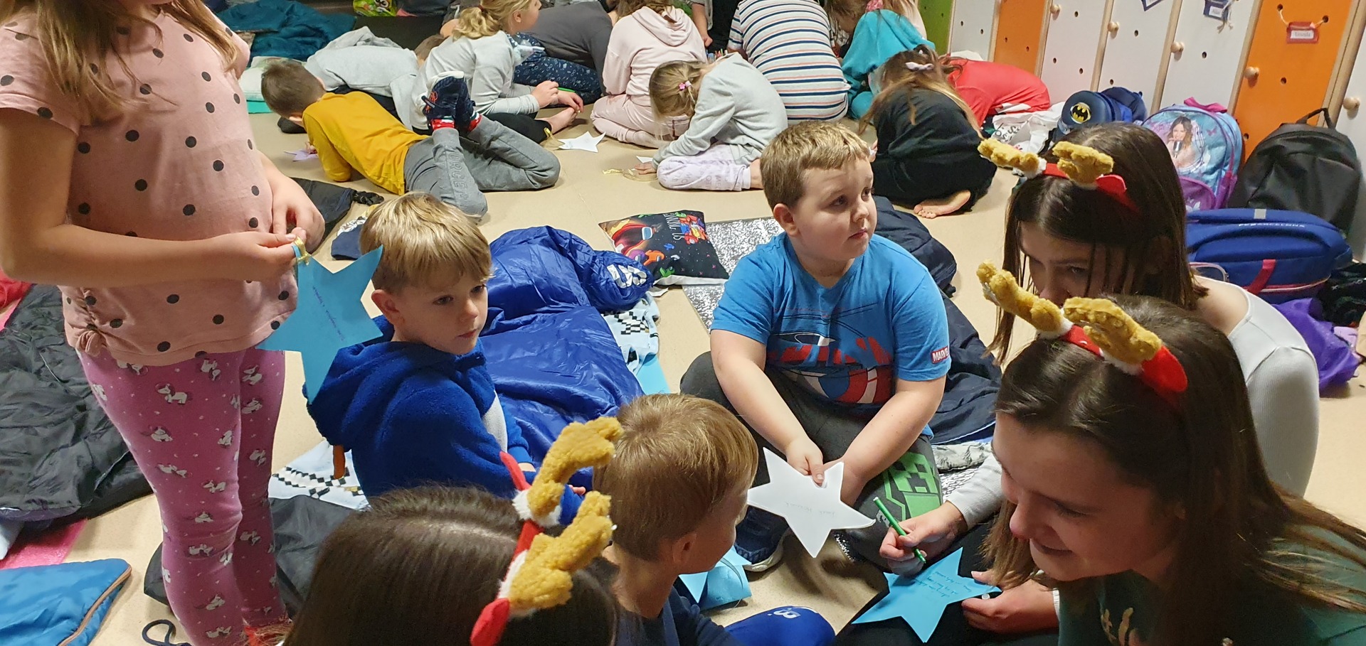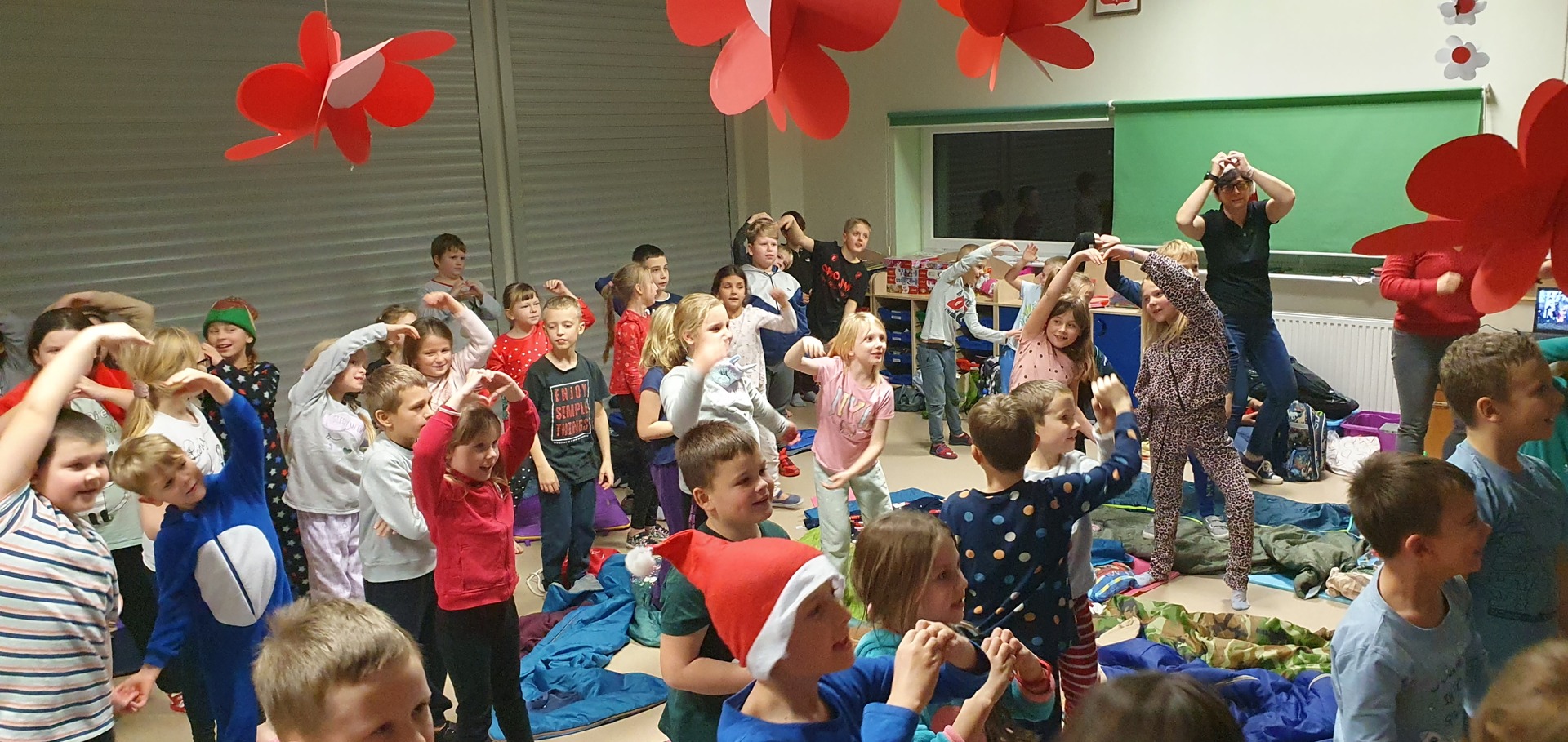 W tym roku udało się! Nasza coroczna tradycja nocnego mikołajkowego czuwania połączonego z licznymi warsztatami, zabawami i świątecznym kinem odbyła się bez przeszkód. Długo wyczekiwane nocowanie w szkole spotkało się z sympatycznym przyjęciem zarówno dzieci jak i rodziców :). Już o g.17.00 rozpoczęliśmy wspólnymi zabawami integracyjnymi. Następnie przyszedł czas na świąteczne warsztaty plastyczne i piernikowe wypieki. Było bajecznie kolorowo! Wspólna kolacja, bajkowo-świąteczne kino... i oczywiście czuwanie prawie do białego rana - wyczekiwanie Św. Mikołaja! Już byliśmy zrezygnowani, wielu przysnęło ... gdy do sal przybyły płaczące, lamentujące reniferki, które oświadczyły że świąt nie będzie :( ... Św. Mikołaj został porwany! Na całe szczęście po wykonaniu zadań, które postawiły przed dziećmi złe diabełki - został uwolniony. Zmęczeni, ale szczęśliwi uczniowie przysnęli ... a rano w ich czyściutkich bucikach w podziękowaniu za uwolnienie św. Mikołaj pozostawił słodki upominek. Więcej takich spotkań!