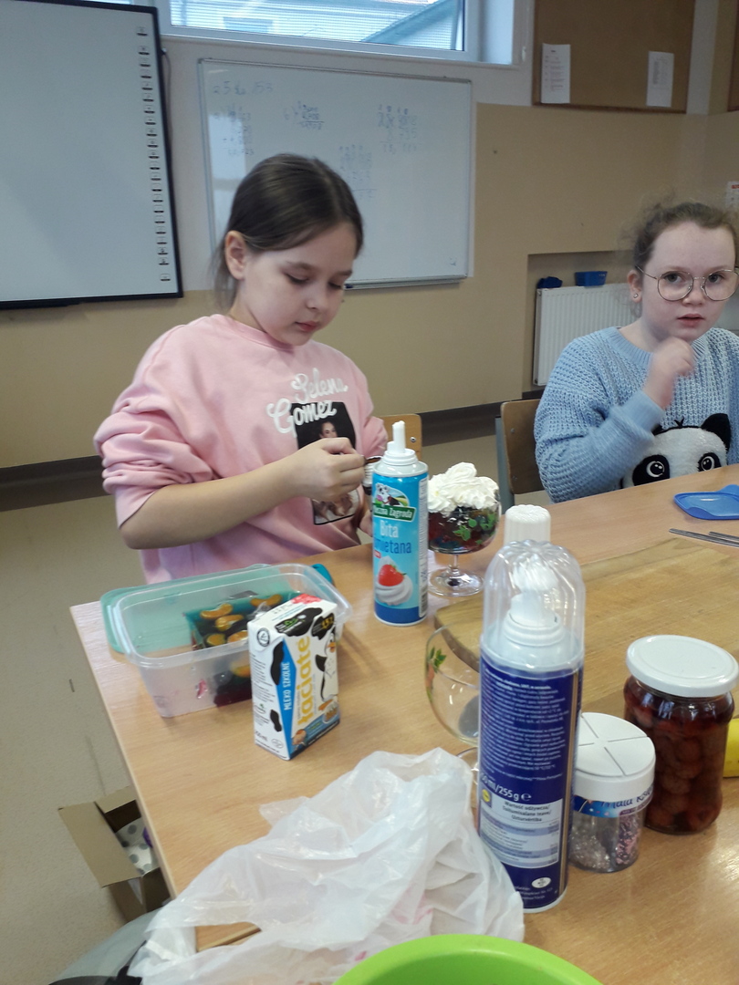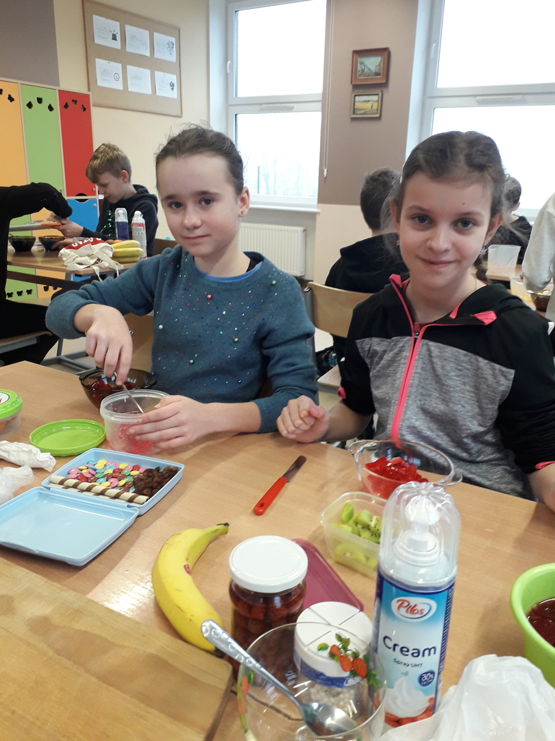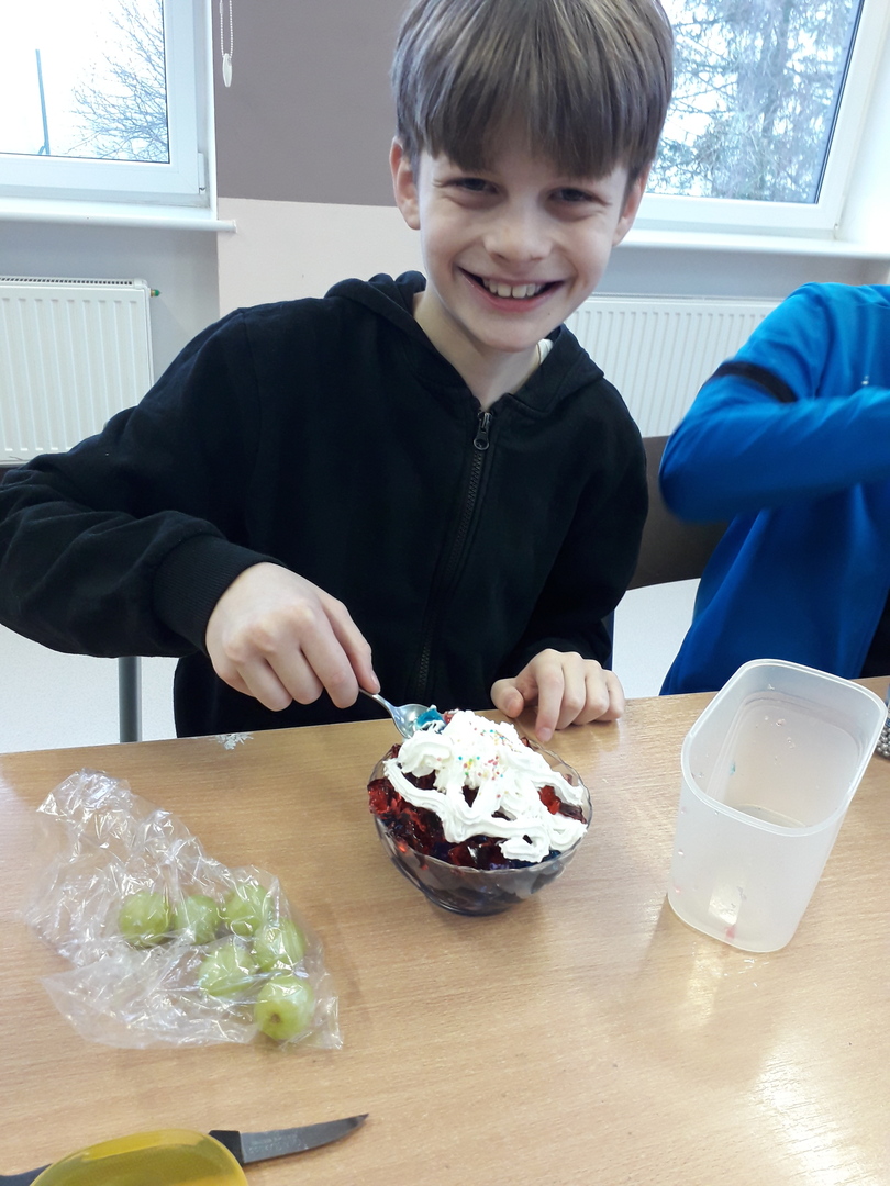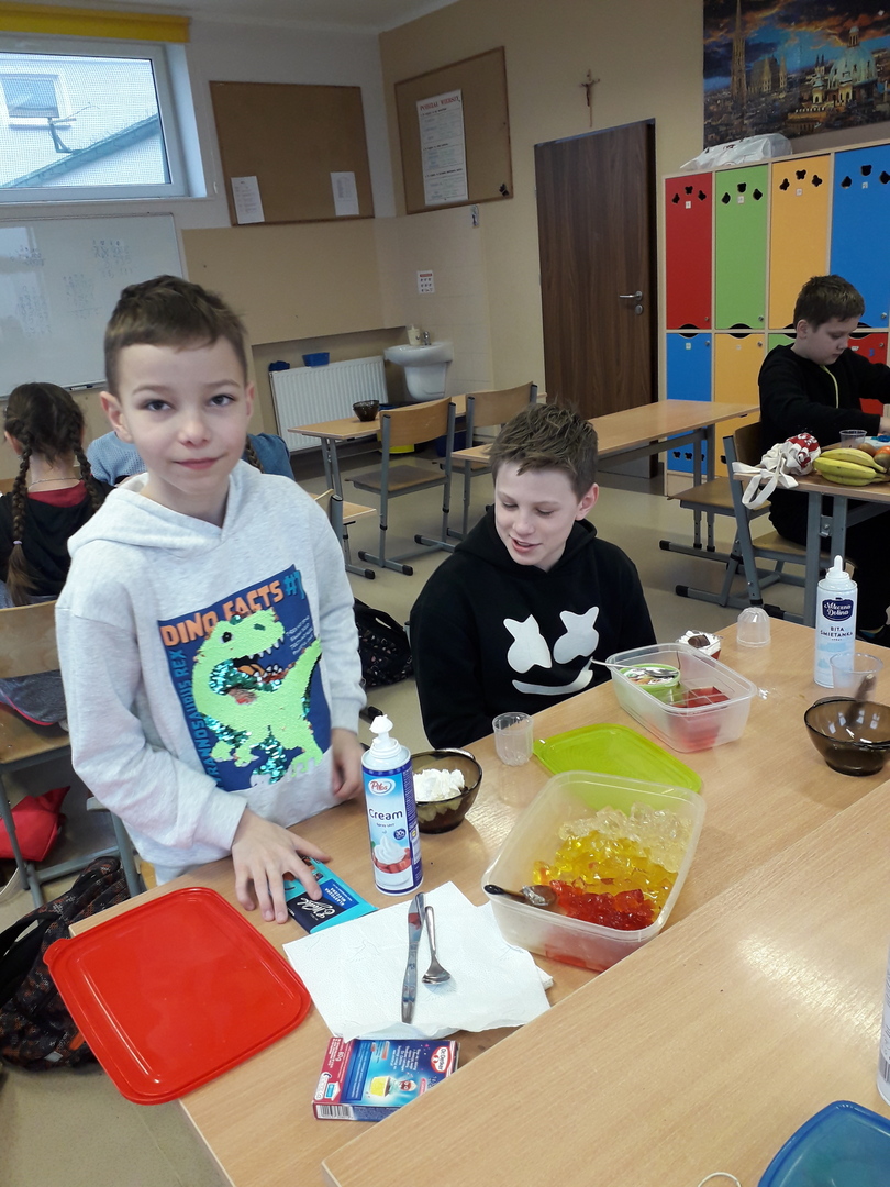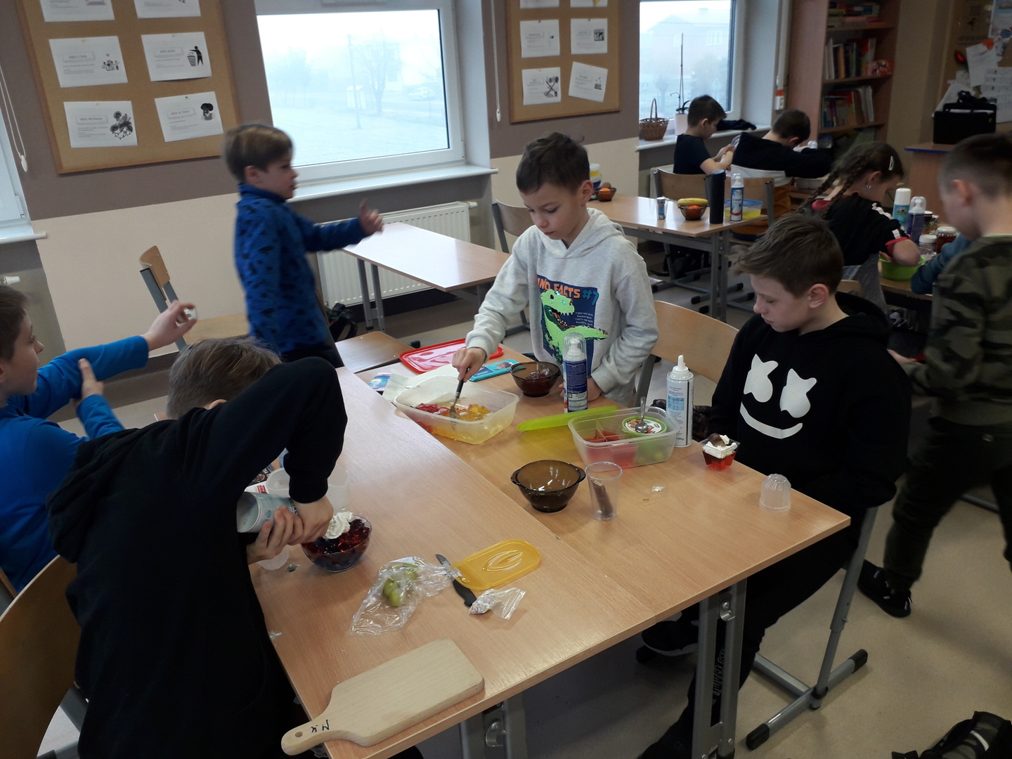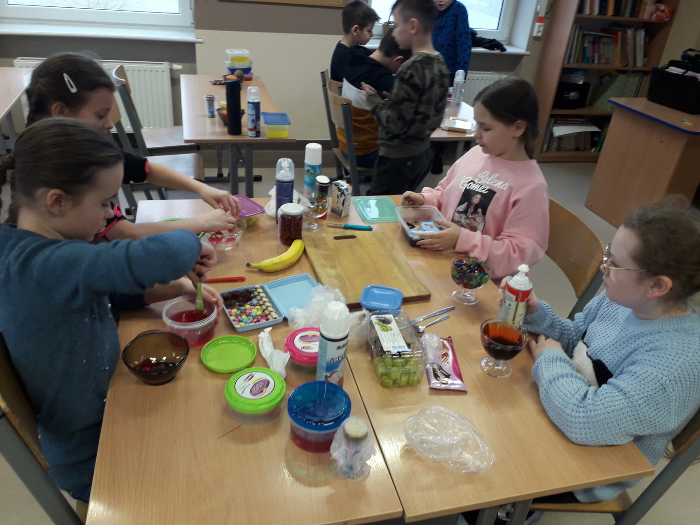 W ramach zjęć świetlicowych staramy się rozwijać zainteresowania naszych podopiecznych. W środy dzieci uczestniczą w warsztatach z robotyki, zaś w czwartki rozwijamy nasze pasje kulinarne oraz bawimy się gwarą poznańską. Były już pyszne tortille, hot-dogi, sandwiche czy pizza. Natomiast, w tym tygodniu chętni uczniowie pobawili się w cukierników robiąc przepyszne desery. Poza deserami owocowymi pojawiła się niezliczona ilość galaretki oraz bitej śmietany. Po kalorycznym posiłku czekał nas spacer po okolicy i zabawy na boisku szkolnym.