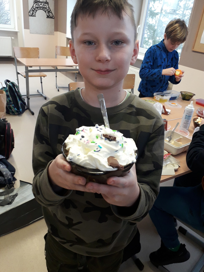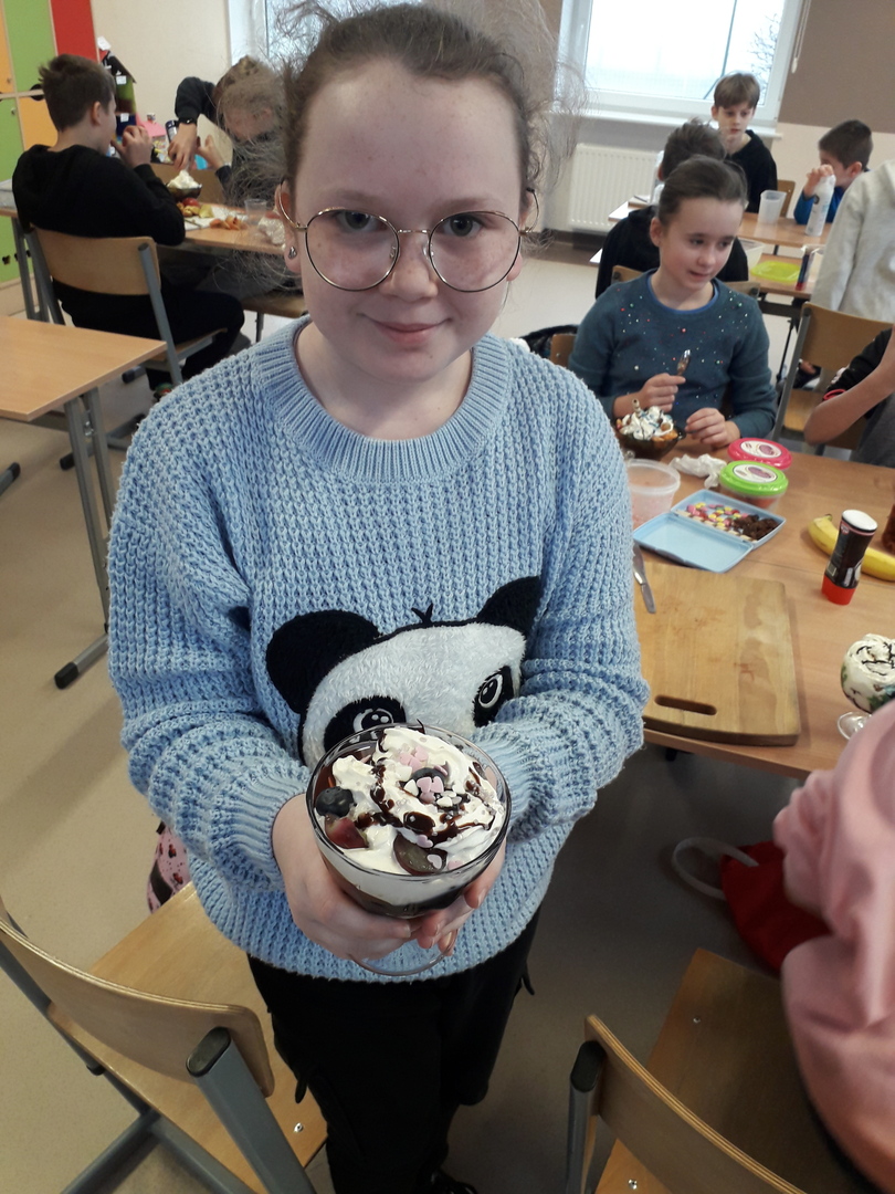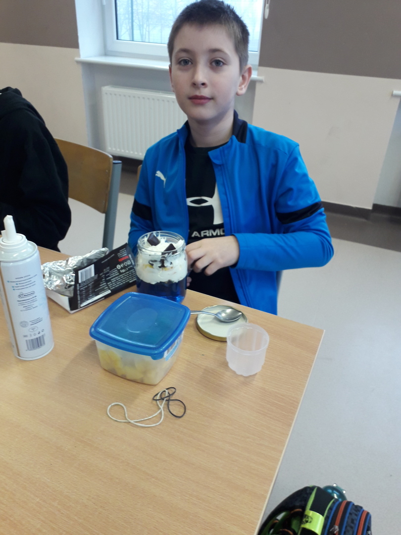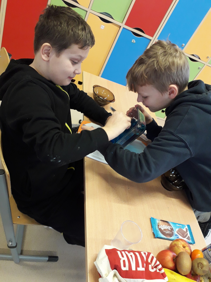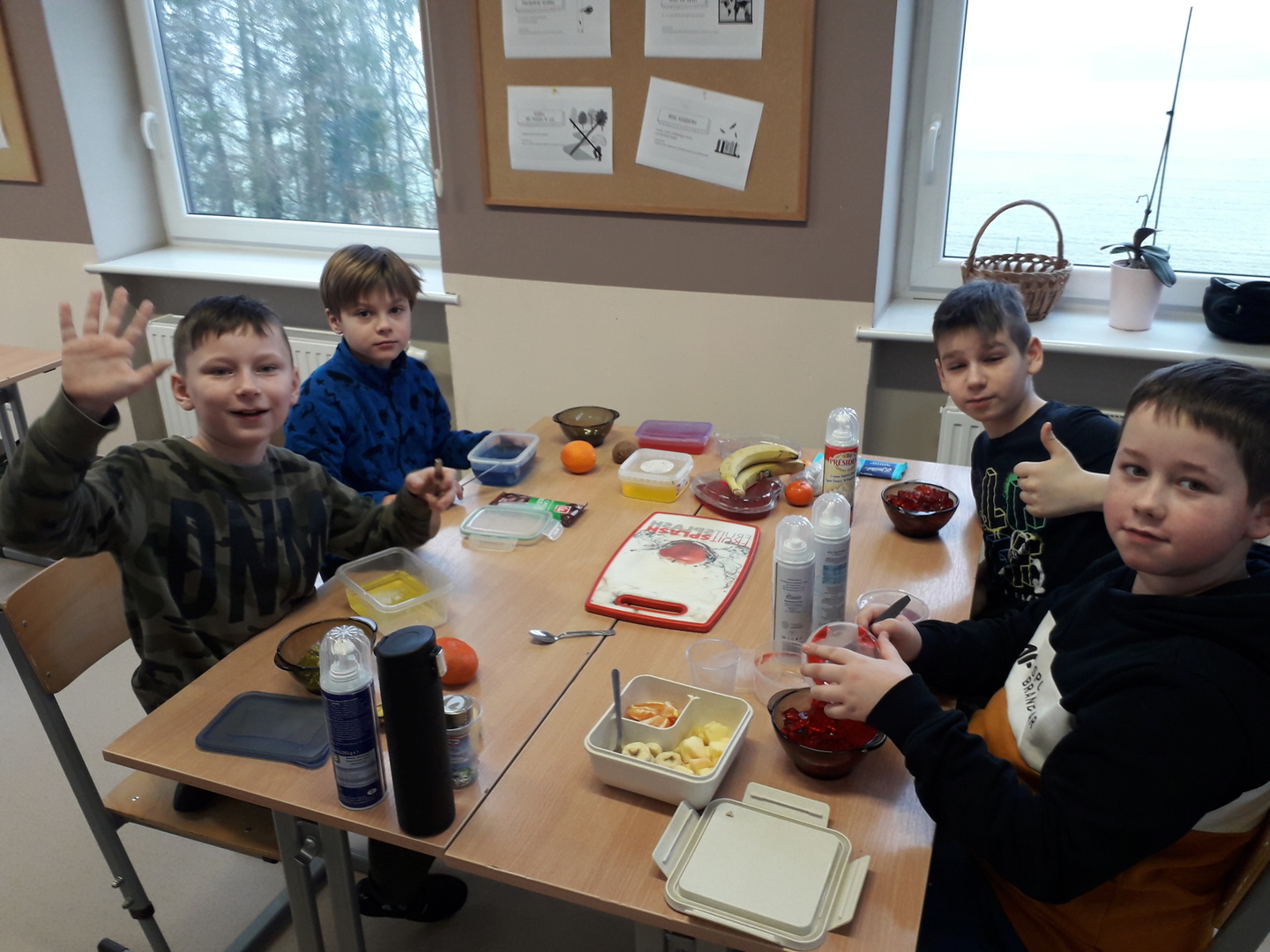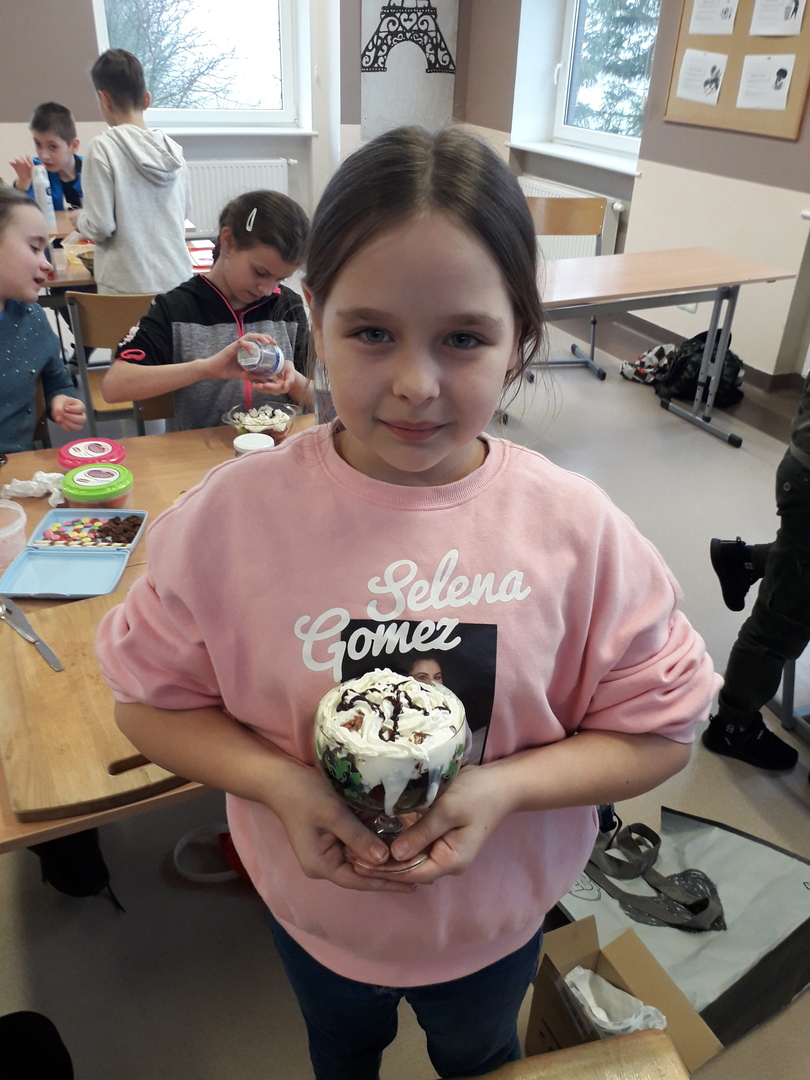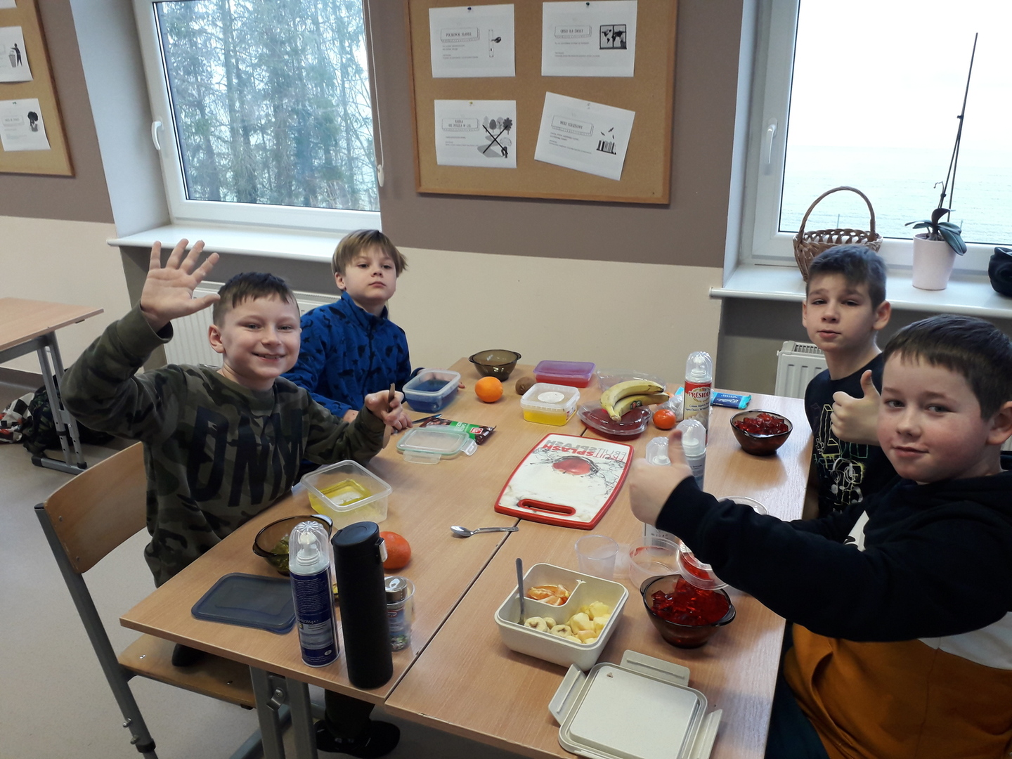 W ramach zjęć świetlicowych staramy się rozwijać zainteresowania naszych podopiecznych. W środy dzieci uczestniczą w warsztatach z robotyki, zaś w czwartki rozwijamy nasze pasje kulinarne oraz bawimy się gwarą poznańską. Były już pyszne tortille, hot-dogi, sandwiche czy pizza. Natomiast, w tym tygodniu chętni uczniowie pobawili się w cukierników robiąc przepyszne desery. Poza deserami owocowymi pojawiła się niezliczona ilość galaretki oraz bitej śmietany. Po kalorycznym posiłku czekał nas spacer po okolicy i zabawy na boisku szkolnym.
