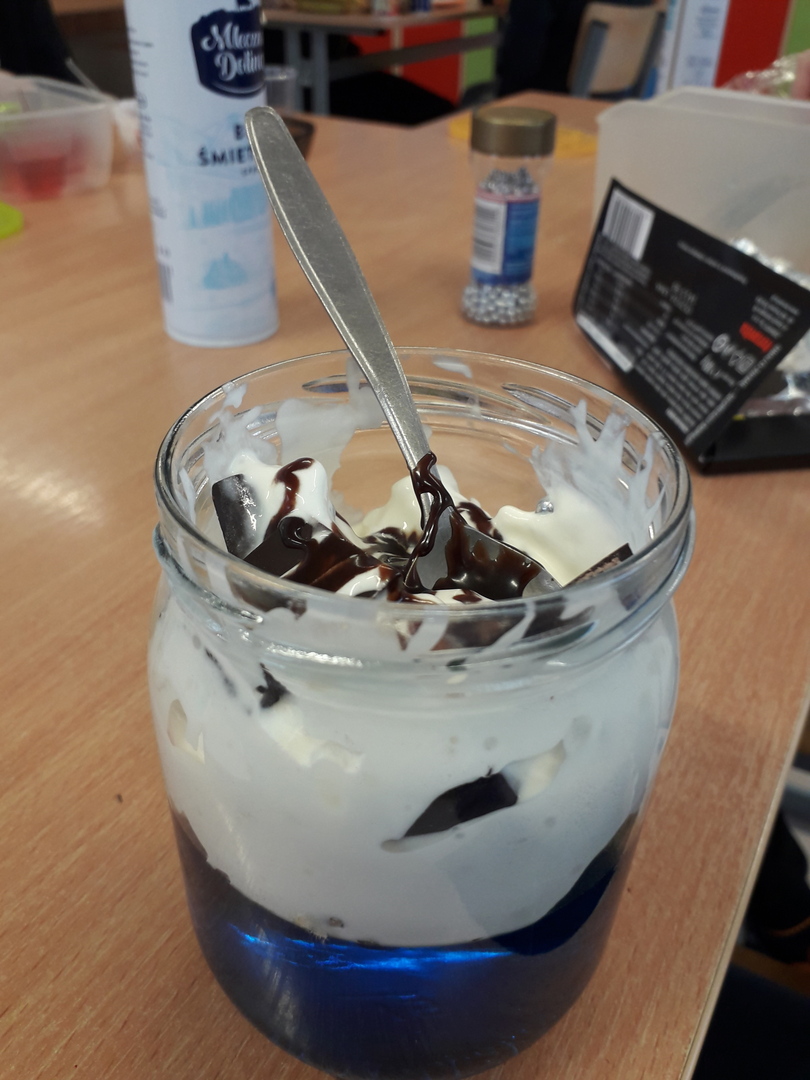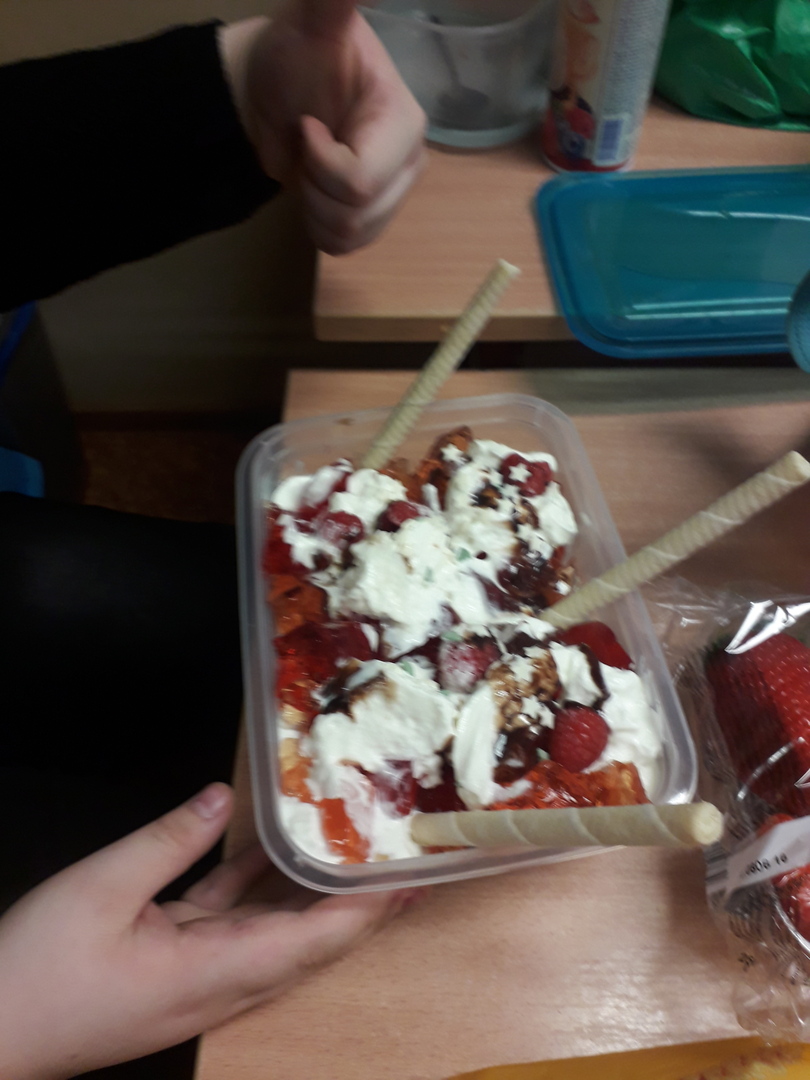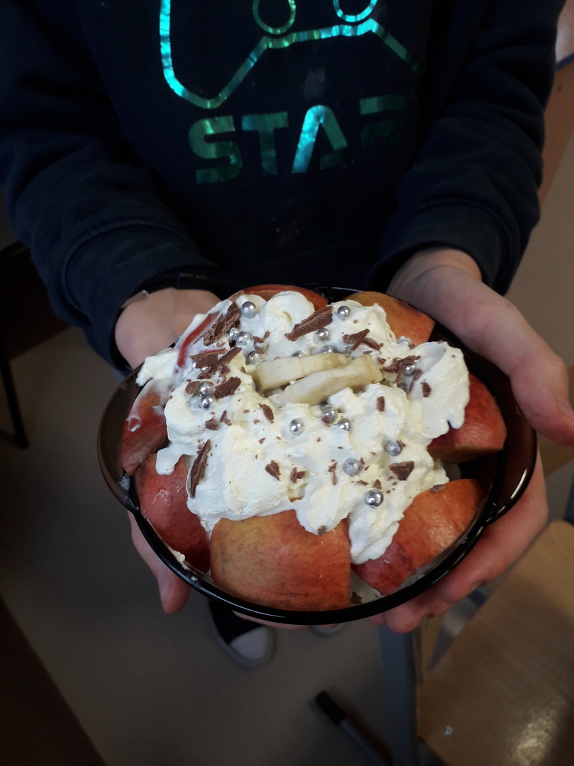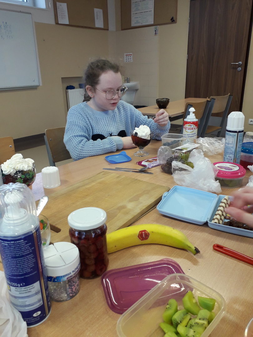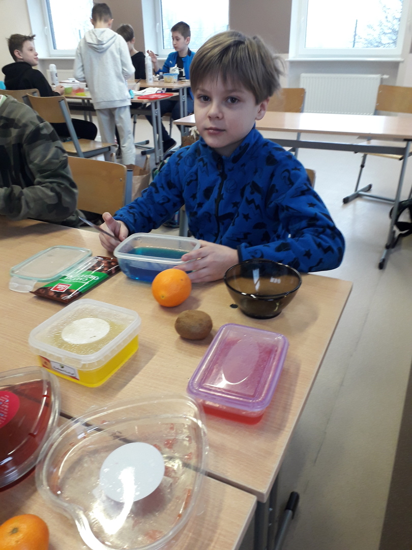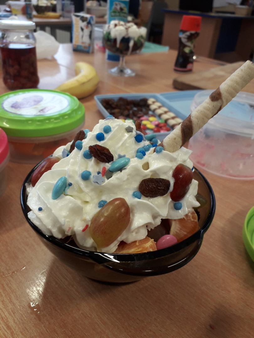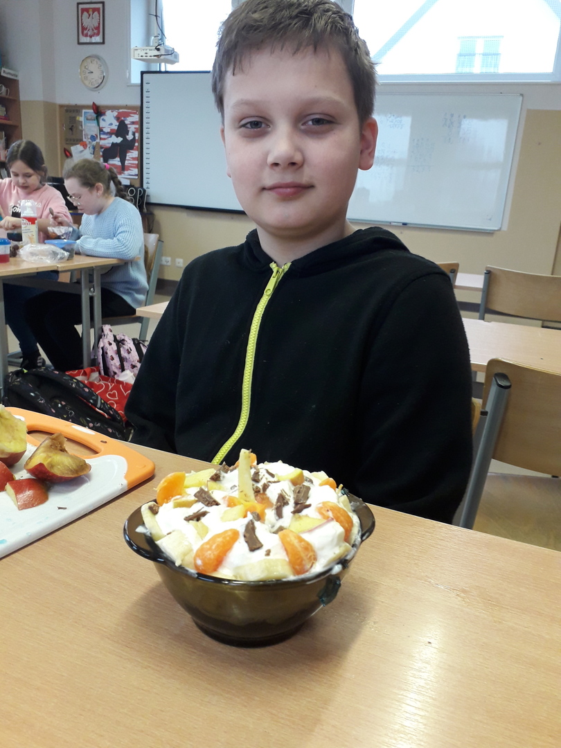W ramach zjęć świetlicowych staramy się rozwijać zainteresowania naszych podopiecznych. W środy dzieci uczestniczą w warsztatach z robotyki, zaś w czwartki rozwijamy nasze pasje kulinarne oraz bawimy się gwarą poznańską. Były już pyszne tortille, hot-dogi, sandwiche czy pizza. Natomiast, w tym tygodniu chętni uczniowie pobawili się w cukierników robiąc przepyszne desery. Poza deserami owocowymi pojawiła się niezliczona ilość galaretki oraz bitej śmietany. Po kalorycznym posiłku czekał nas spacer po okolicy i zabawy na boisku szkolnym.