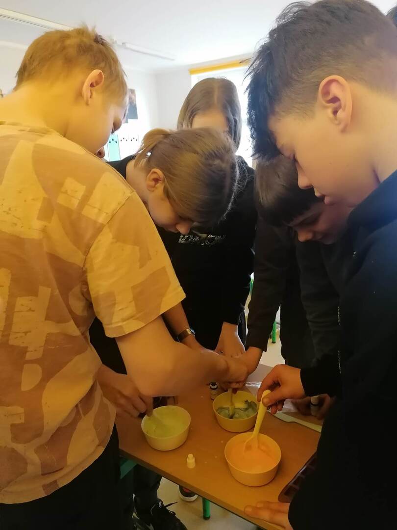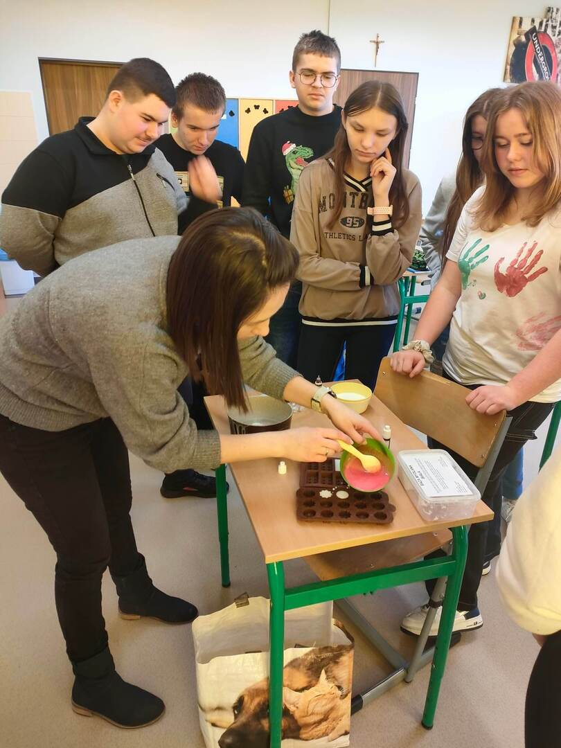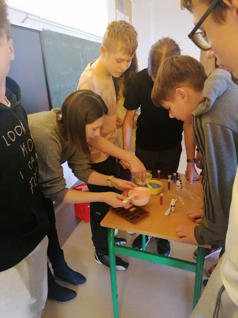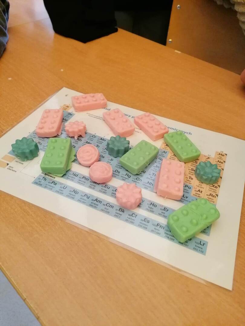 Wykorzystując zestaw atomów udało nam się zbudować model cząsteczki gliceryny.Jednym z zastosowań tego alkoholu polihydroksylowego ze względu na swoje właściwości nawilżające – zatrzymywanie wody, jest wykorzystanie go do produkcji mydeł. Przy użyciu bazy mydlanej glicerynowej, barwników oraz foremek silikonowych wraz z uczniami klasy ósmej wzięliśmy się za produkcję kolorowych mydełek glicerynowych. Oto efekty naszej pracy.