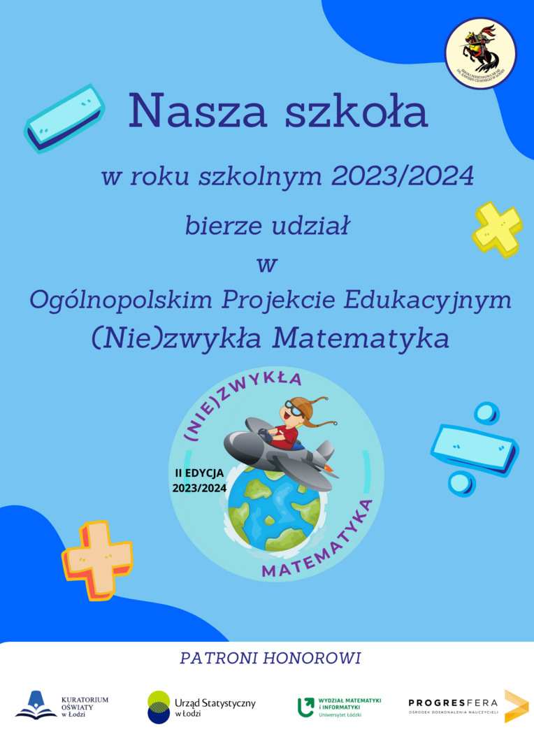 W roku szkolnym 2023/2024 nasza szkoła bierze udział w ogólnopolskim projekcie edukacyjnym „(Nie)zwykła matematyka”. Autorkami są Agnieszka Pabianik oraz Izabela Pietrzak ze Szkoły Podstawowej im. Zawiszy Czarnego w Łodzi. Naszym zadaniem jest realizacja 12 zadań projektowych z 10 różnych modułów.