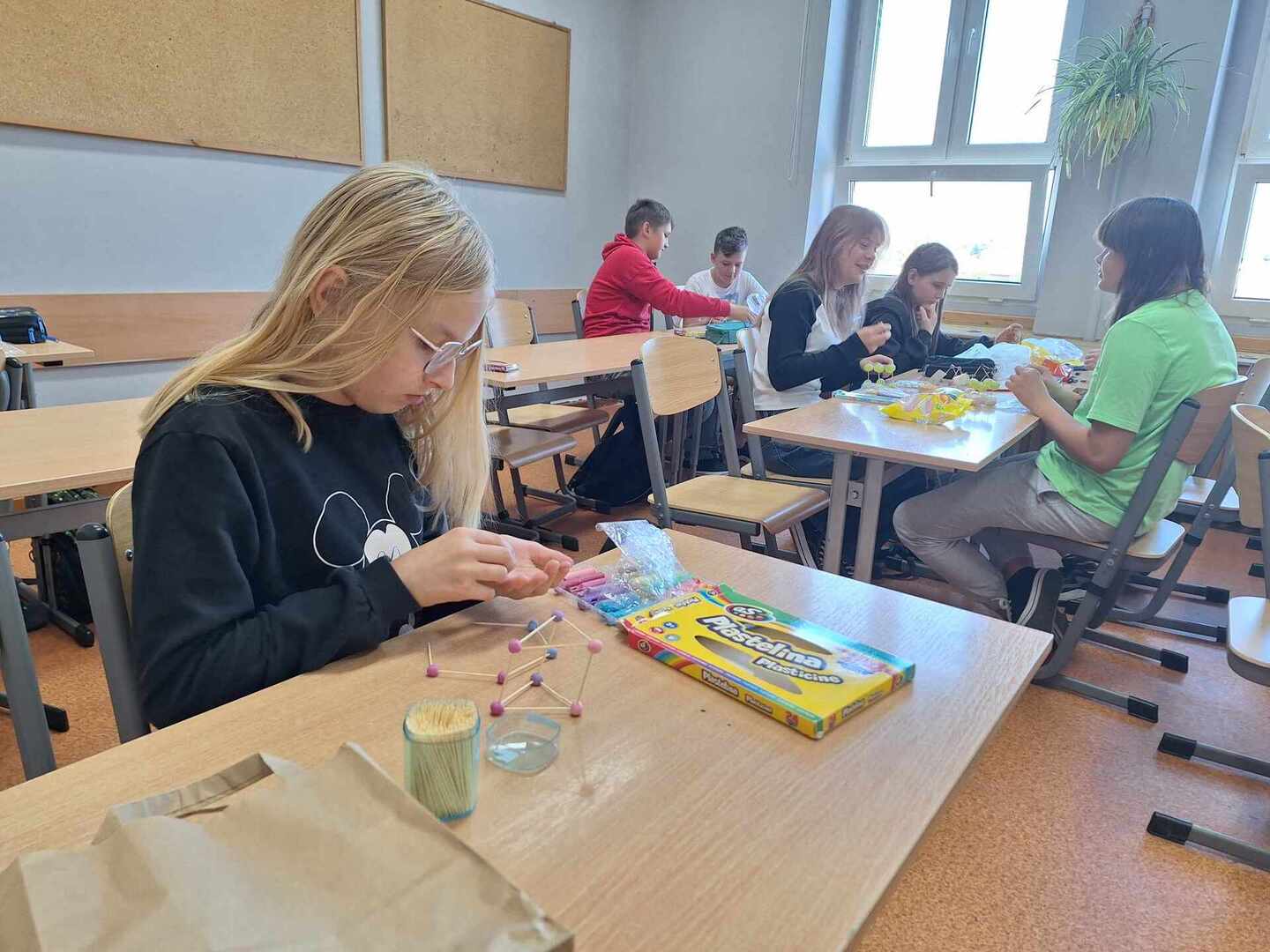 W tym miesiącu z klasą 6 udało nam się zrealizować zadanie 5. Szkieletowe konstrukcje z modułu IV. Zadanie polegało na stworzeniu różnych konstrukcji brył z patyczków/wykałaczek/paluszków oraz pianek/winogron/plasteliny.