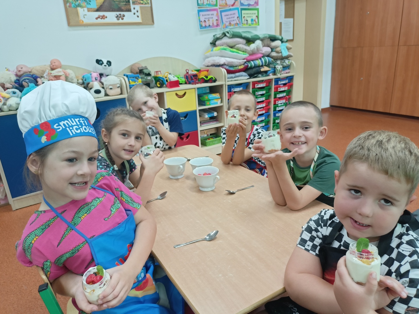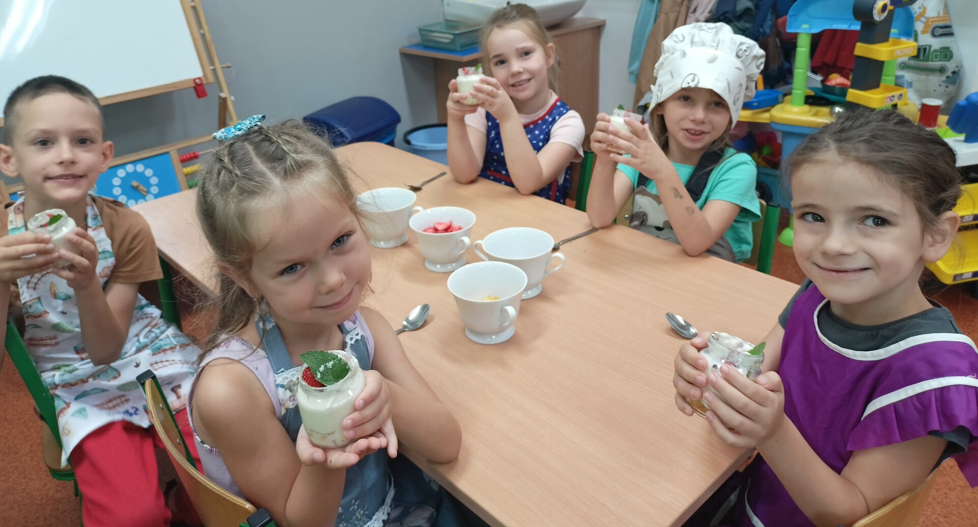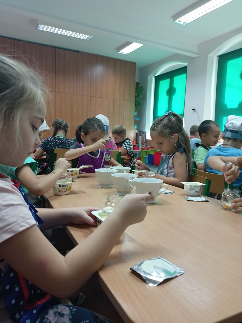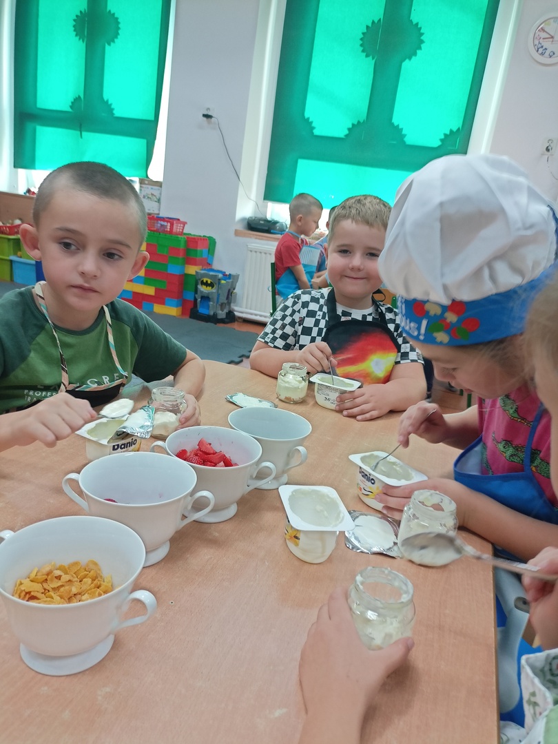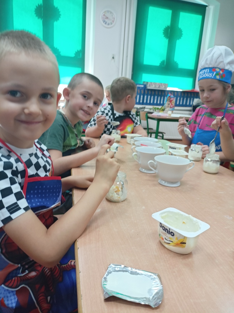 W tym roku szkolnym w naszym przedszkolu grupa 6-latków realizuje projekt kulinarny „Kuchcikowo”. W zeszłym tygodniu zaczęliśmy od zdrowych deserków. Oprócz serka danio wśród składników znalazły się płatki kukurydziane, truskawki, borówki, malinki i liście świeżej mięty. Po chwili po deserkach nie było śladu…Zapraszamy do albumu J
