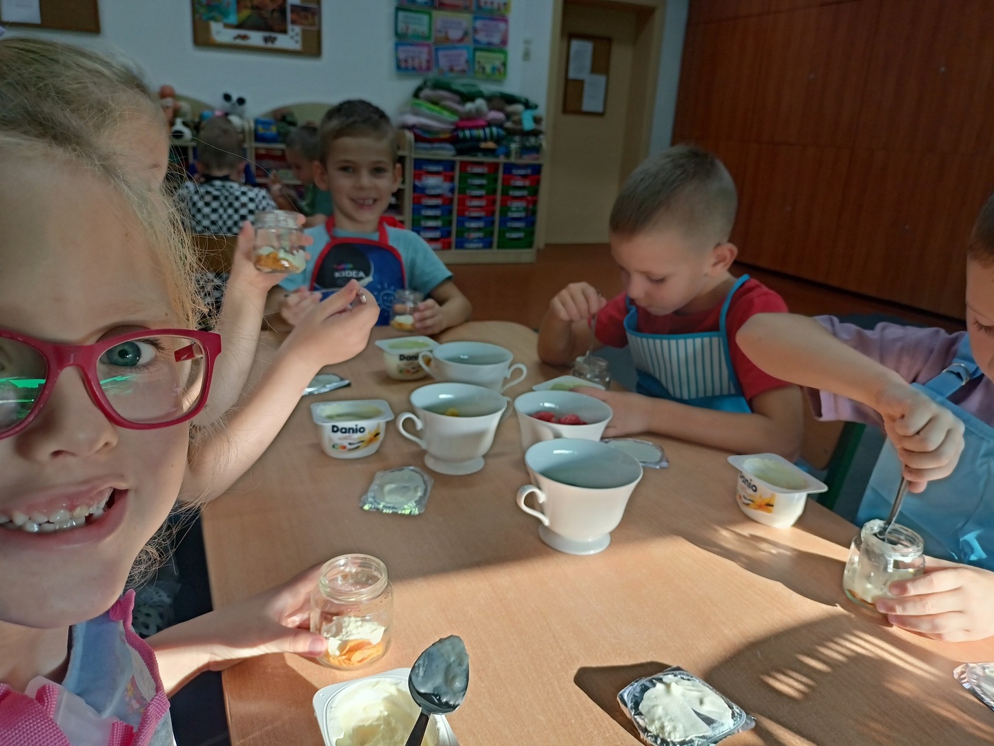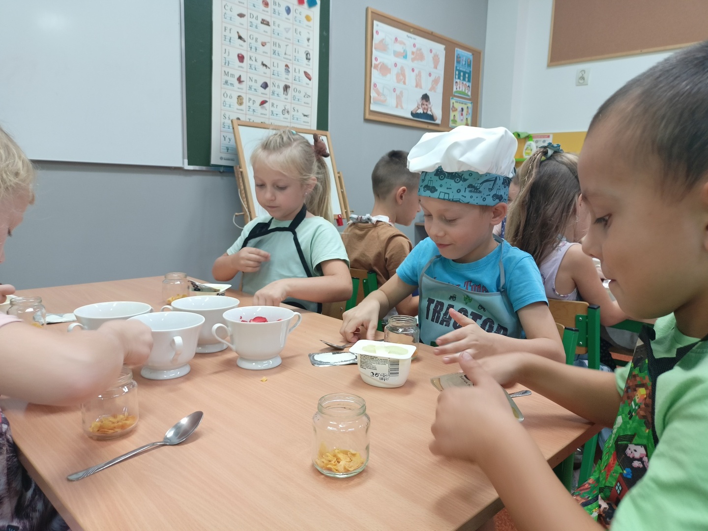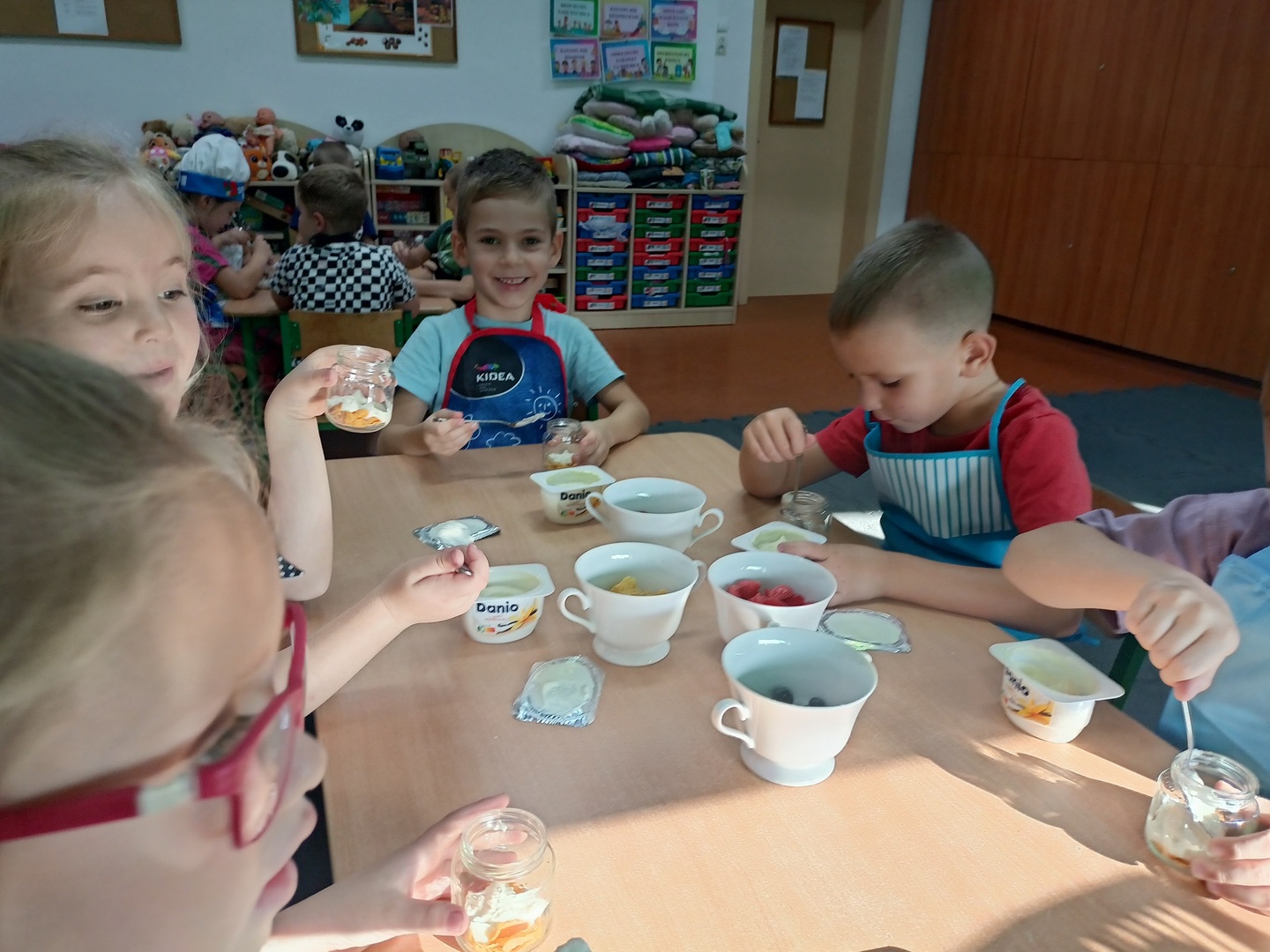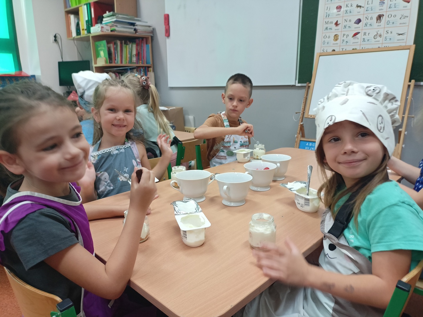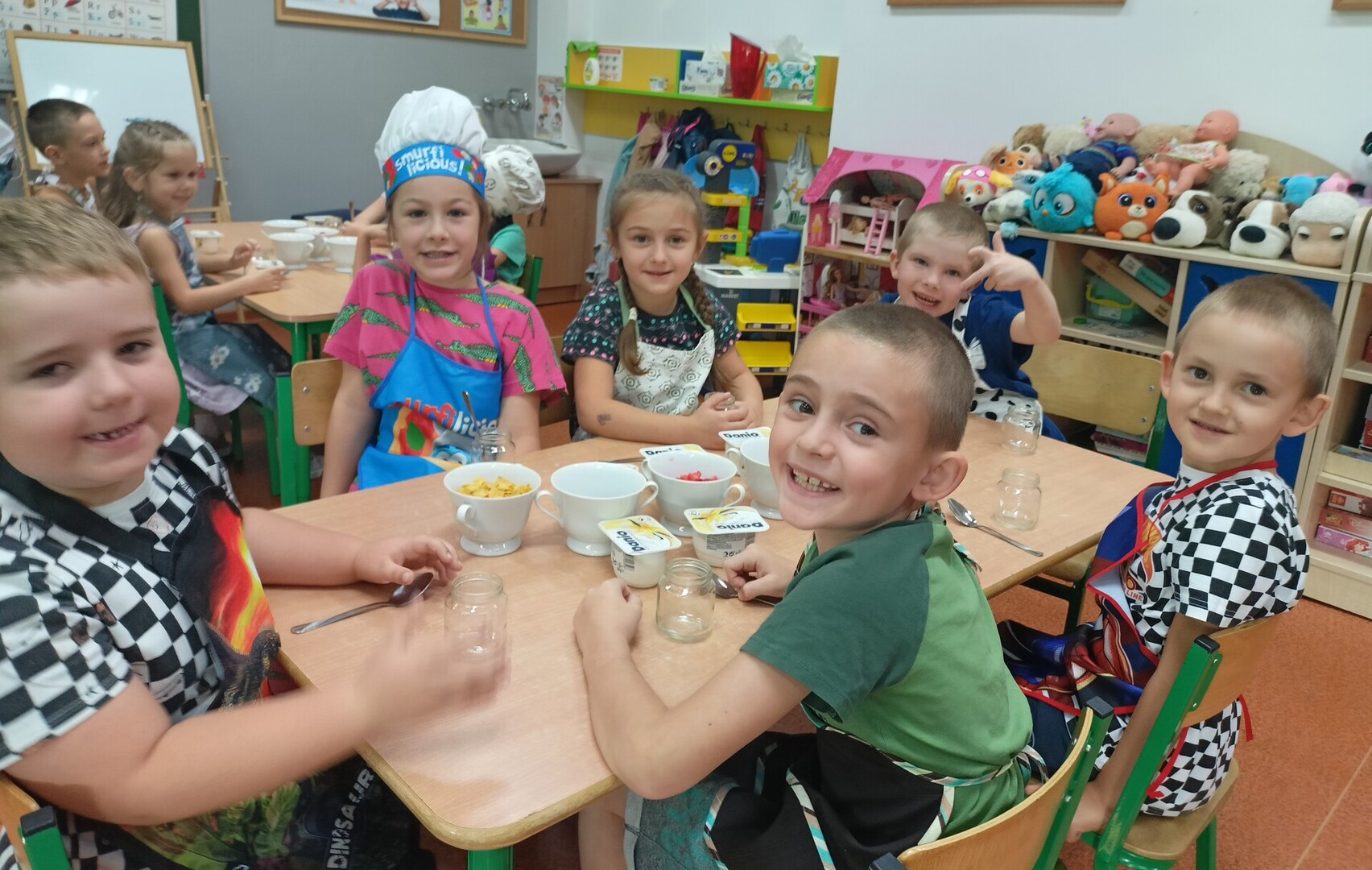 W tym roku szkolnym w naszym przedszkolu grupa 6-latków realizuje projekt kulinarny „Kuchcikowo”. W zeszłym tygodniu zaczęliśmy od zdrowych deserków. Oprócz serka danio wśród składników znalazły się płatki kukurydziane, truskawki, borówki, malinki i liście świeżej mięty. Po chwili po deserkach nie było śladu…Zapraszamy do albumu J