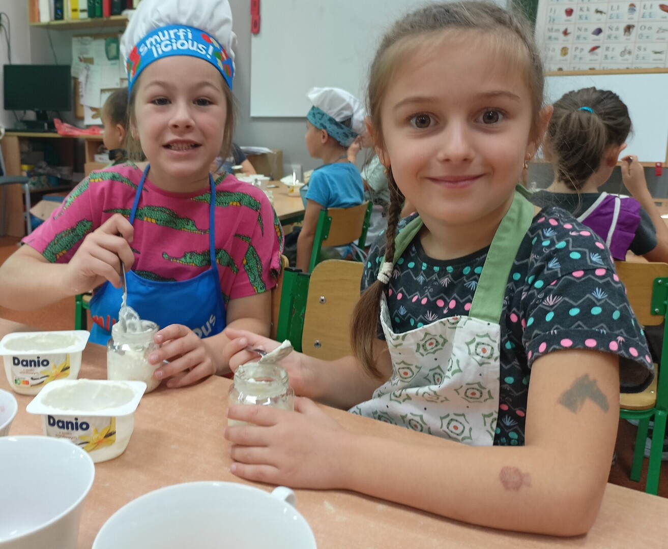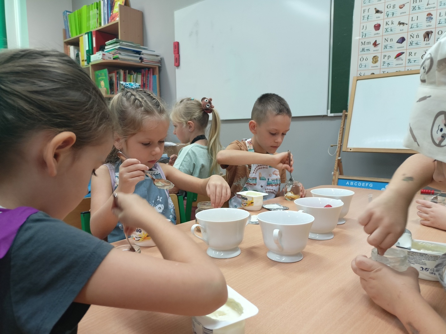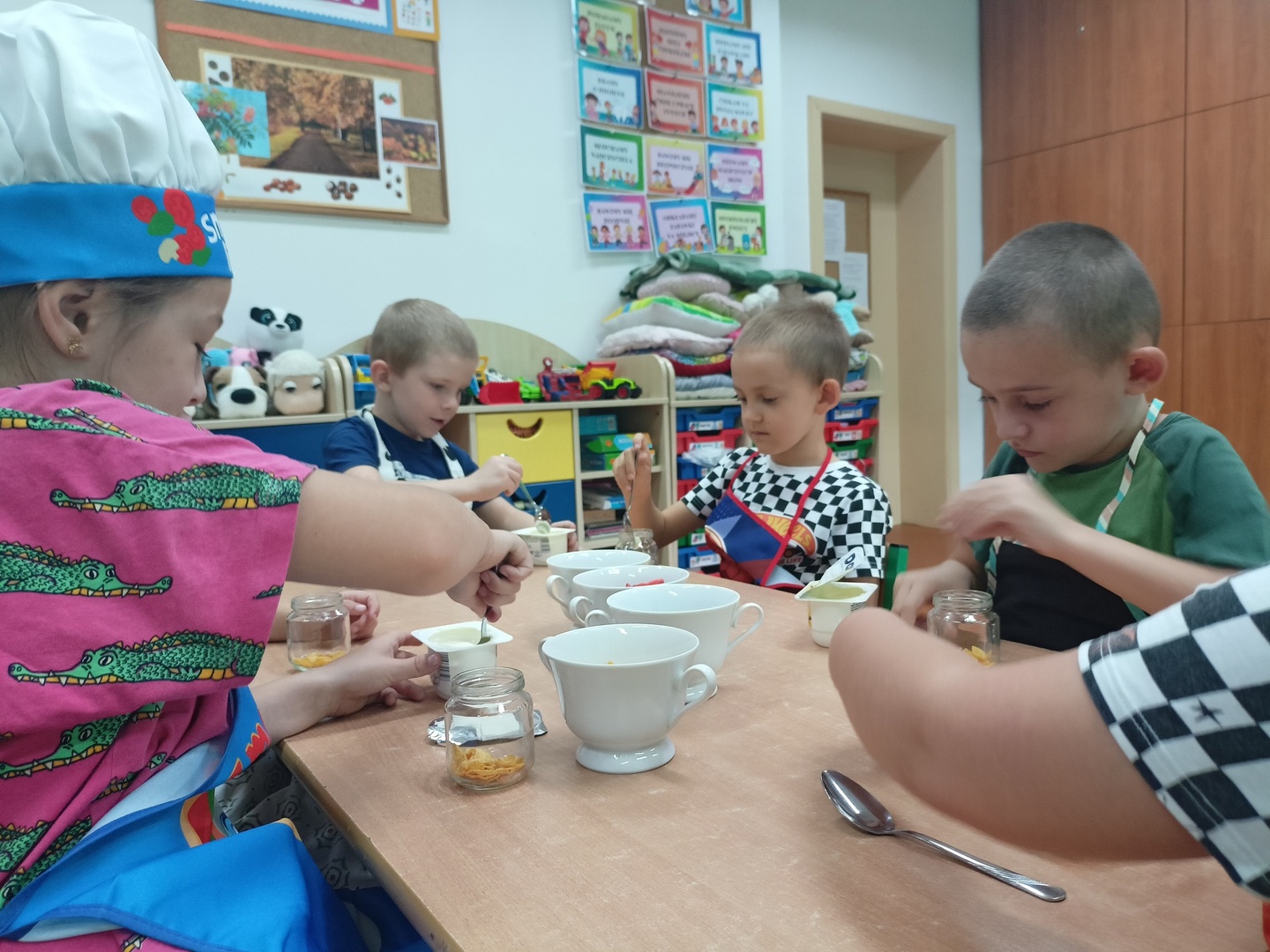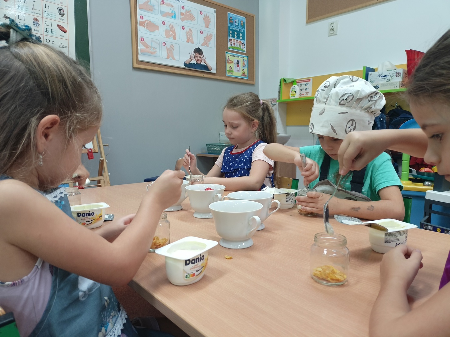 W tym roku szkolnym w naszym przedszkolu grupa 6-latków realizuje projekt kulinarny „Kuchcikowo”. W zeszłym tygodniu zaczęliśmy od zdrowych deserków. Oprócz serka danio wśród składników znalazły się płatki kukurydziane, truskawki, borówki, malinki i liście świeżej mięty. Po chwili po deserkach nie było śladu…Zapraszamy do albumu J