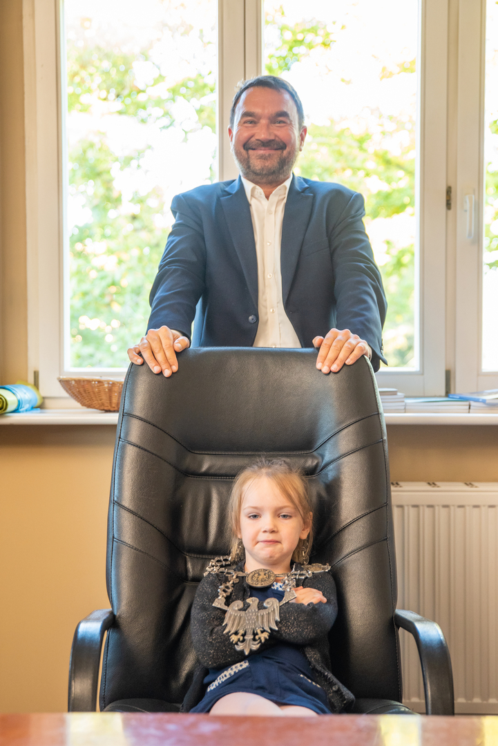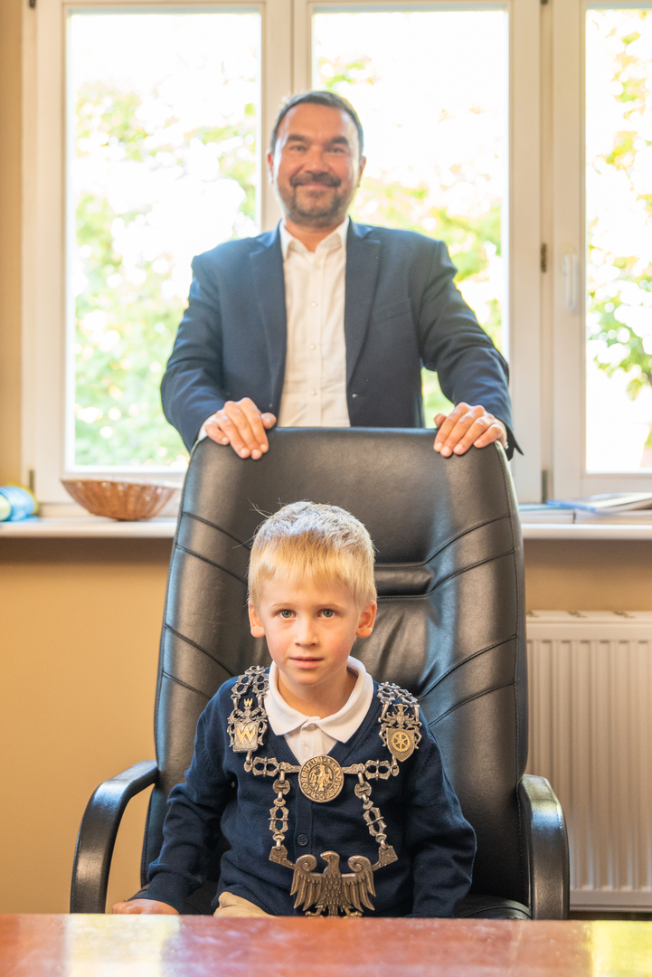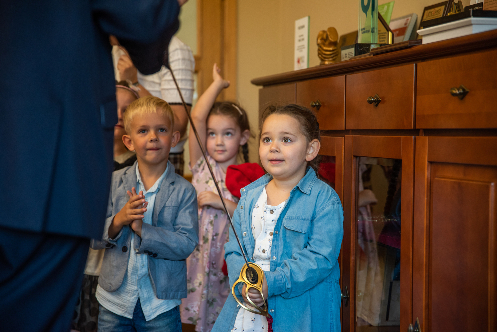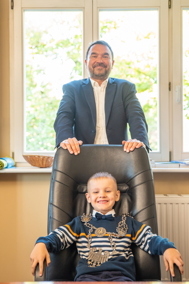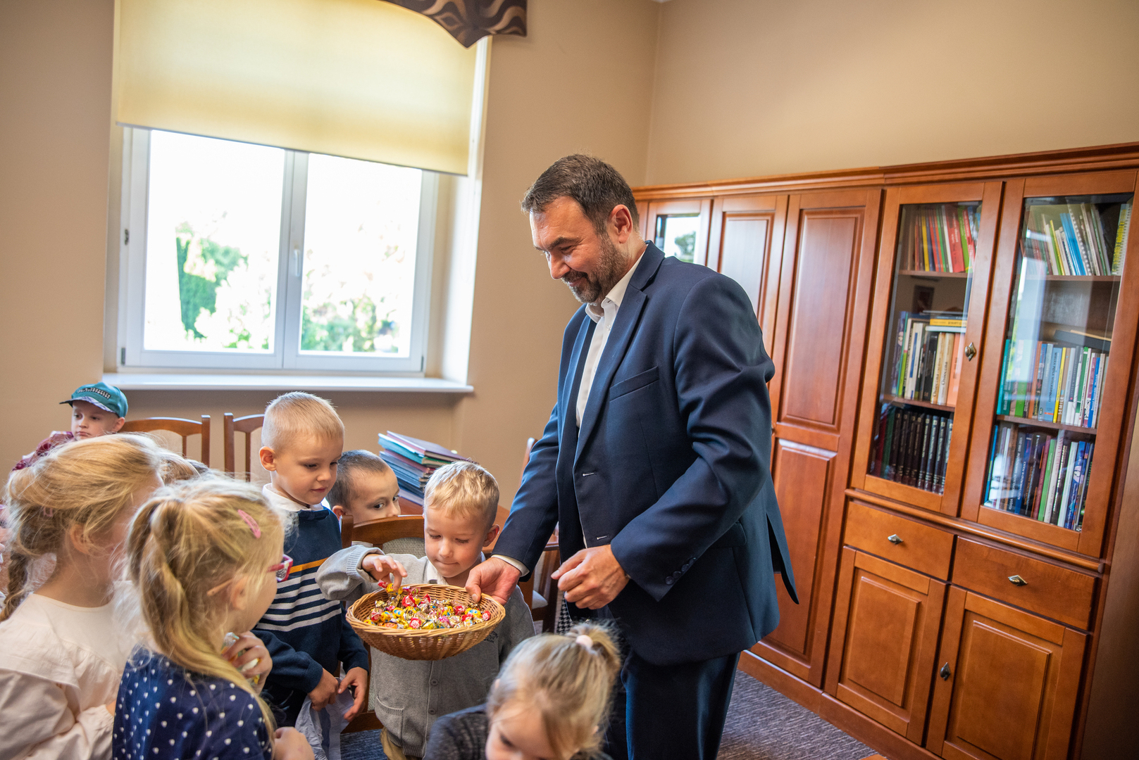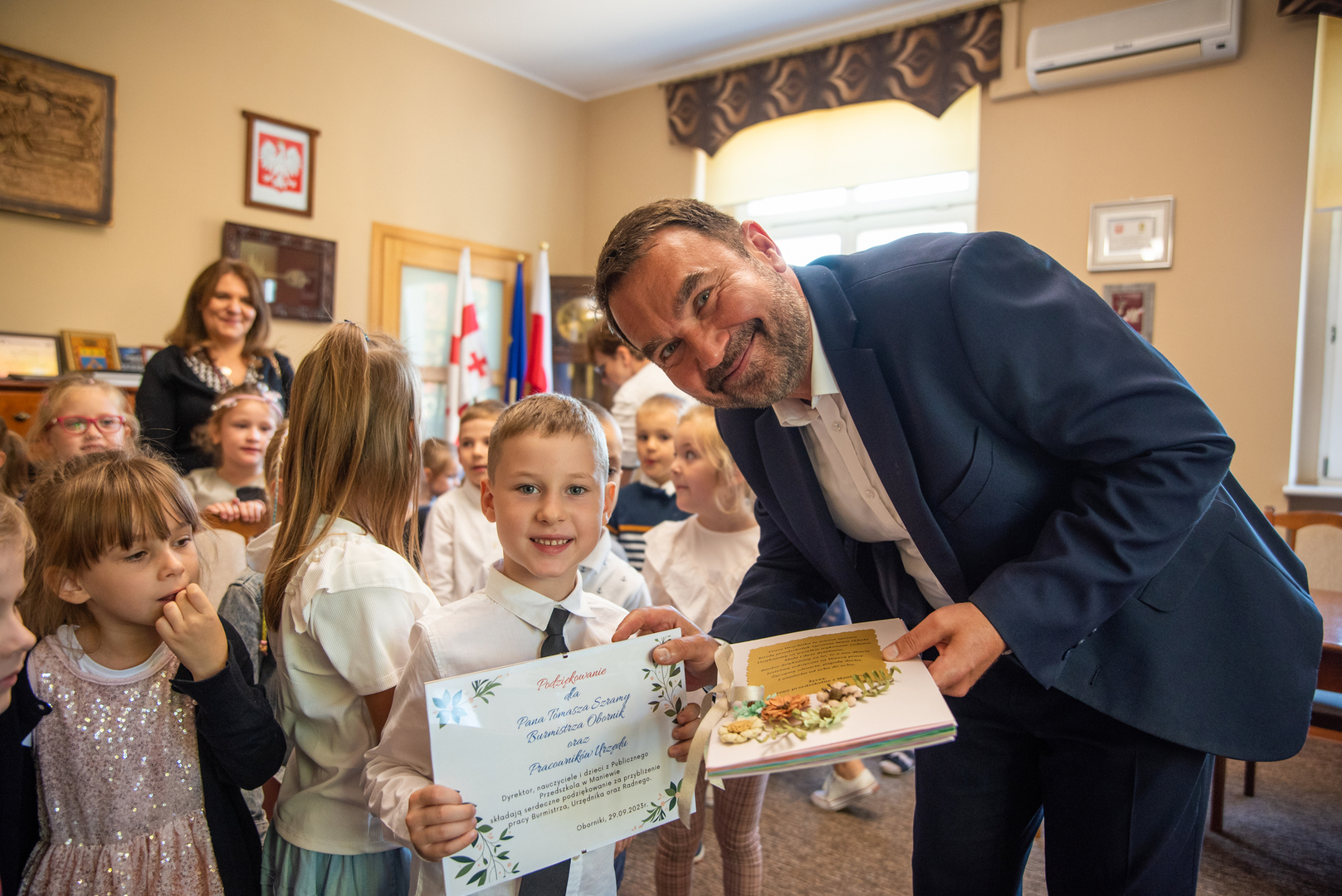 Dnia 29 września grupa 5 i 6 –latków wybrała się na spotkanie z Burmistrzem Miasta i Gminy Obornik –Tomaszem Szramą. Pan burmistrz i pracownicy urzędu przywitali nas z wielką radością i uśmiechem na twarzy. Przedszkolaki poznały gminny budynek oraz specyfikę pracy urzędników. Największym przeżyciem dla dzieci była wizyta w gabinecie pana burmistrza, gdzie każdy mógł zasiąść w fotelu włodarza miasta. Przedszkolaki z wielką uwagą i zainteresowaniem rozglądały się po pięknym gabinecie i szeptem wymieniały swoje spostrzeżenia. Na zakończenie miłego spotkania dzieci zostały poczęstowane cukierkami i wręczyły własnoręcznie wykonane rysunki oraz upominki.