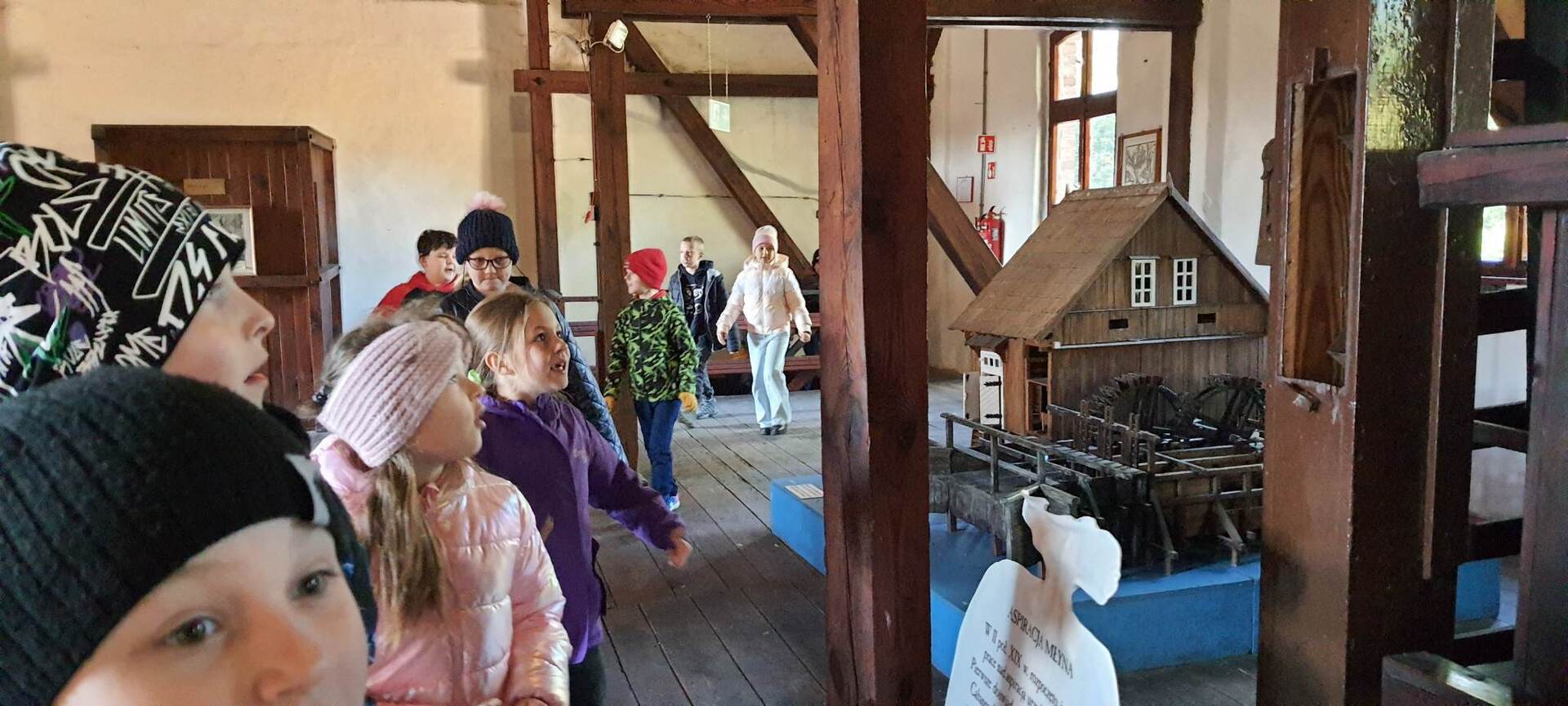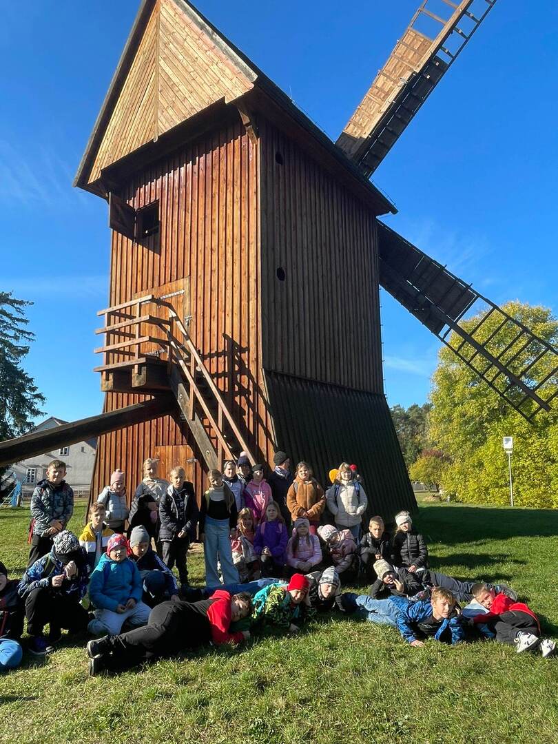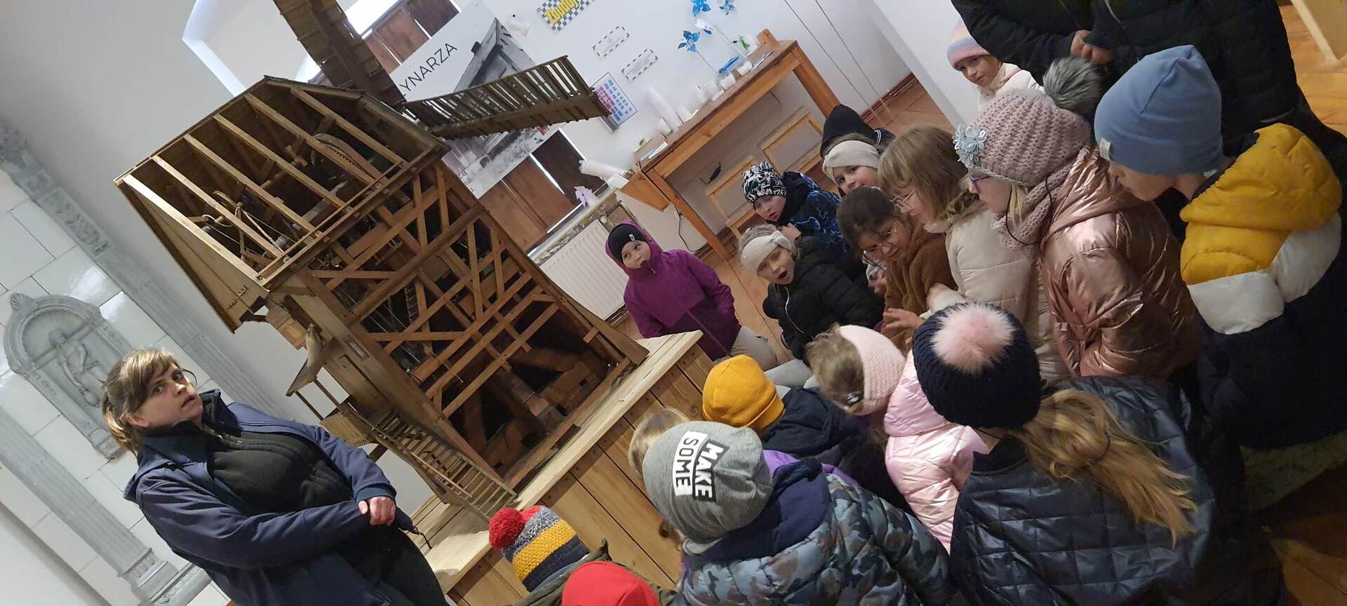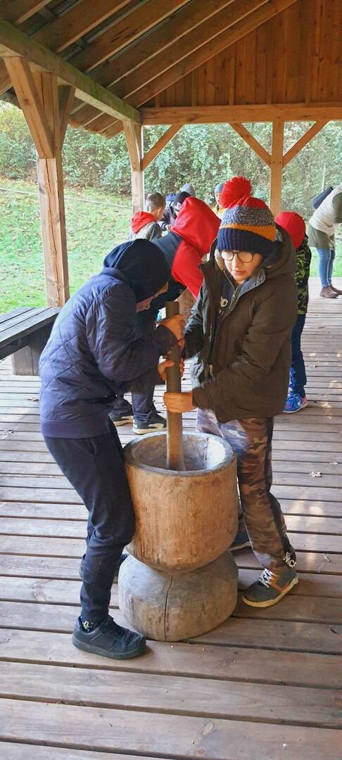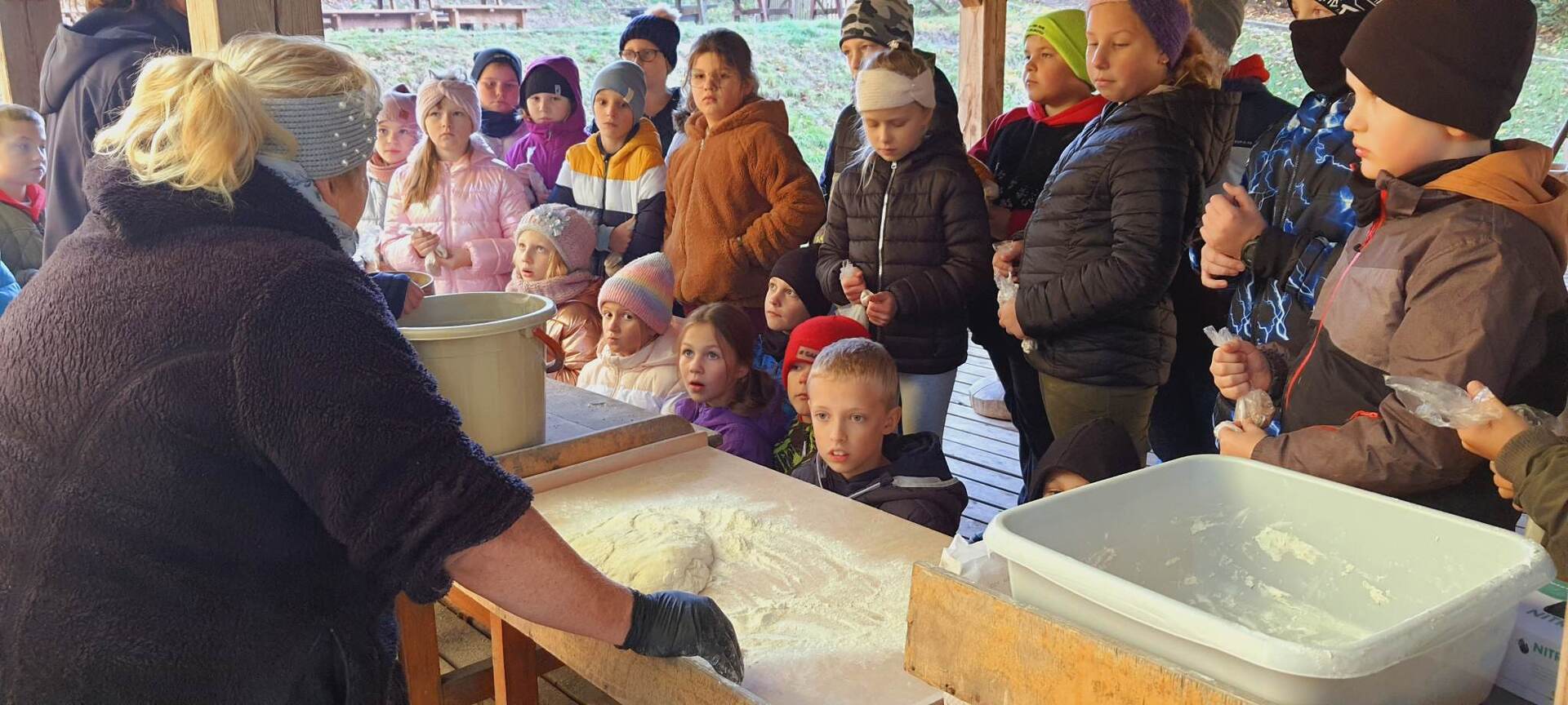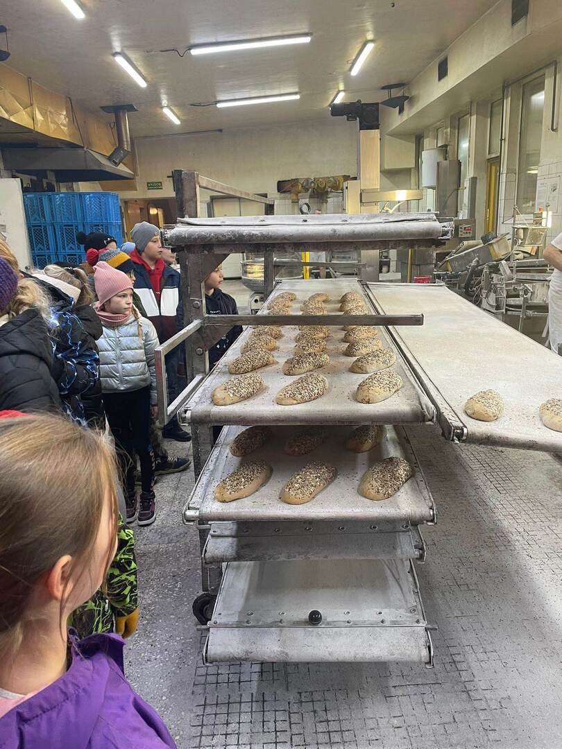 Pierszym jej punktem było odwiedzenie "Piekarni pod rogalem", która mieści się w Obornikach. Poznaliśmy firmę, która codziennie, nieprzerwanie rozpoczyna swą pracę od bardzo wczesnych godzin, kiedy my jeszcze smacznie śpimy po to, aby na naszych stołach już od samego rana zawitały świeże wypieki. Mieliśmy możliwość poznania sposobów wypieku chleba i bułek od początku, gdy dobieramy składniki, aż do samego końca, kiedy to wypieki jeszcze gorące wydostają się z wielkich pieców. Na koniec poczęstowani zostaliśmy cieplutkimi bułkami i słodkimi wypiekami. Dalszą podróż odbyliśmy do Muzeum Młynarstwa i Urządzeń Wodnych w w Jaraczu. Cofnęliśmy się tam sporo w czasie. Poznaliśmy sprzęty, dzięki którym w dawnych czasach ludzie pozyskiwali mąkę. Po otrzymaniu mąki z ziaren wyrobiliśmy ciasto i upiekliśmy je w najprawdziwszym piecu chlebowym - wyglądał pysznie! Zwiedziliśmy urządzenia, które w dawnych czasach odpowiadały za przetwarzanie ziaren na mąkę dzięki siłom natury - wiatru i wody - czyli wiatraki i młyny. Mimo zimnej pogody - ciepłe wypieki pomogły nam w tym dniu spędzić wspaniałą wycieczkę. Szczególne podziękowania dla pana Jasia i pani Ani - z piekarni i muzeum, którzy w tym dniu sprawili, że wycieczka stała się dla nas niesamowitym przeżyciem.